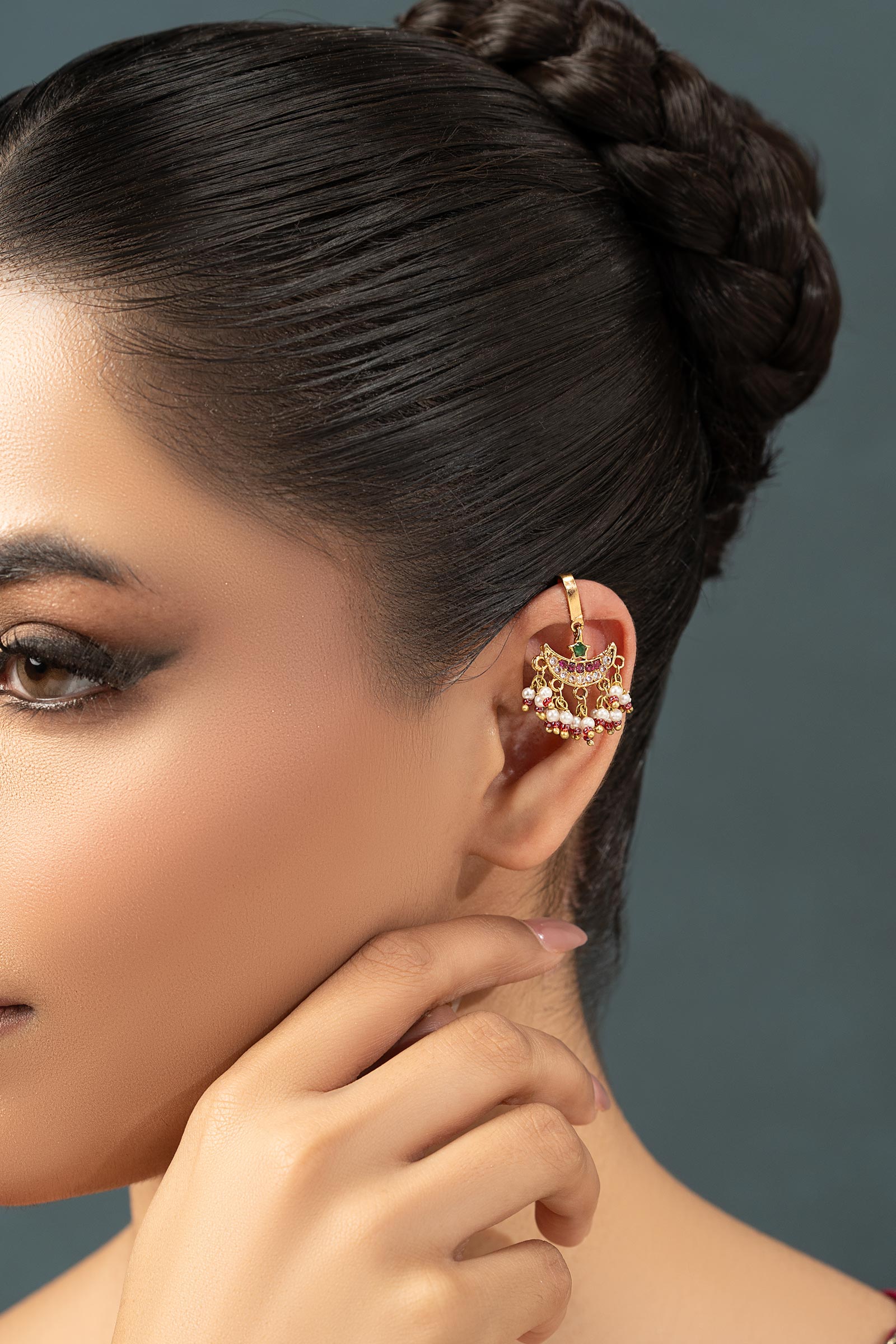 A timeless celebration of desi craftsmanship, these classic bugadi stud earrings feature delicate chand sitara motif adorned with soft pink chatham, rich green onyx, and sparkling white zircon. Finished with pearl piroi and playful pink poth accents, they radiate elevated elegance - bringing a touch of regal charm and festive grace to every look. Composition: 21K Gold Plated Back Pin: Fish Hook Care Instructions: Wipe Clean