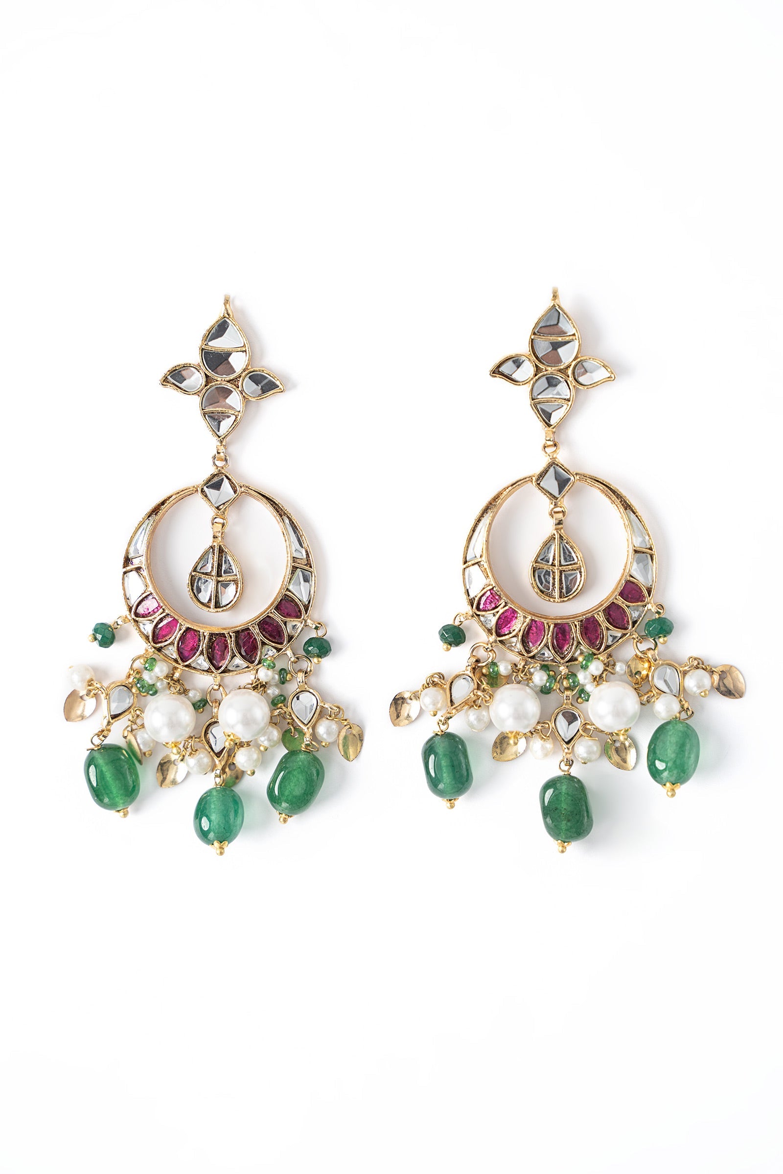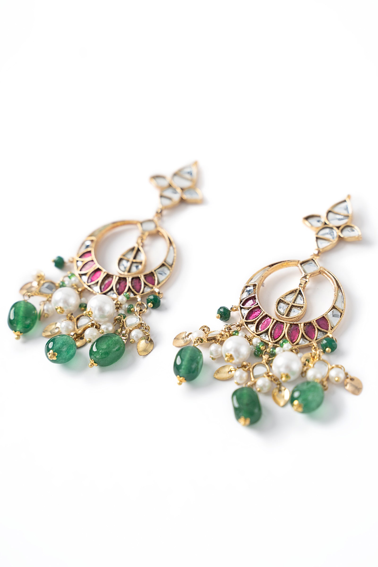 Inspired by classic novelty, our Malika Bridal Set is a masterpiece of intricate craftsmanship. The elaborate detailing of handcut glass stones with pink chatham, white pearls, and metal leaves pyroi brings a touch of heritage and devotion to your wedding outfit. The hanging green onyx finishing offers a regal touch, allowing you to shine on your big day.Finish: 21K Gold PlatedBack Pin: Sterling Silver StudProduct Care: Wipe Clean