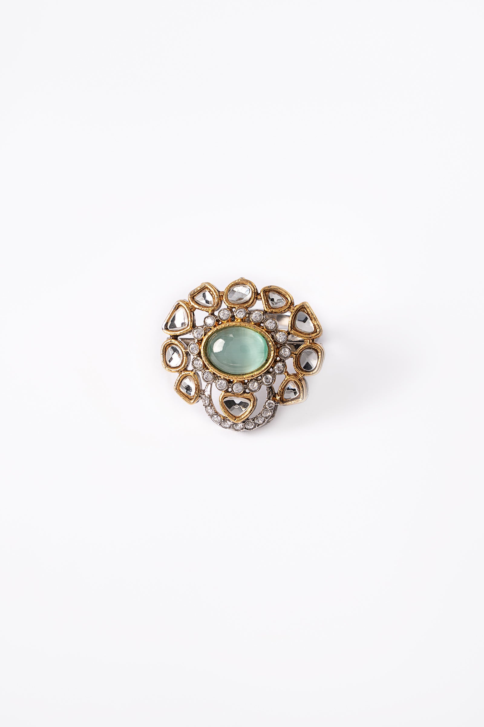 Our stunning Sultana Bridal Set is a special addition to our heritage. Intricately curated with handcut glass stones with mint cats eye and white zircons, it features an elegant yet modern design that makes it ideal for your big day look. It has a necklace, earrings, and a ring.Finish: Gangajamni (21K Gold & Silver Plated)Back Pin: Sterling Silver StudRing Size: AdjustableProduct Care: Wipe Clean