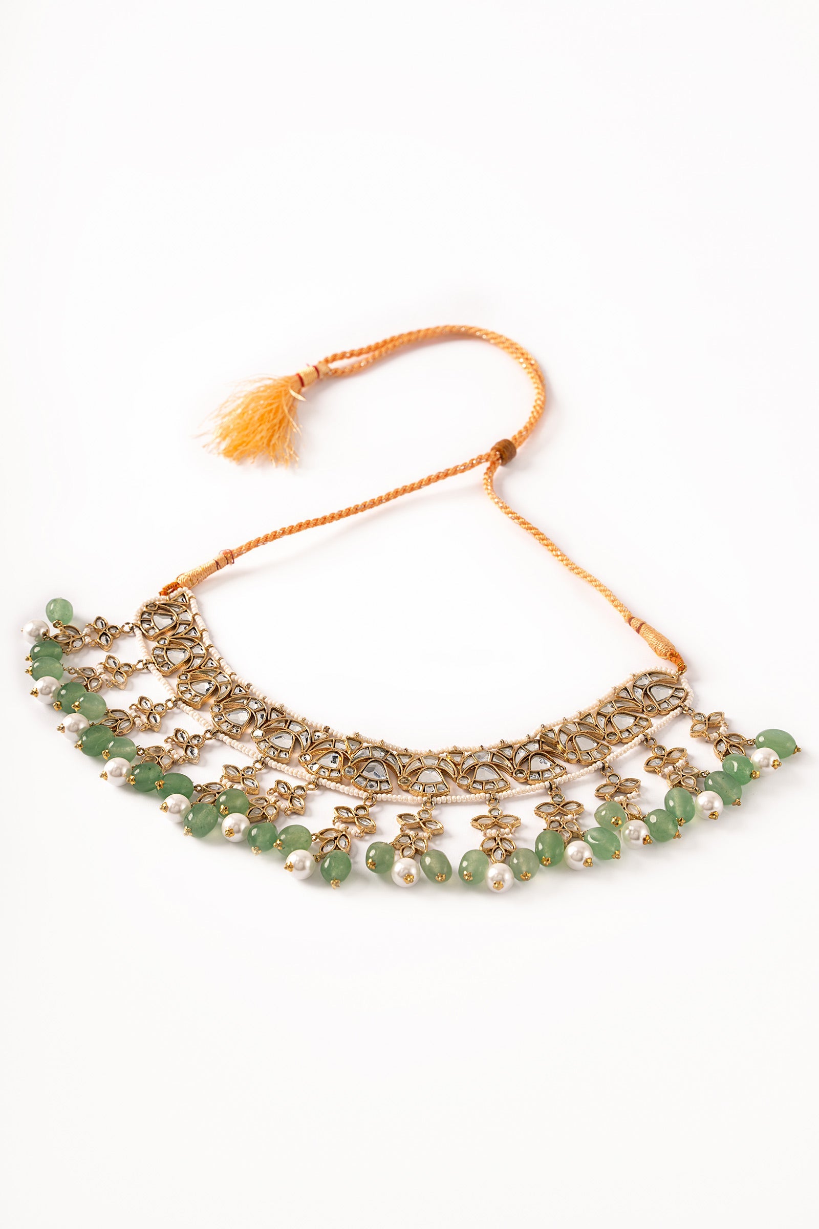 Give yourself a queenly look with our Gauhar Bridal Set. Crafted meticulously from handcut glass stones with white pearls pyroi, and jade green hanging, this masterpiece includes a majestic necklace and a pair of earrings, making it perfect for a regal look. Finish: 21K Gold Plated Back Pin: Sterling Silver Stud Product Care: Wipe Clean