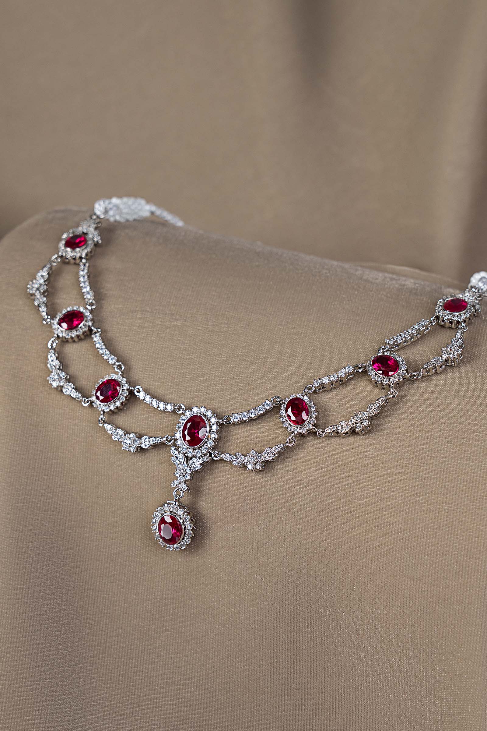 A vision of modern glamour, this necklace set glimmers with cascading white zircon artistry, catching light with every movement. At the center, radiant pink rhodolites pulse like a bold heartbeat, adding depth, drama, and allure. Finished with dori-tie, edgy yet poetic, it is crafted for the muse who thrives in the spotlight - where contemporary design meets unapologetic elegance. Composition: Silver Earrings Back Pin: Sterling Silver Stud Care Instructions: Wipe Clean