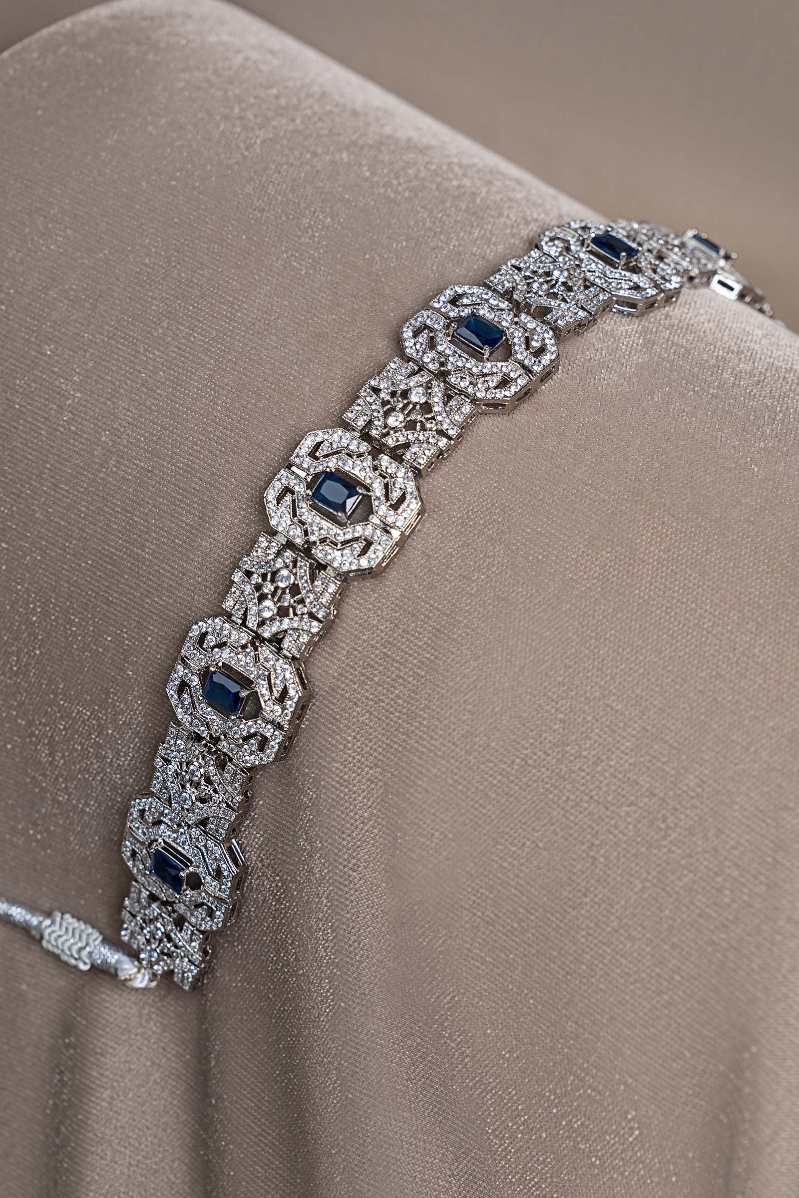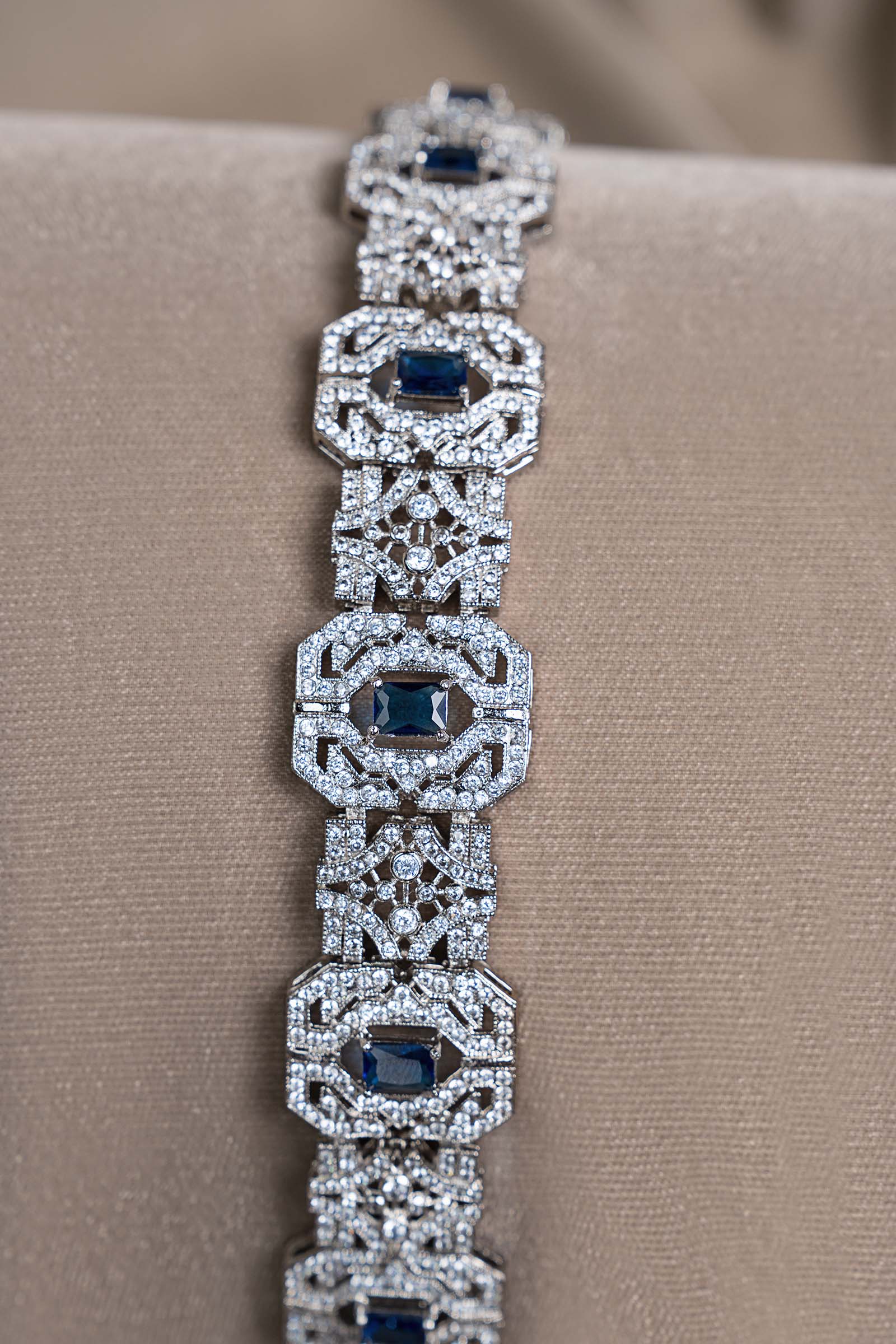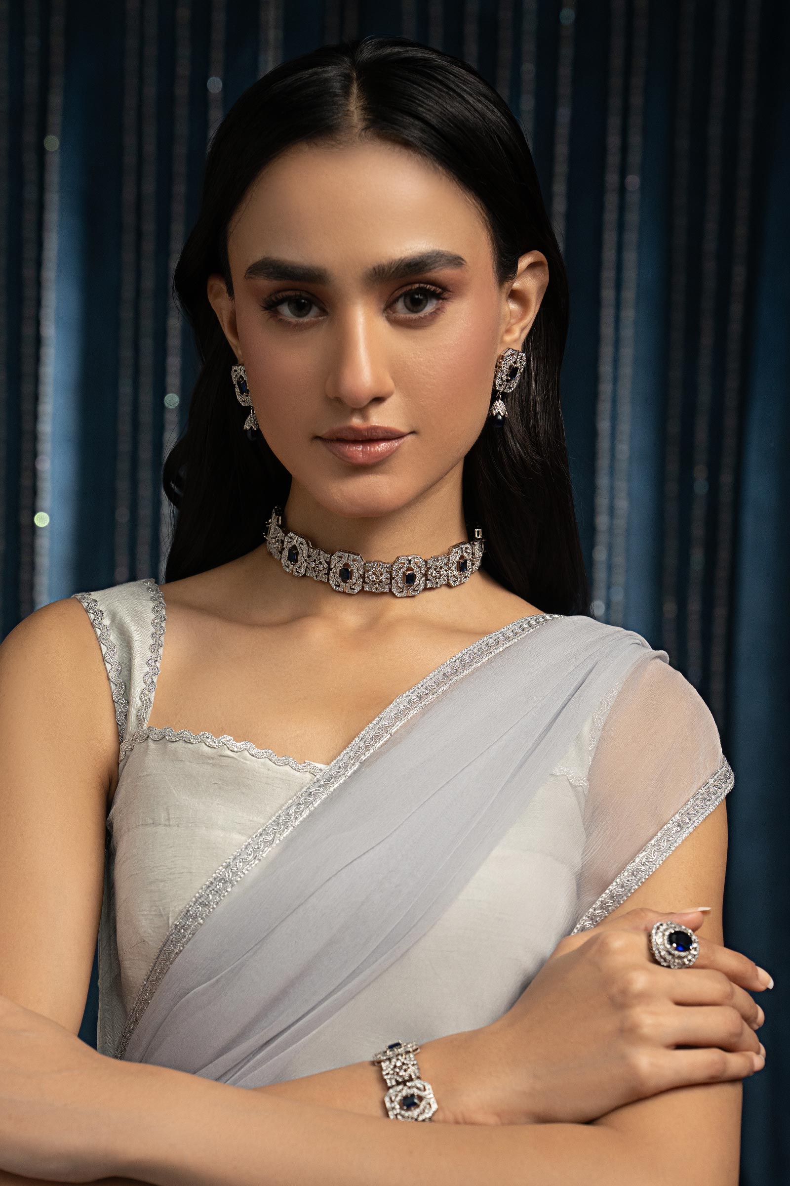 A cascade of sophistication and timeless allure, this modern necklace set shimmers with sculptural clusters of glistening white zircons, radiating bold elegance with glistening sapphire blue in center. Bold blue stones descend in striking hangings, adding depth, drama, and edge to the design. Finished with a sleek dori-tie, it is crafted for the modern muse - where poetic movement meets high-glam impact for an ultimate statement look. Composition: Silver Earrings Back Pin: Sterling Silver Stud Care Instructions: Wipe Clean