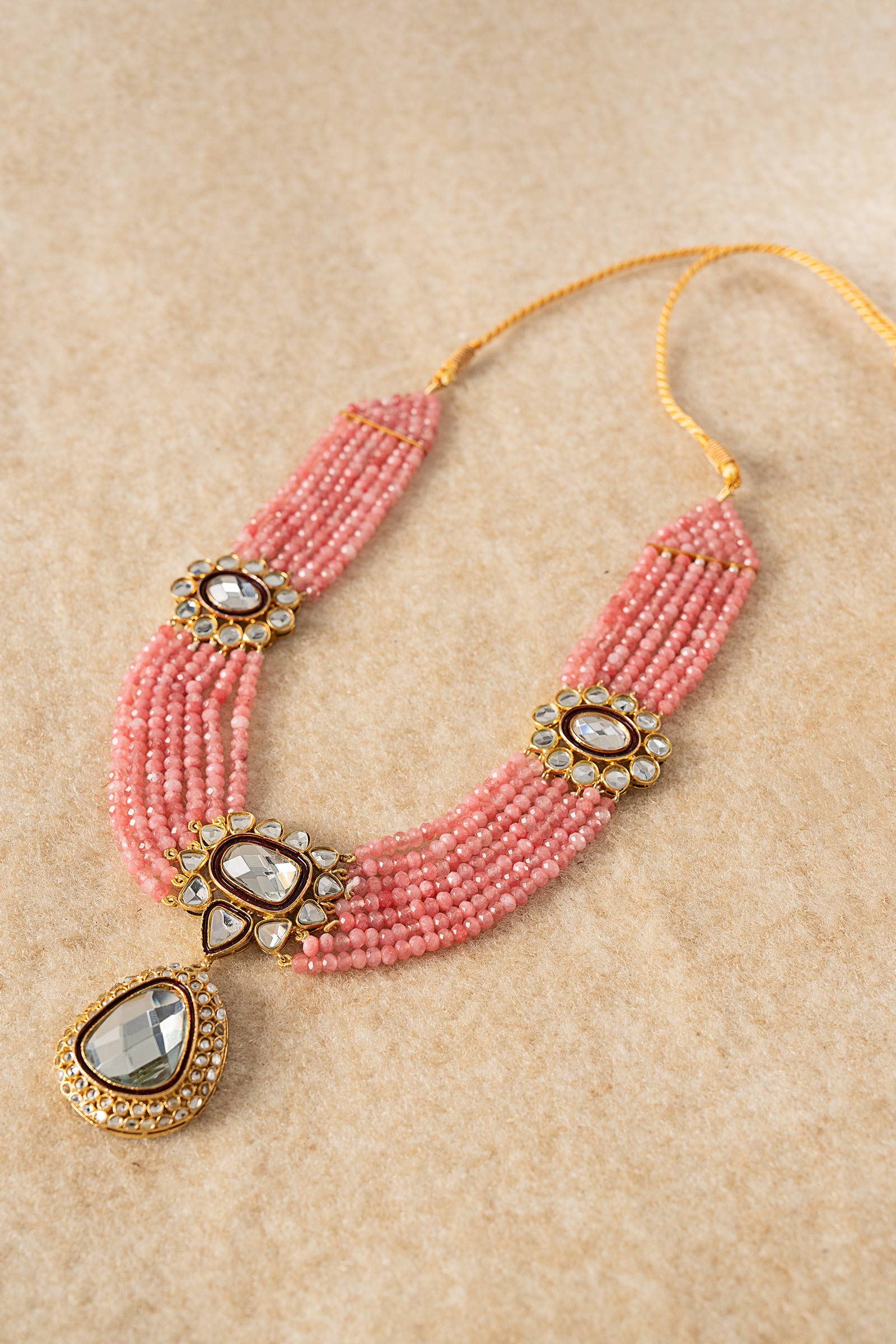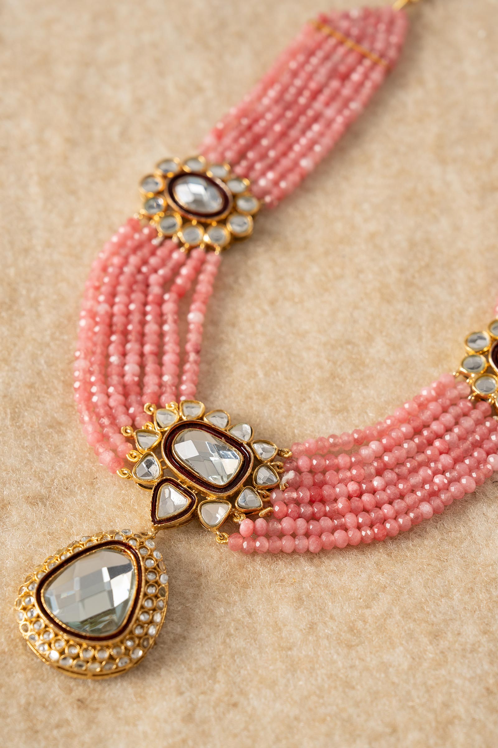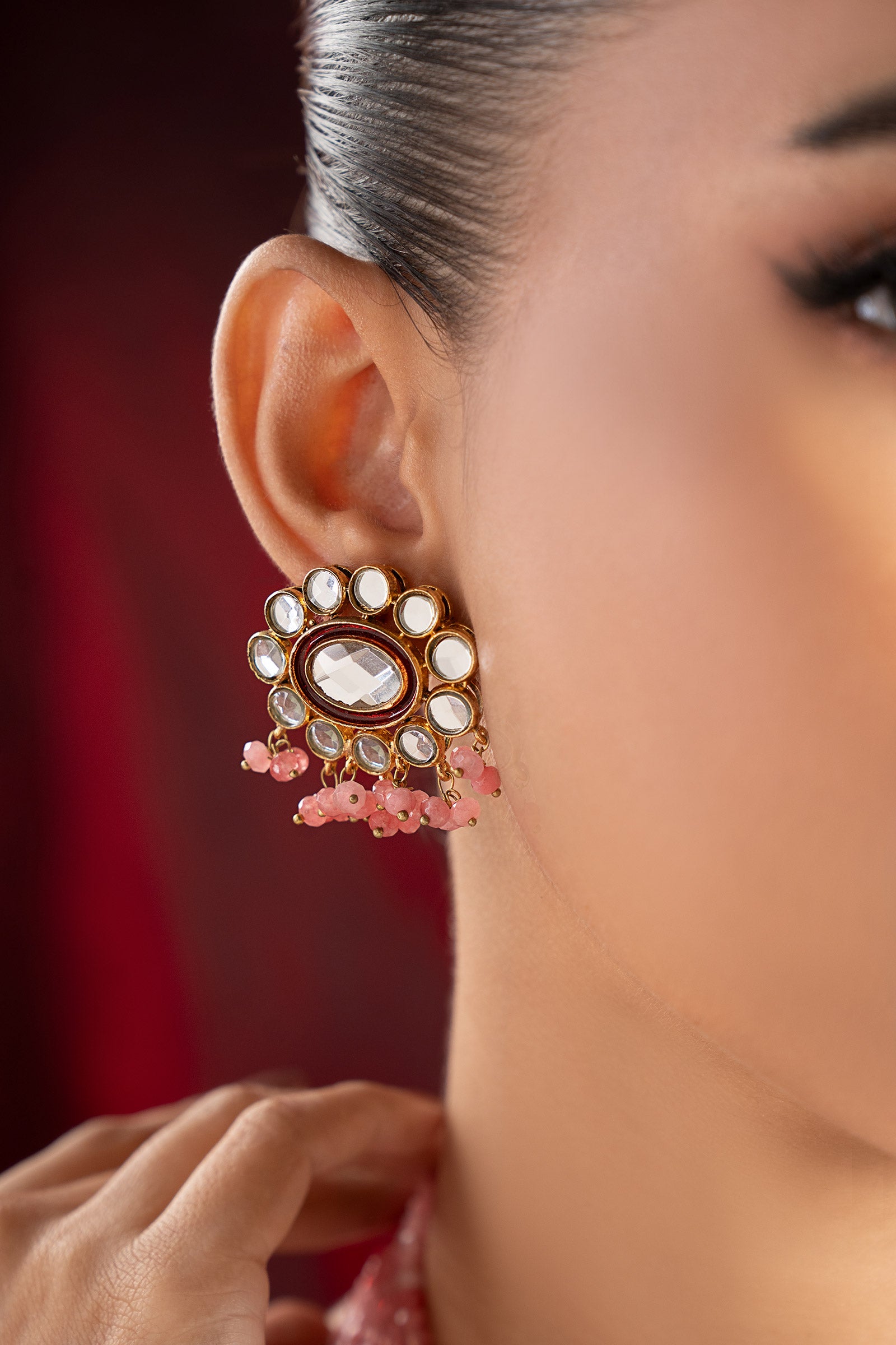 This lovely 2PC necklace and earrings combination combines the delicate blush of light pink onyx with the immaculate shine of white handcut glass in a charming fusion of tradition and color. It is a poetic homage to tradition, designed to add timeless charm to your celebrations, and it is accentuated with vivid red enamel, capturing the essence of festive joy and timeless elegance. Finish: 21K Gold Plated Back Pin: Sterling Silver Stud Product Care: Wipe Clean