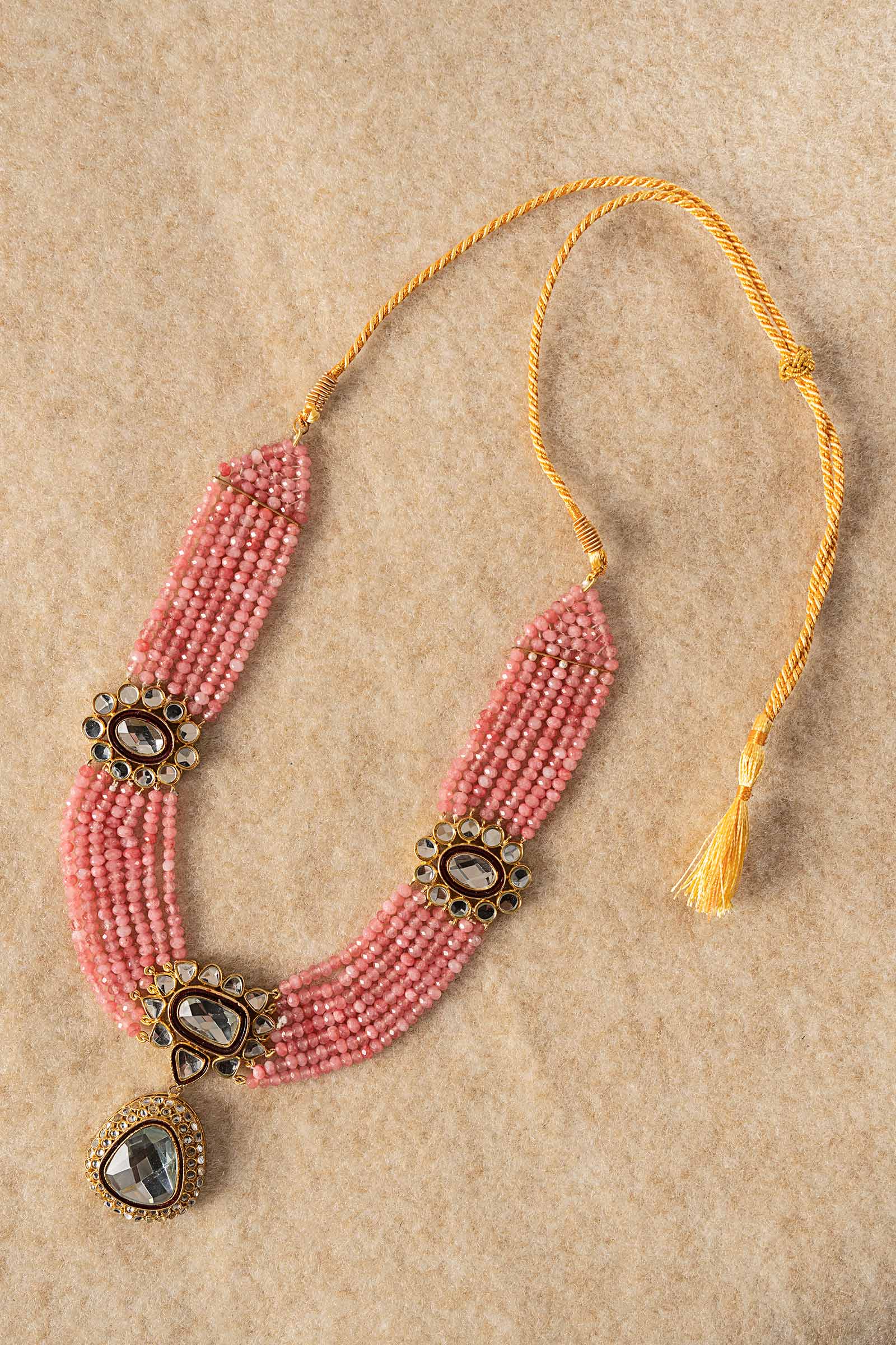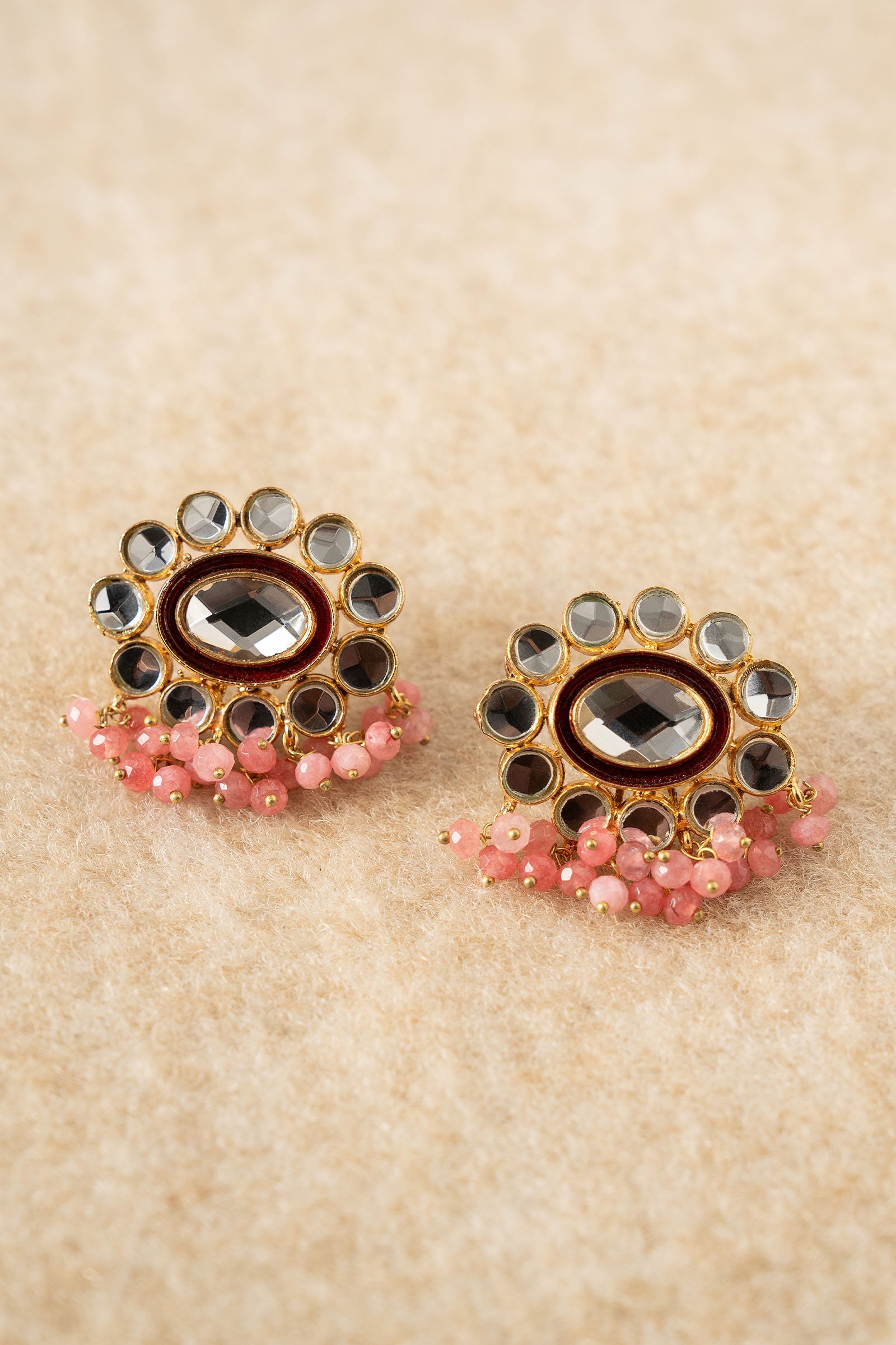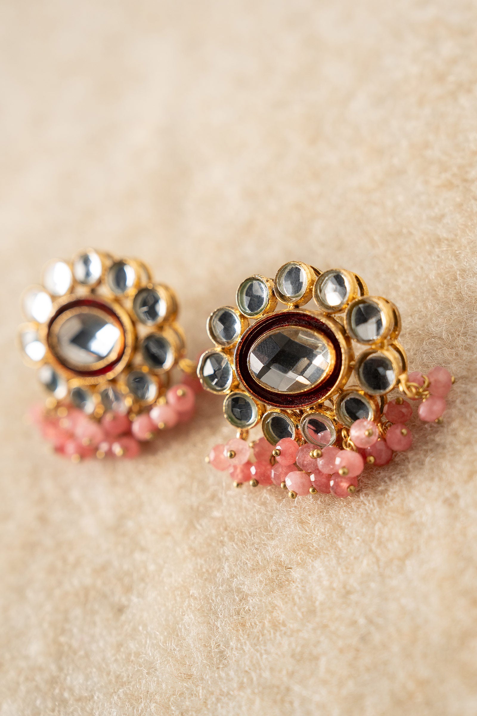 This lovely 2PC necklace and earrings combination combines the delicate blush of light pink onyx with the immaculate shine of white handcut glass in a charming fusion of tradition and color. It is a poetic homage to tradition, designed to add timeless charm to your celebrations, and it is accentuated with vivid red enamel, capturing the essence of festive joy and timeless elegance. Finish: 21K Gold Plated Back Pin: Sterling Silver Stud Product Care: Wipe Clean