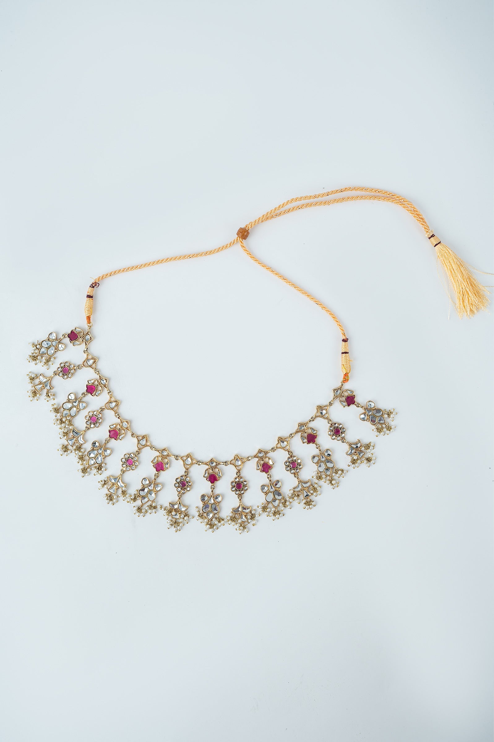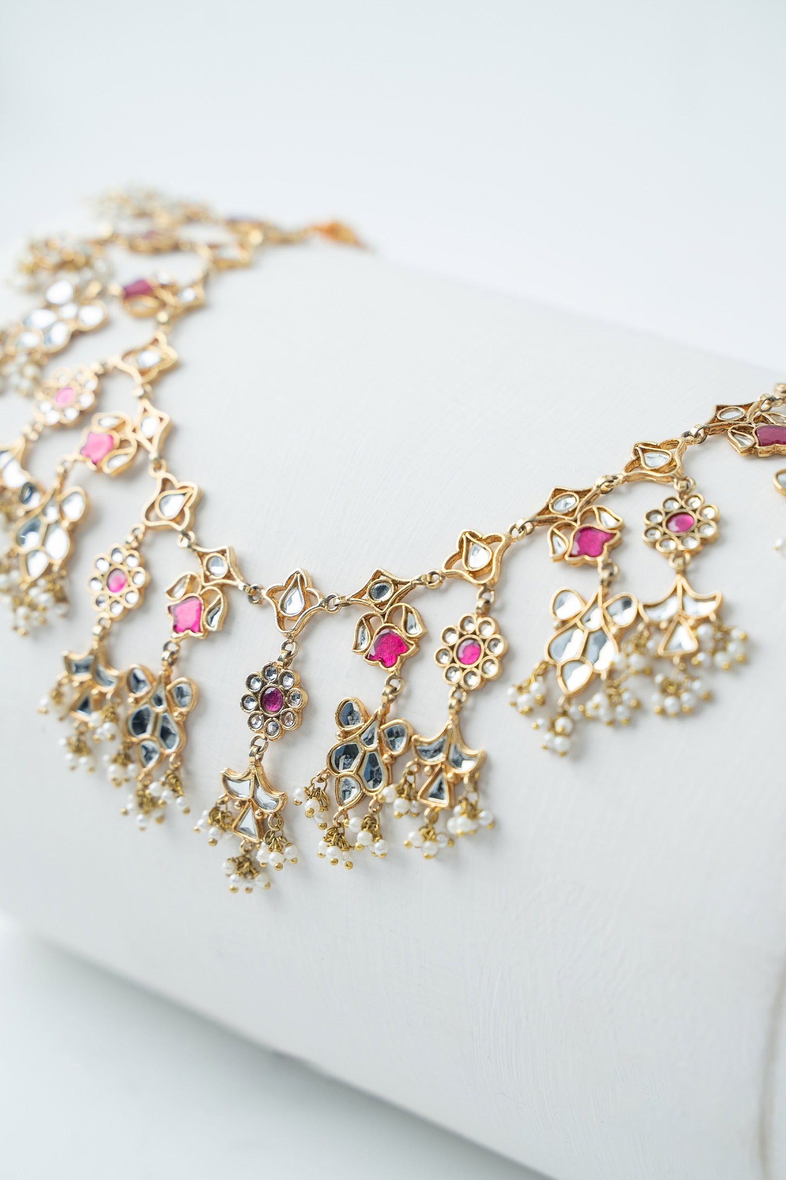 This charming 2Pc necklace and earring set, which is surrounded by the soothing tones of tradition, blends the classic brilliance of white handcut glass with the delicate blush of pink chatham. A timeless celebration of festive grace and ageless beauty, it tells a beautiful tale of elegance and legacy while adorned with delicate white pearl pyroi. Finish: 21K Gold Plated Back Pin: Sterling Silver Stud Product Care: Wipe Clean