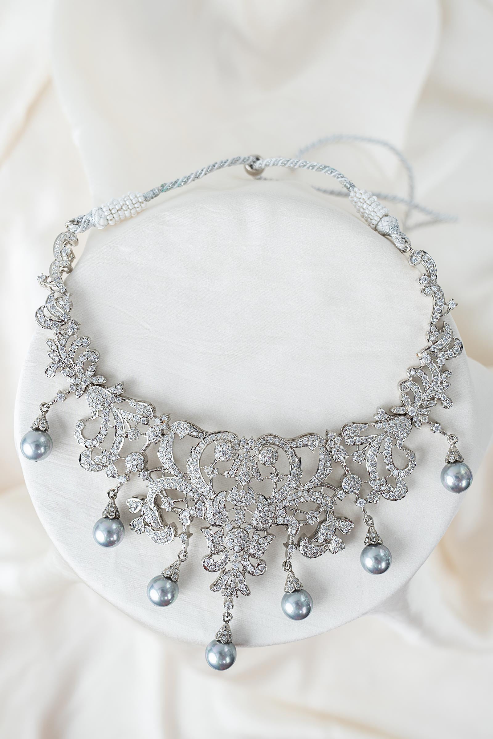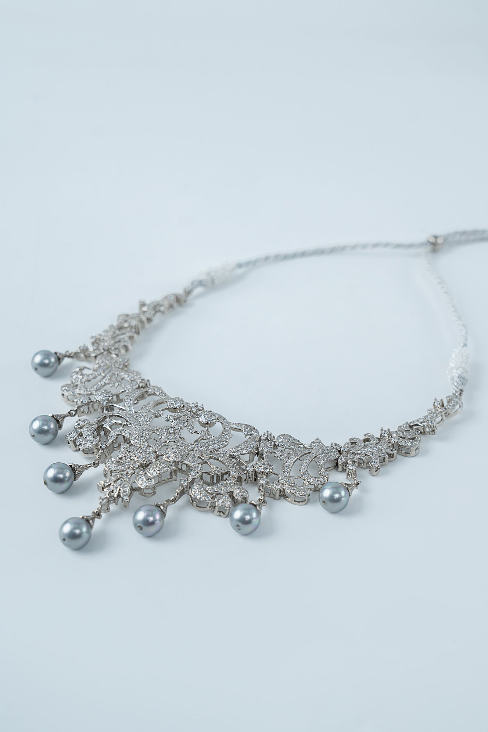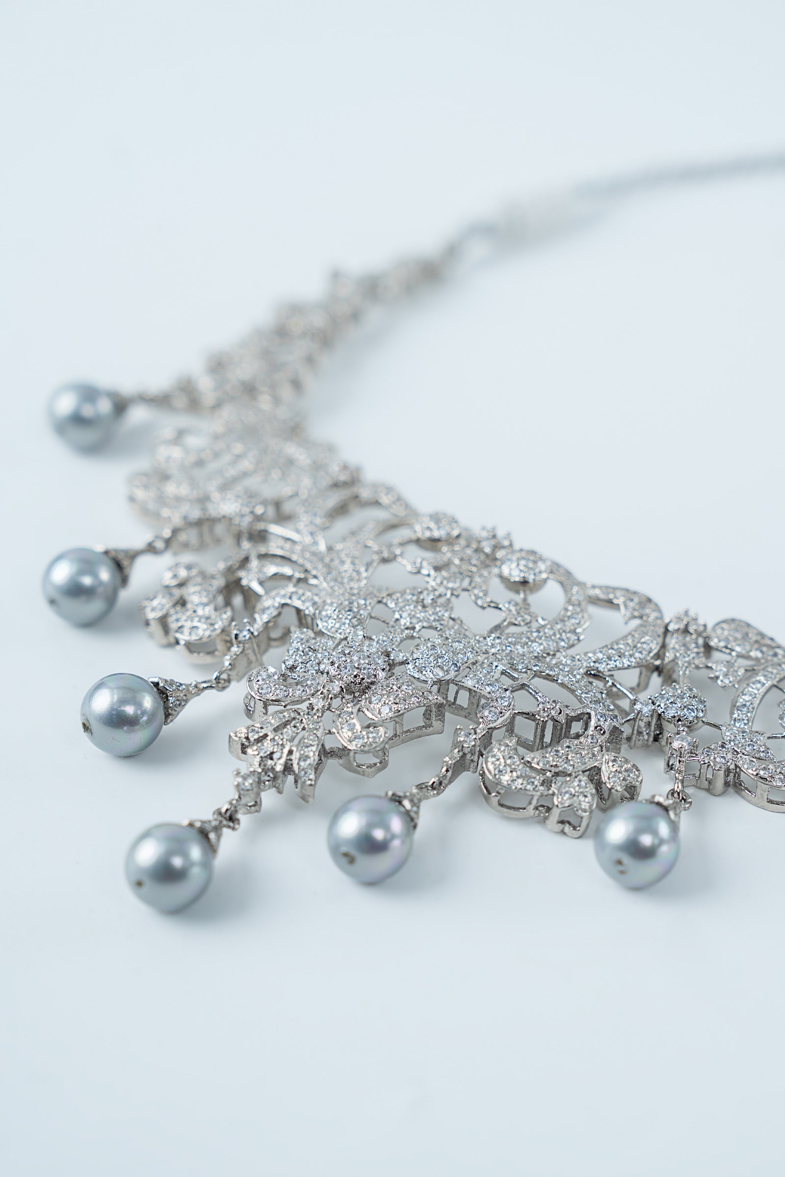 This 2Pc necklace and earring combination sways elegantly with soft light grey pearls and shimmers with brilliant white zircons, creating a sophisticated dance of delicacy and glitter. A flawless blend of contemporary elegance and joyous charm, intended to add subtle elegance to your festivities. Finish: Silver Back Pin: Sterling Silver Stud Product Care: Wipe Clean