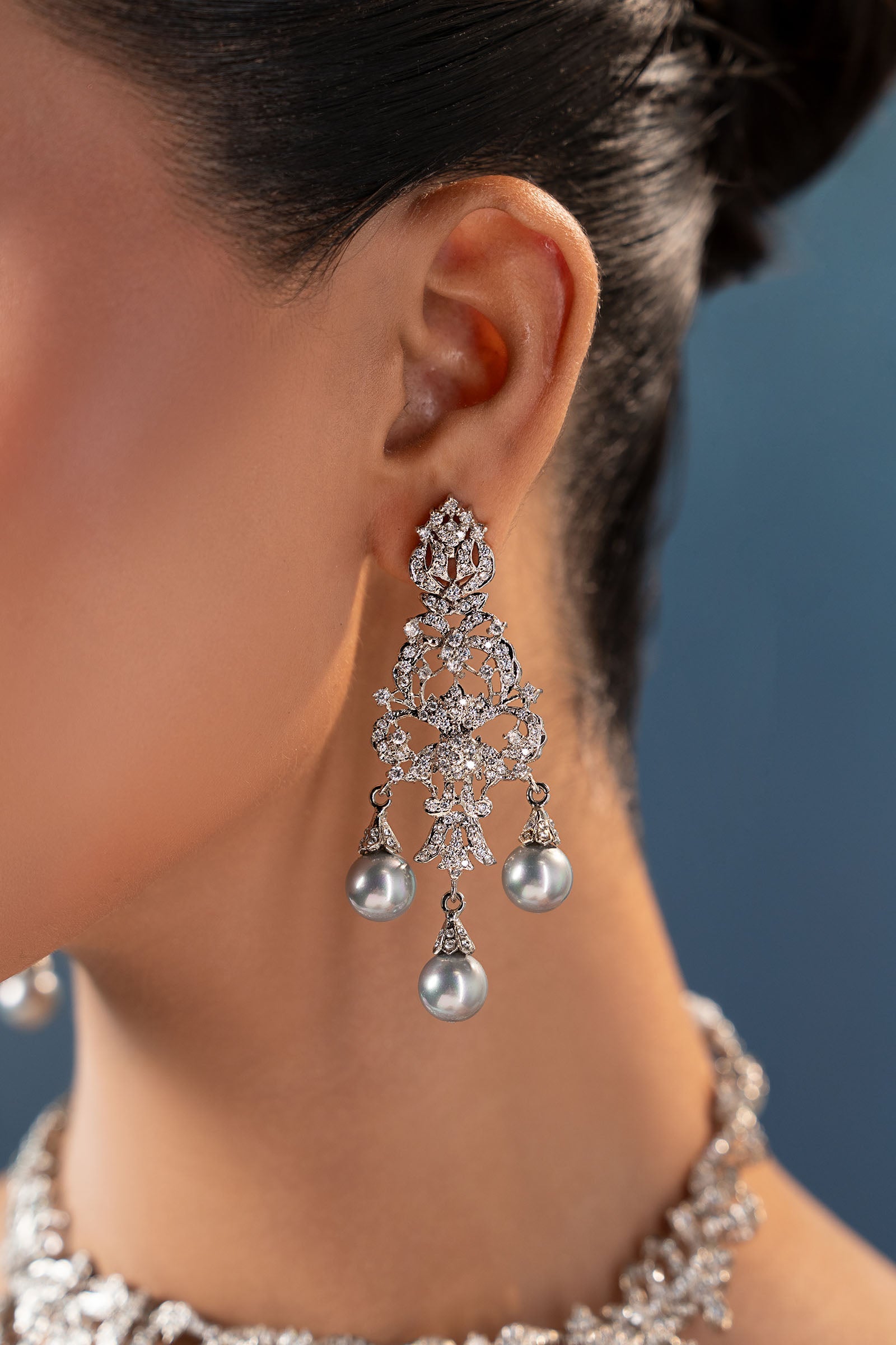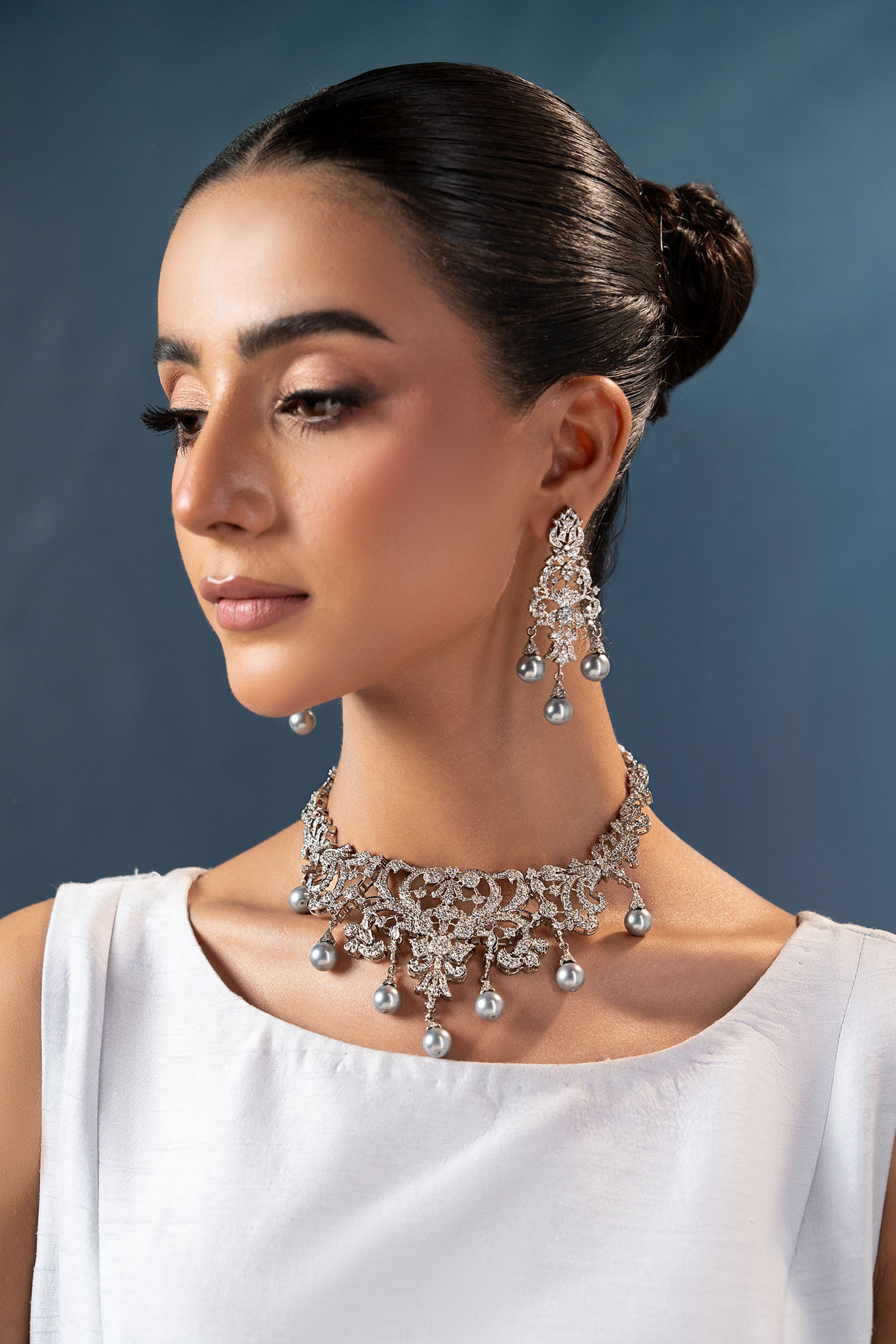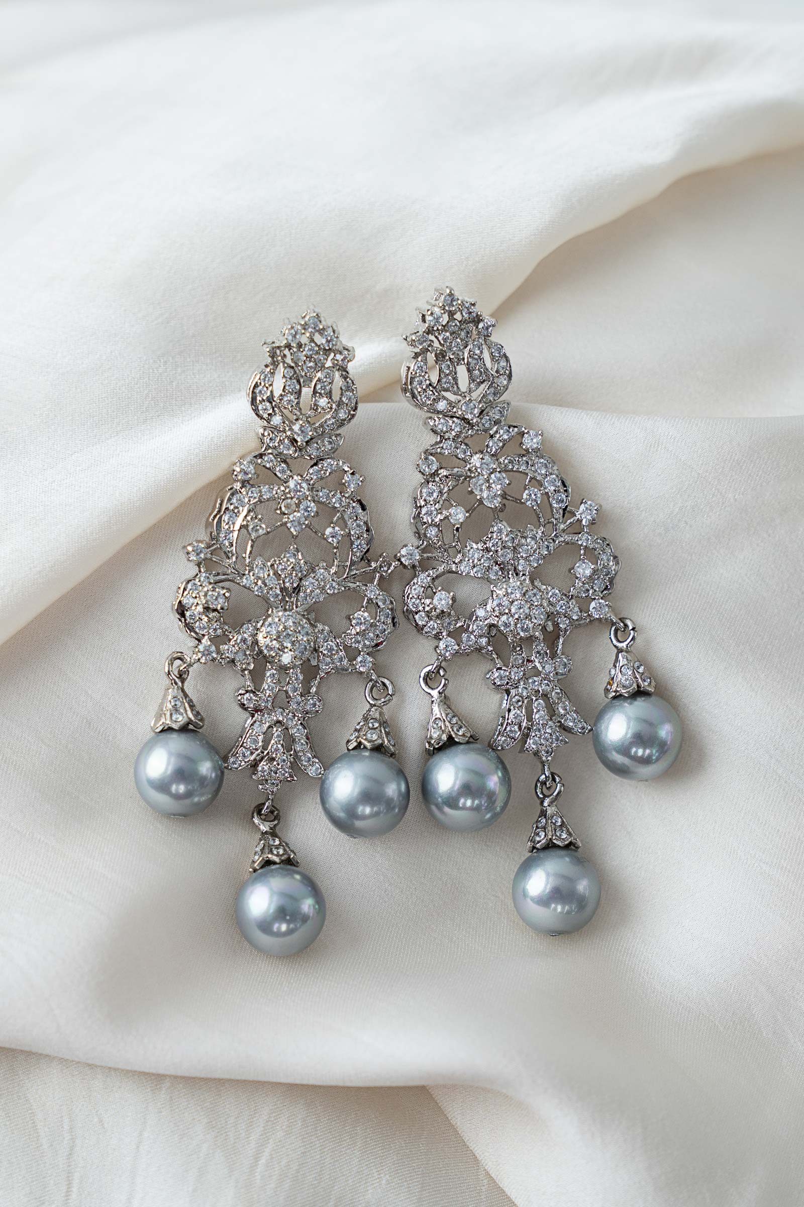 This 2Pc necklace and earring combination sways elegantly with soft light grey pearls and shimmers with brilliant white zircons, creating a sophisticated dance of delicacy and glitter. A flawless blend of contemporary elegance and joyous charm, intended to add subtle elegance to your festivities. Finish: Silver Back Pin: Sterling Silver Stud Product Care: Wipe Clean