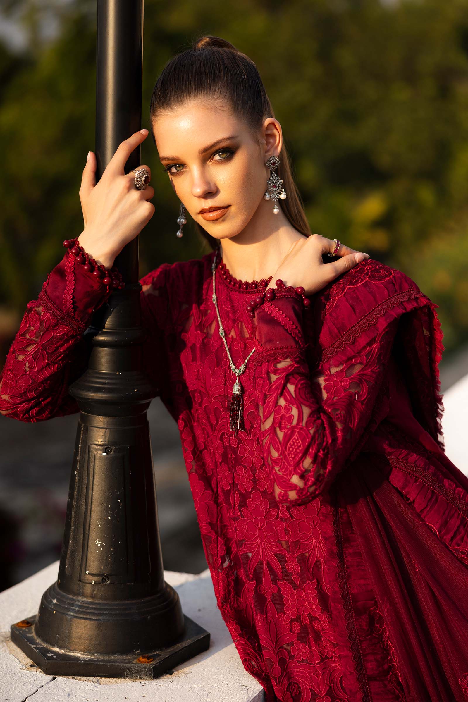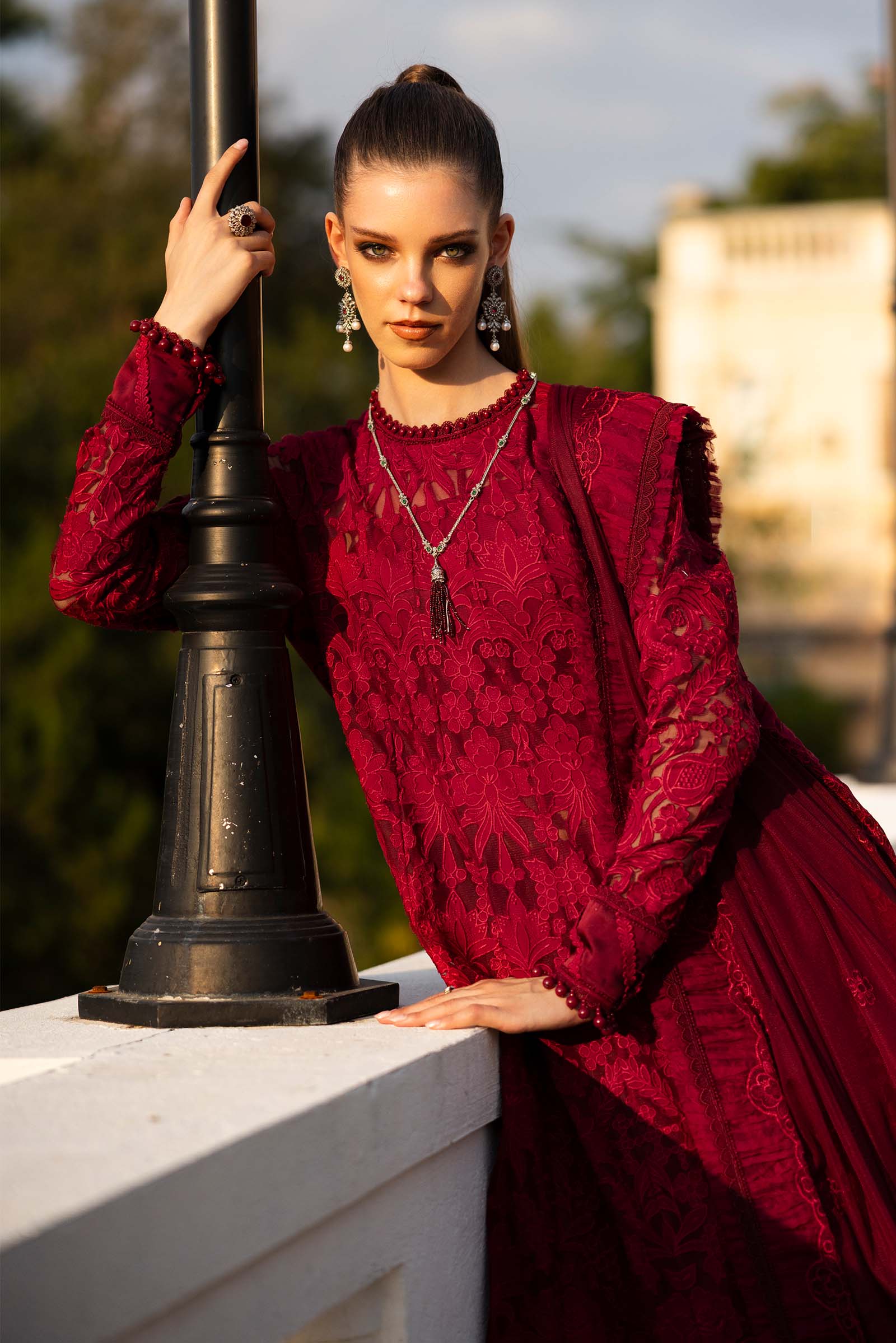 Shirt: Modern Laser Embroidery With A Layer Of Net Underneath Back: Thread Embroidery Spray Dupatta: Thread Embroidery With Scalloped Border Shirt & Back Fabric: Lawn Dupatta Fabric: Net Color: Deep Red