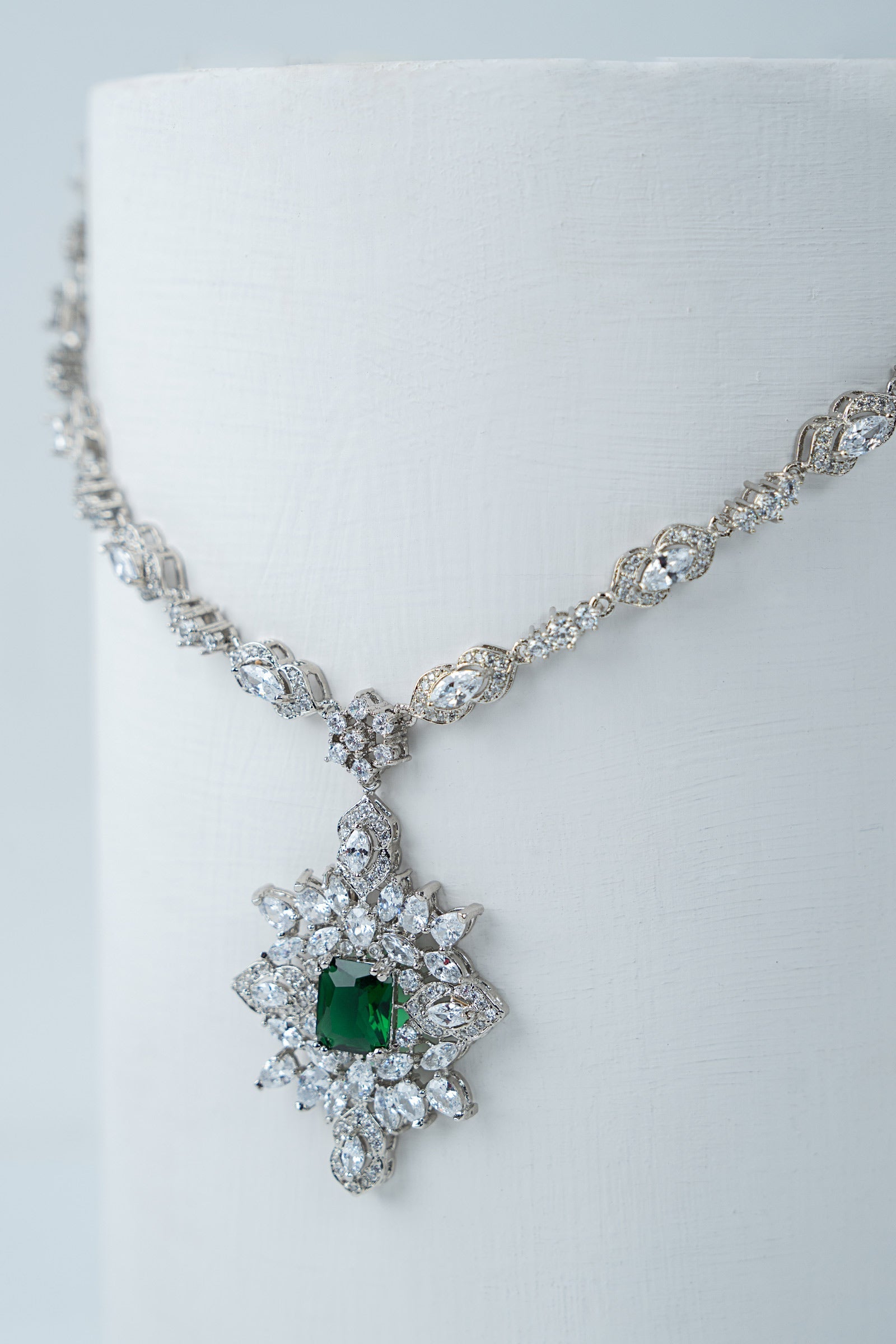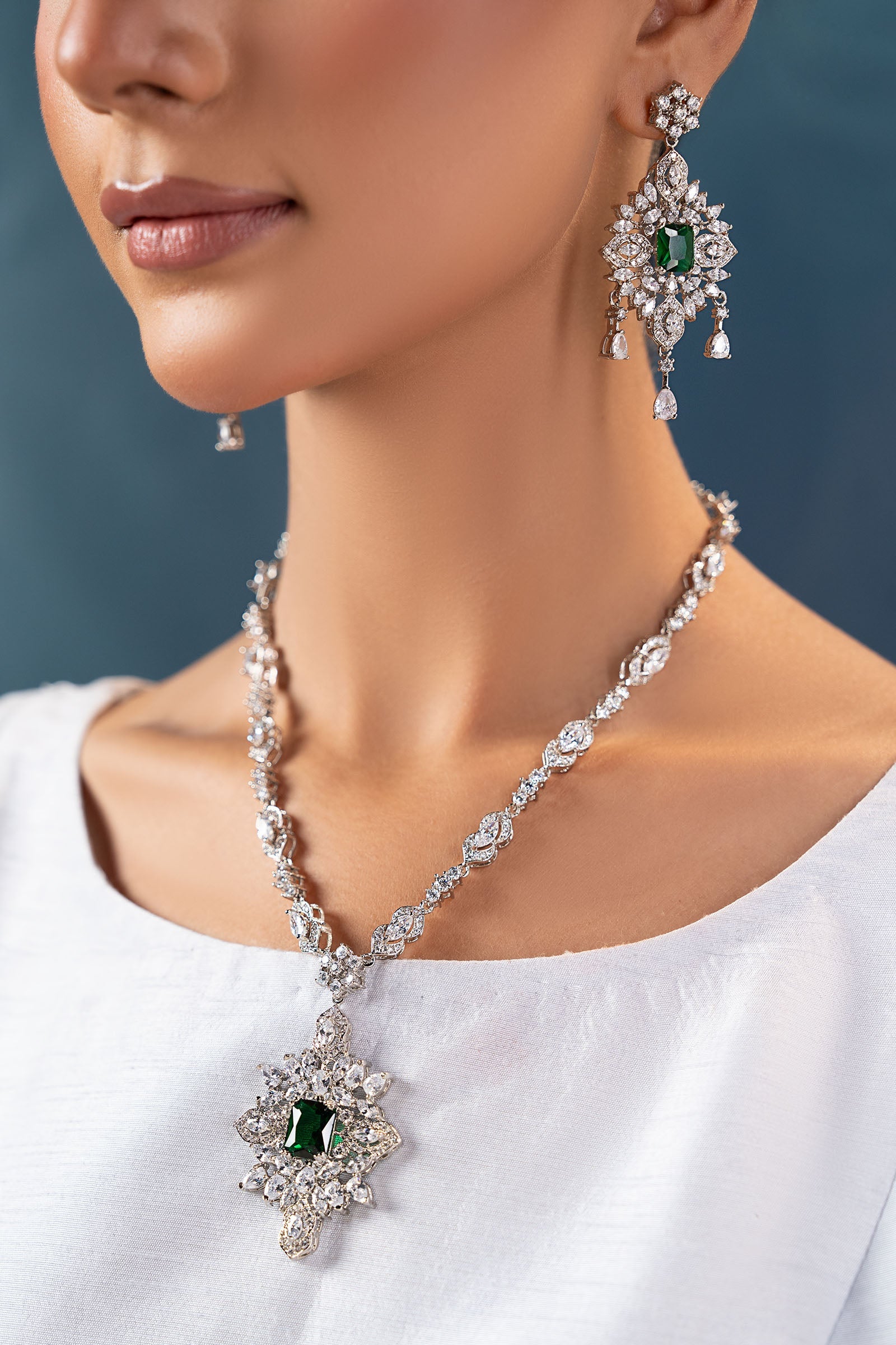 This 2Pc necklace and earrings set, which has a stunning combination of sparkling white zircons and deep emerald green, exudes contemporary elegance with a festive vibe. Bold yet elegant, it's made to add a new, fascinating glow to every occasion, fusing tradition with modern charm. Finish: Silver Back Pin: Sterling Silver Stud Lock: Spring Lock Product Care: Wipe Clean