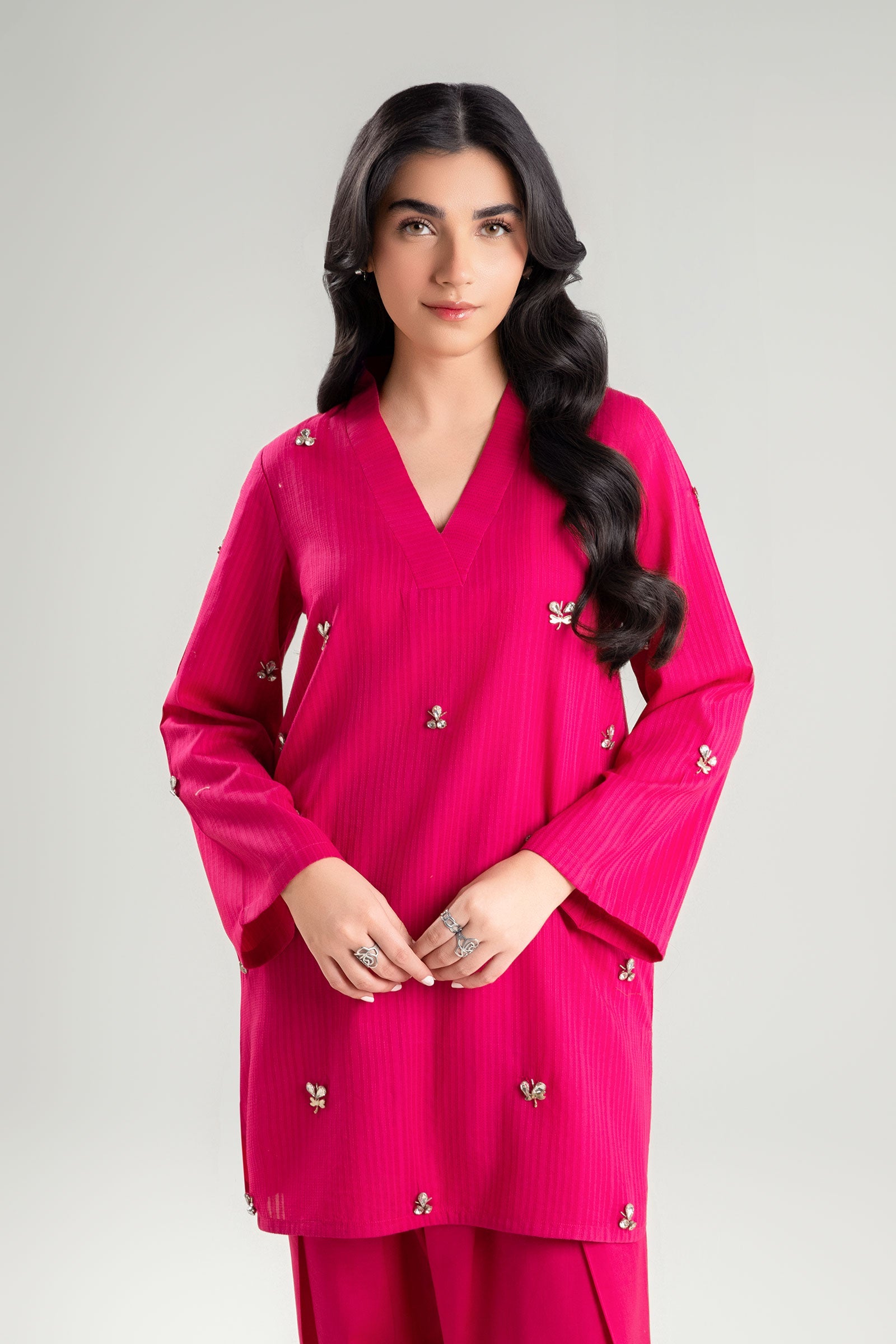 ShirtDyed Short ShirtOverlap NecklineDyed Front With Crystal EmbellishmentRound HemFull Sleeves With Crystal EmbellishmentDyed BackColor: PinkFabric: DobbyFit: RegularShalwarDyed ShalwarElasticated WaistbandFolded HemColor: PinkFabric: CambricFit: RegularModel is wearing size xsNote: Dry Clean Only