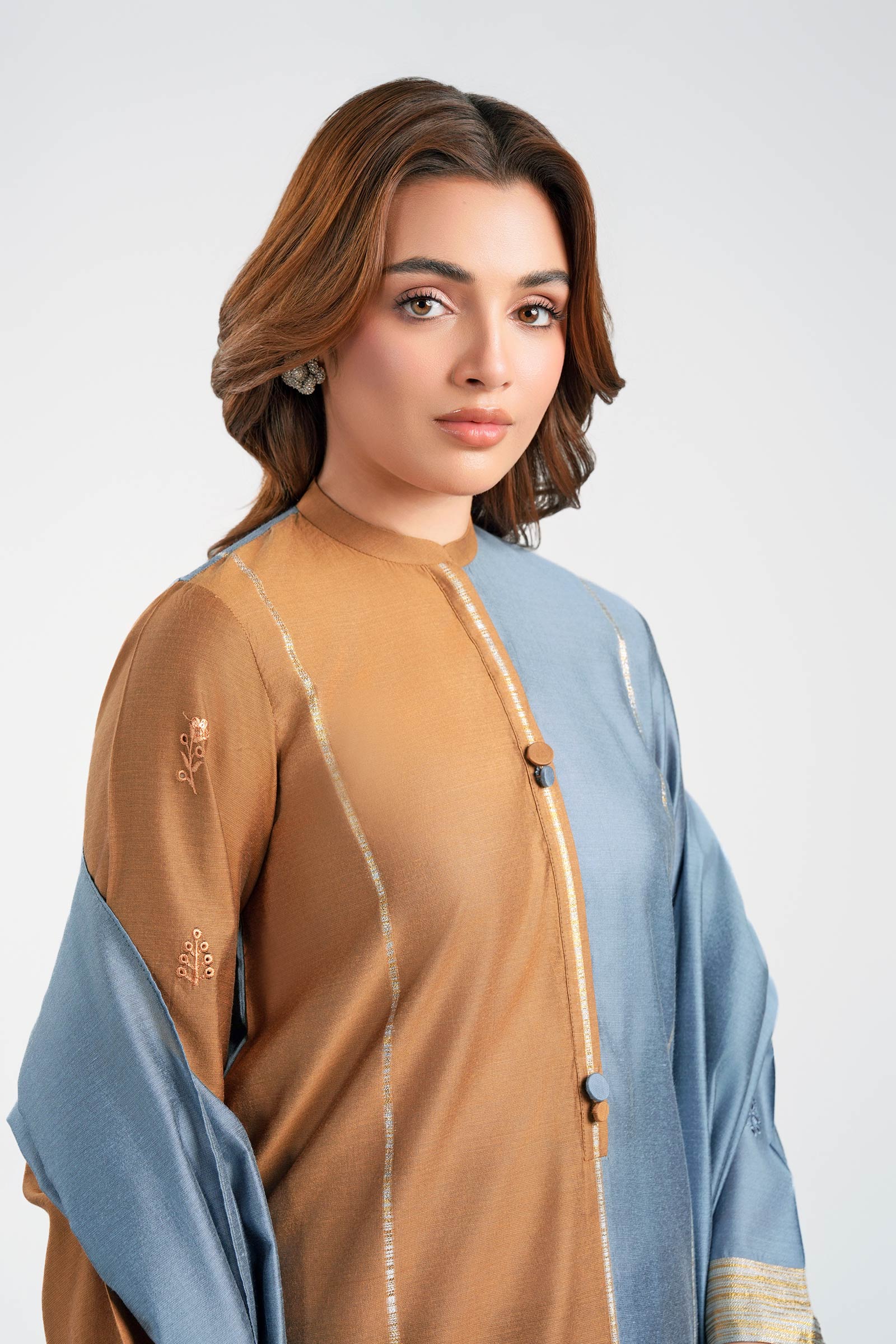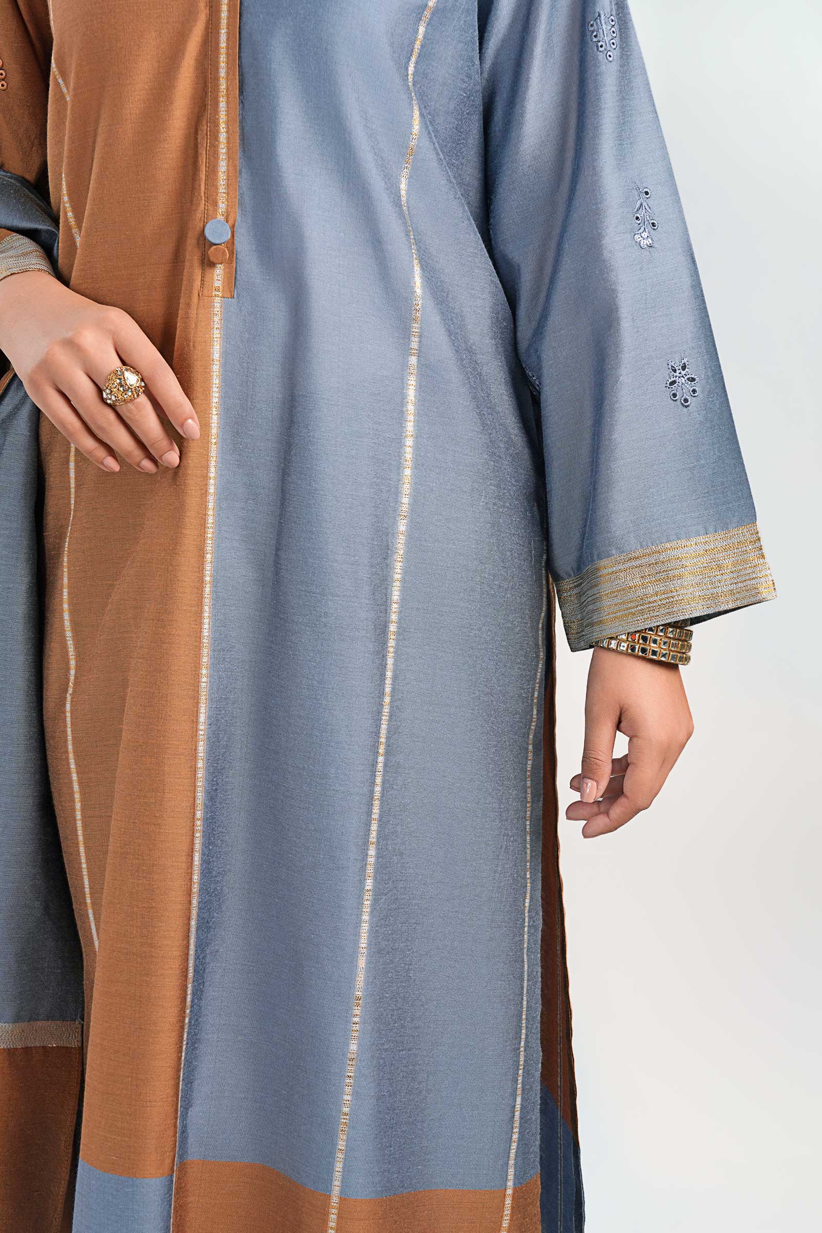 ShirtStraight Cut ShirtBand Neckline With Loop Buttons DetailingTwo-Tone Dyed Front With Stripes DetailingSchiffli Embroidered SleevesTwo-Tone Dyed Front With Lurex Stripes DetailingColor: BrownFabric: Yarn DyedFit: RegularDupattaDyed Dupatta With Tassels DetailingColor: BlueFabric: Yarn DyedModel is wearing size xsNote: Dry Clean Only