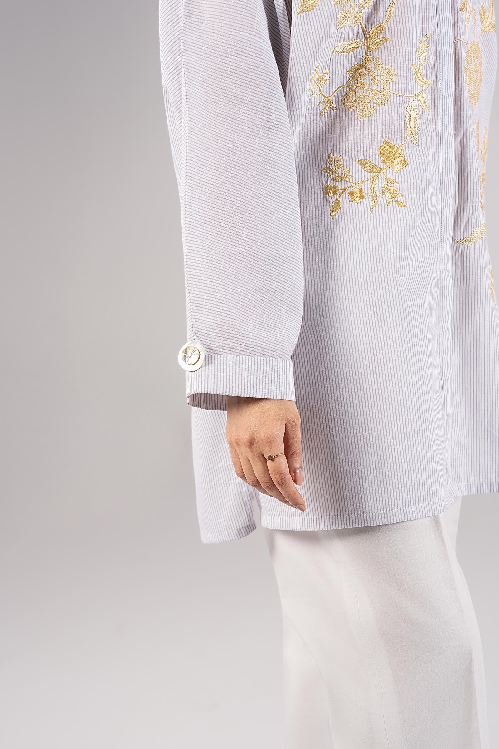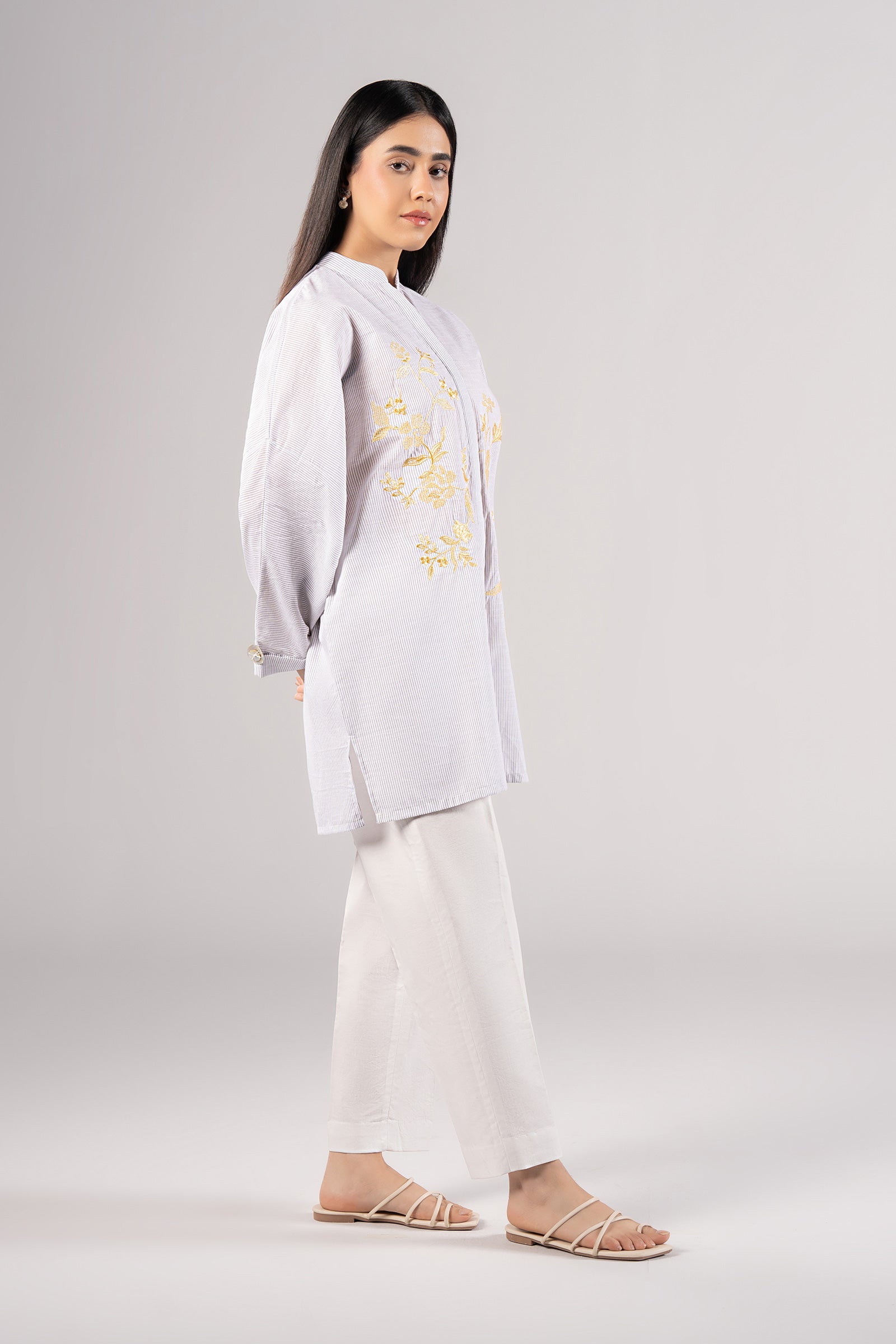 1 Piece - Shirt Short Button-Down Shirt Dyed Front With Embroidery Full Sleeves With Cuff Dyed Back Color: Grey Fabric: Yarn Dyed Fit: Regular Model is wearing size xs Note: Dry Clean Only
