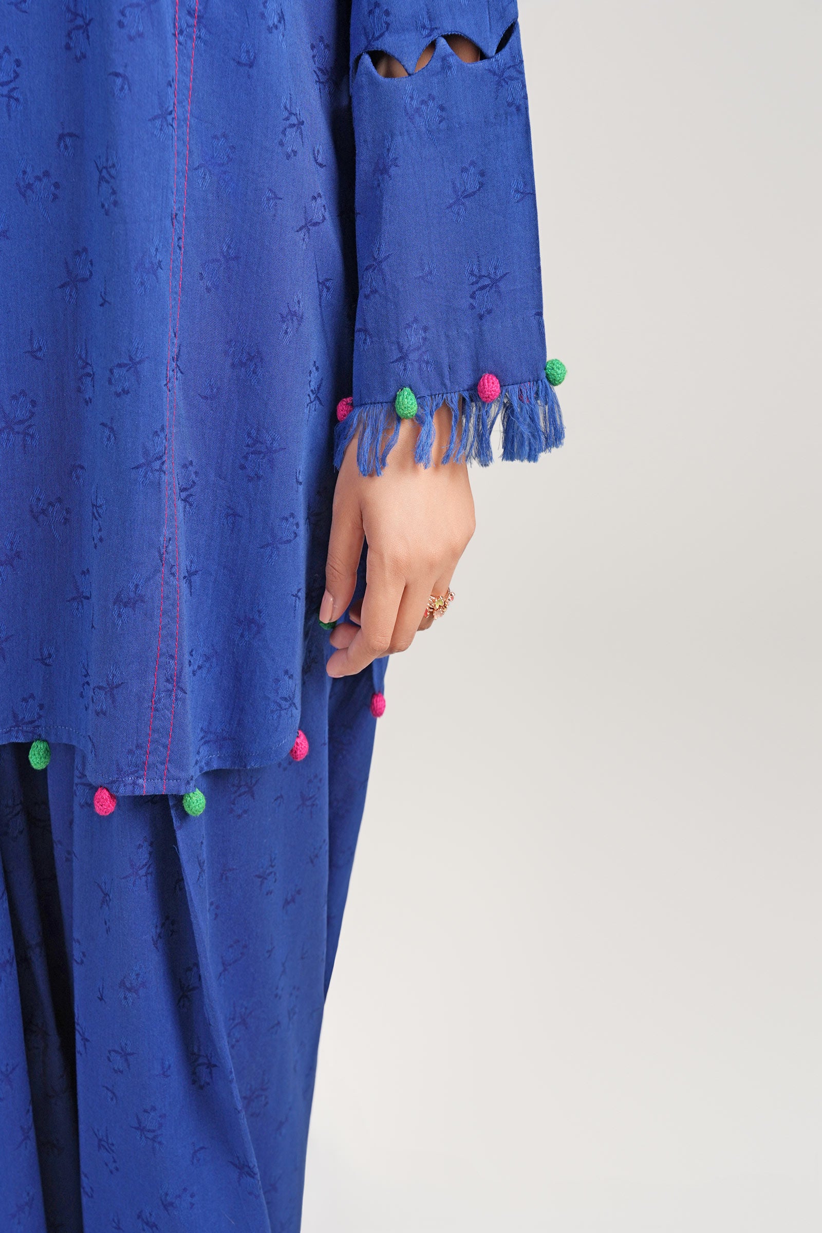 ShirtShort ShirtBan Collar NecklineDyed Front With Thread Detailing On PanelsRound High Low HemFull Sleeves With Frey Organza DetailingCrochet Balls Drop Detailing On Sleeves & BorderDyed BackColor: Electric BlueFabric: Jacquard ViscoseFit: RegularShalwarDyed ShalwarElasticated WaistbandColor: Electric BlueFabric: Jacquard ViscoseFit: RegularModel is wearing size xsNote: Dry Clean Only
