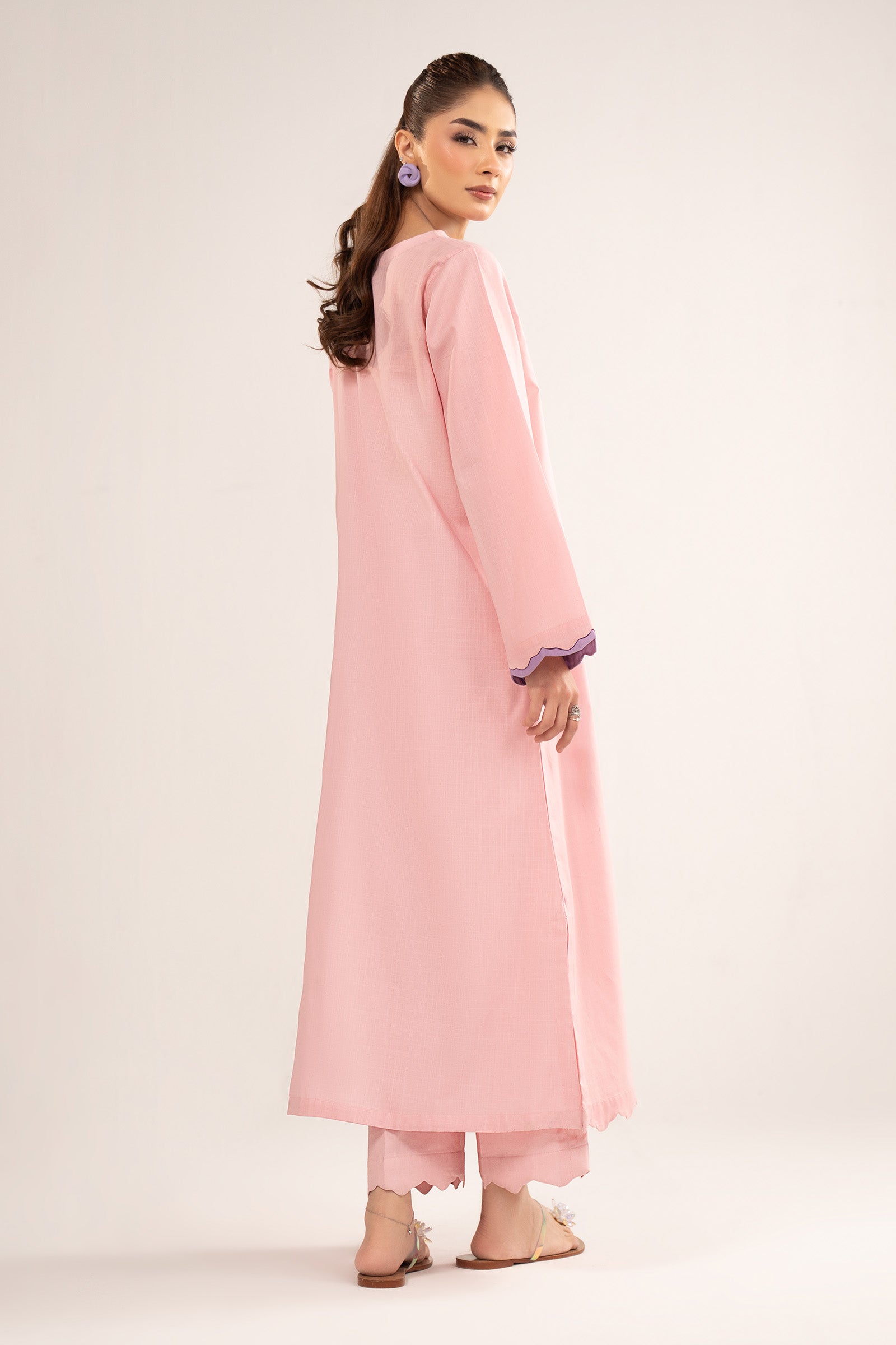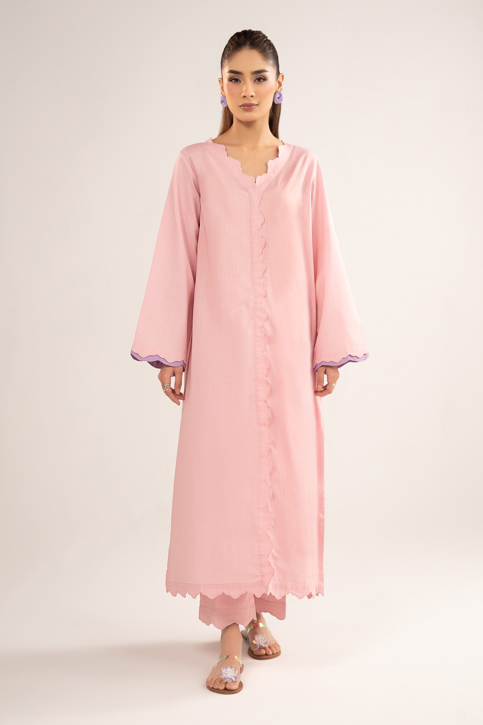 ShirtA-Line ShirtScalloped NecklineScallop-Trimmed SleevesColor: Ash PinkFabric: CrosshatchTrouserCulotte TrouserElasticated WaistbandColor: Ash PinkFabric: CrosshatchModel is wearing xs sizeNote: Dry Clean Only