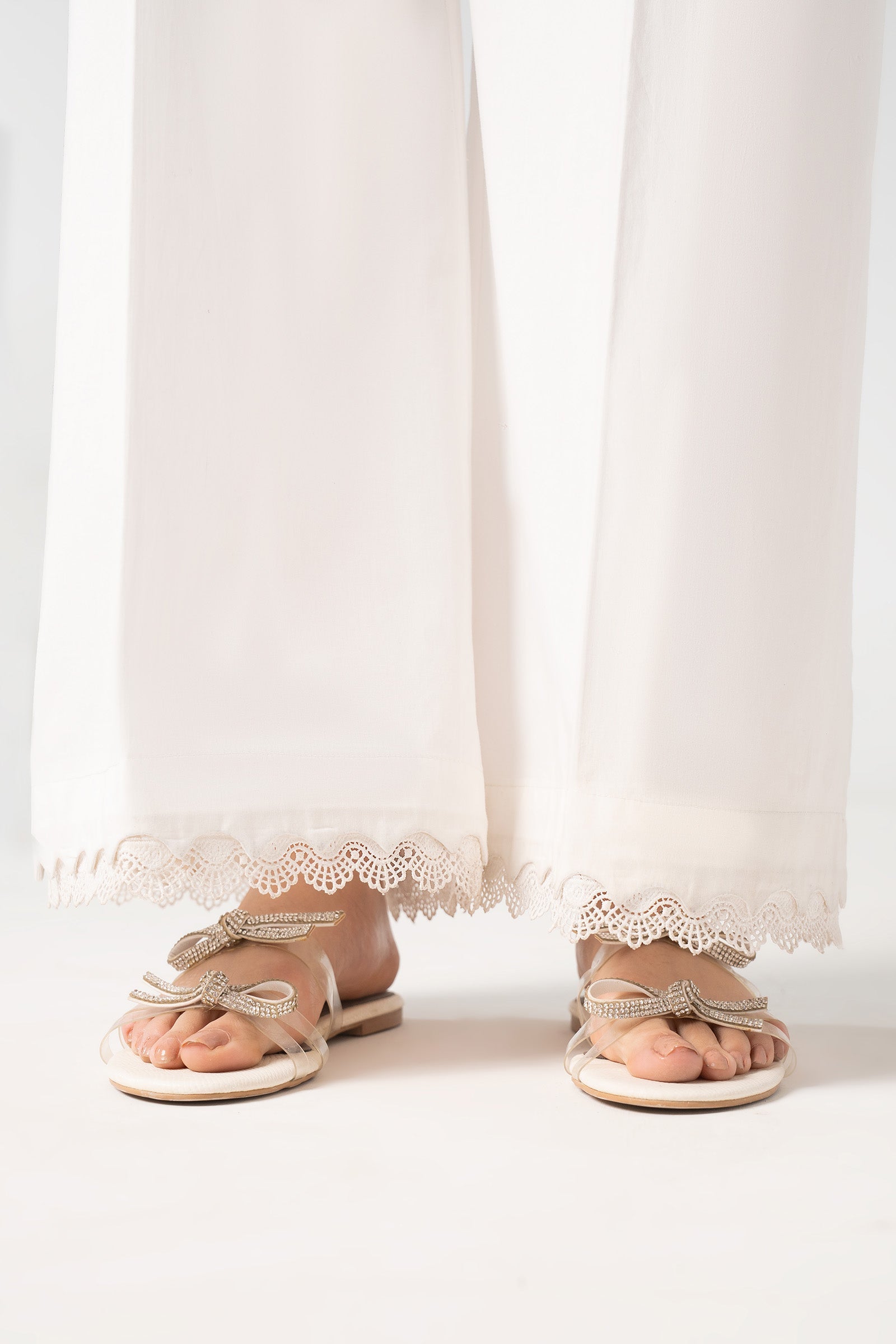 Dhaka Trouser With Laced Edges Elasticated Waistband Color: White Fabric: Cambric Model is wearing xs size Note: Dry Clean Only