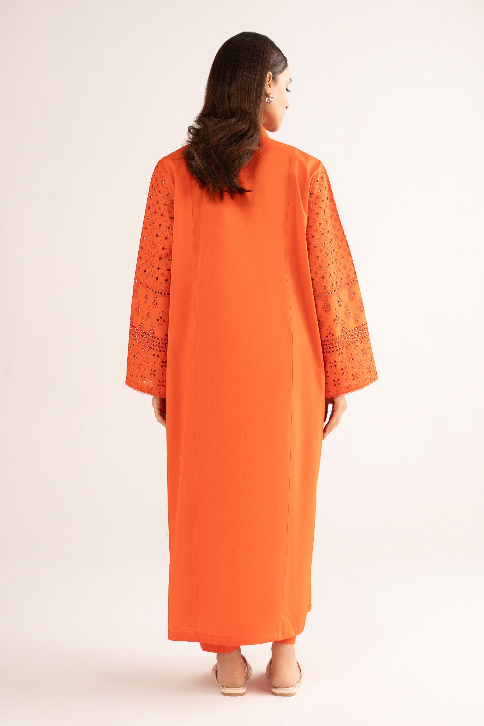 1 Piece - Shirt Straight Schiffli Embroidered Shirt Band Collar Neckline With Loop-Buttons Detailing Straight Sleeves Color: Orange Fabric: Lawn Model is wearing xs size Note: Dry Clean Only