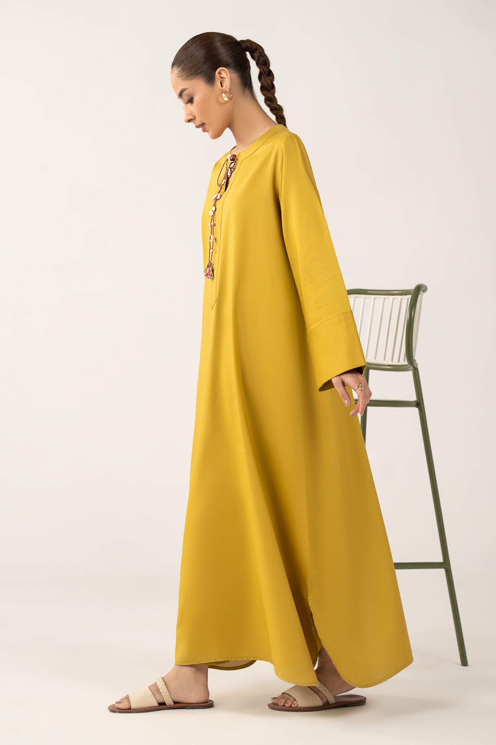 ShirtStraight ShirtRound Neck With Dori DetailingSleeves With CuffsColor: MustardFabric: Arabic LawnTrouserTapered TrouserElasticated WaistbandColor: MustardFabric: Arabic LawnModel is wearing xs sizeNote: Dry Clean Only