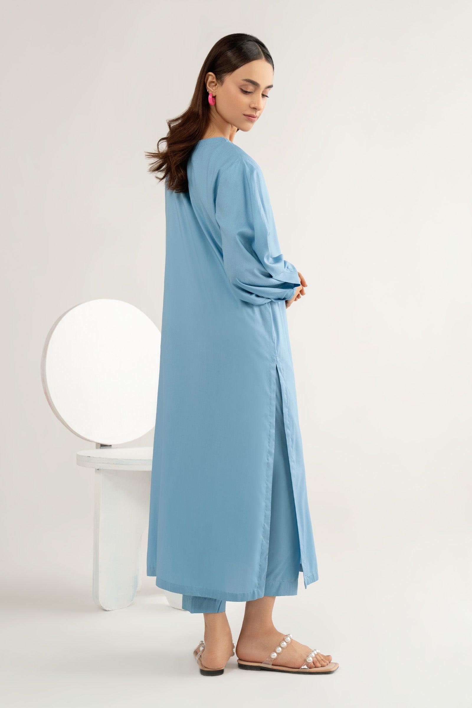 2 Piece - Shirt & TrouserShirtStraight ShirtRound NecklineStraight Sleeves With Gathers DetailingColor: Sky BlueFabric: Arabic LawnTrouserStraight TrouserElasticated WaistbandColor: Sky BlueFabric: Arabic LawnModel is wearing xs sizeNote: Dry Clean Only