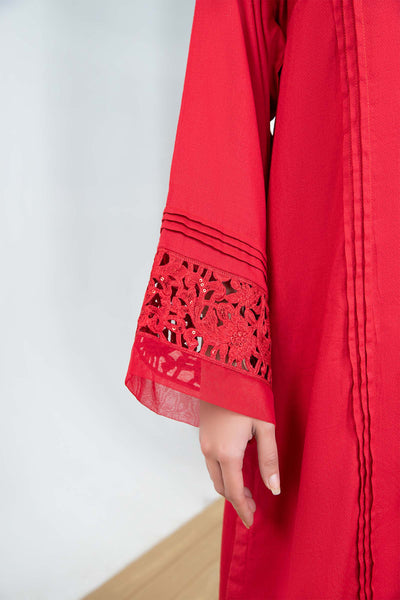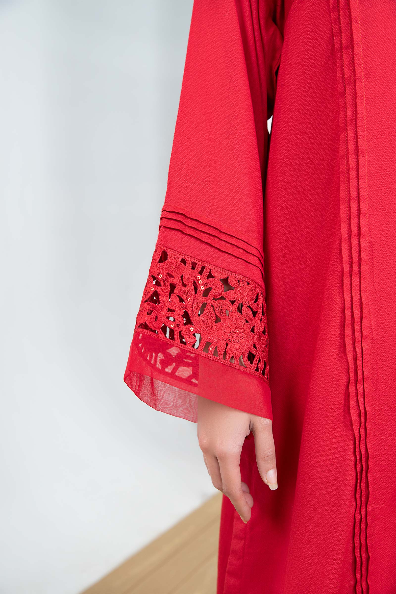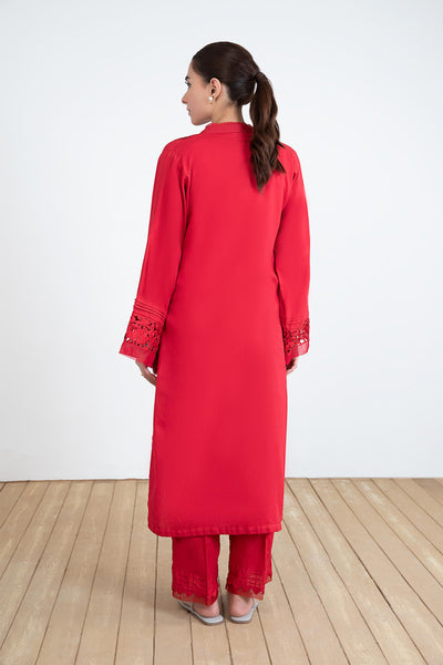 Exude sophistication with our red 2 piece dyed dobby lawn suit accented with flourish embroidery and organza detailing paired with straight trousers.