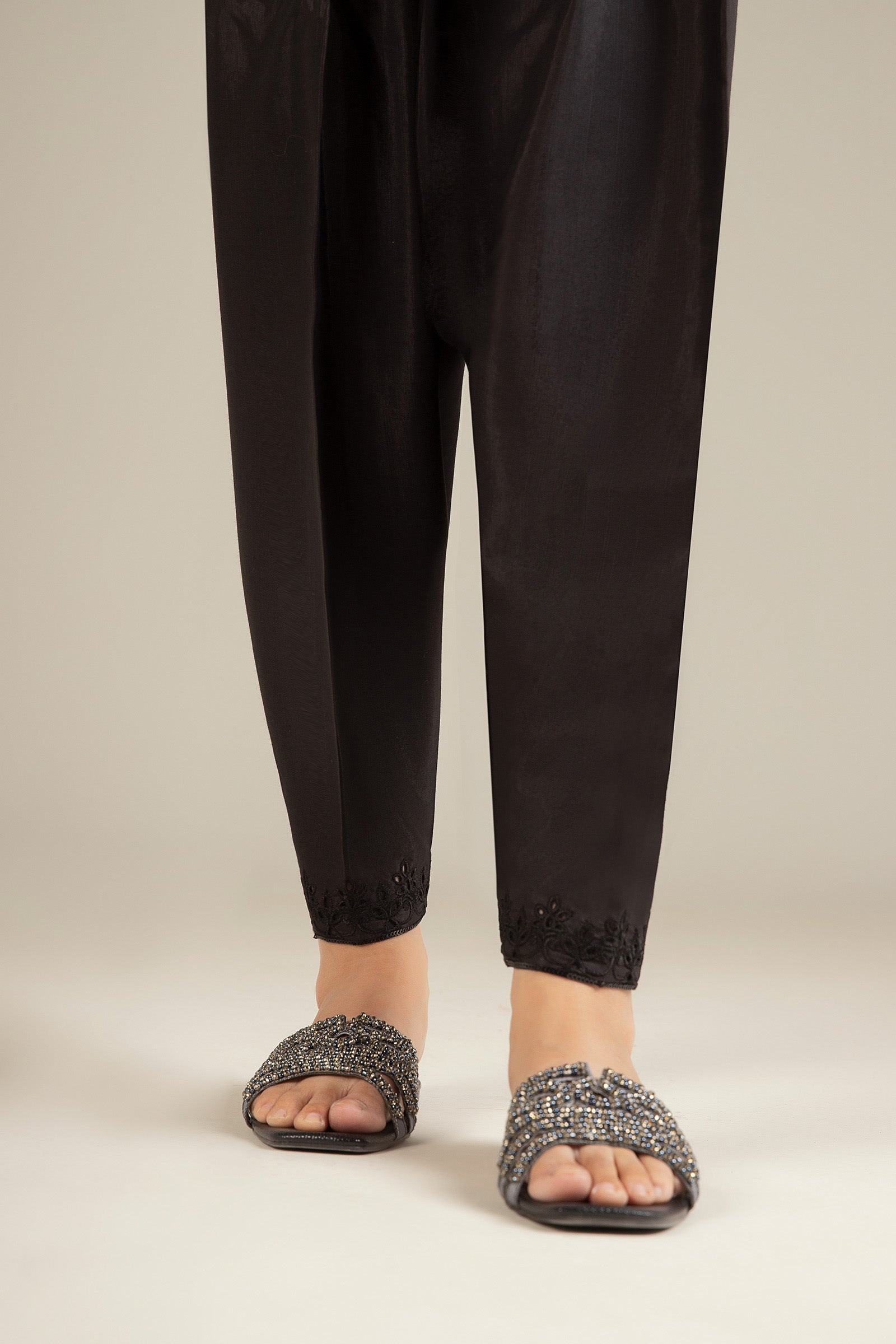 Dyed Tapered Shalwar With Embroidered Hem Elasticated Waistband Color: Black Fabric: Raw Silk Fit: Regular Occasion: Festive Model is wearing size xs Note: Dry Clean Only