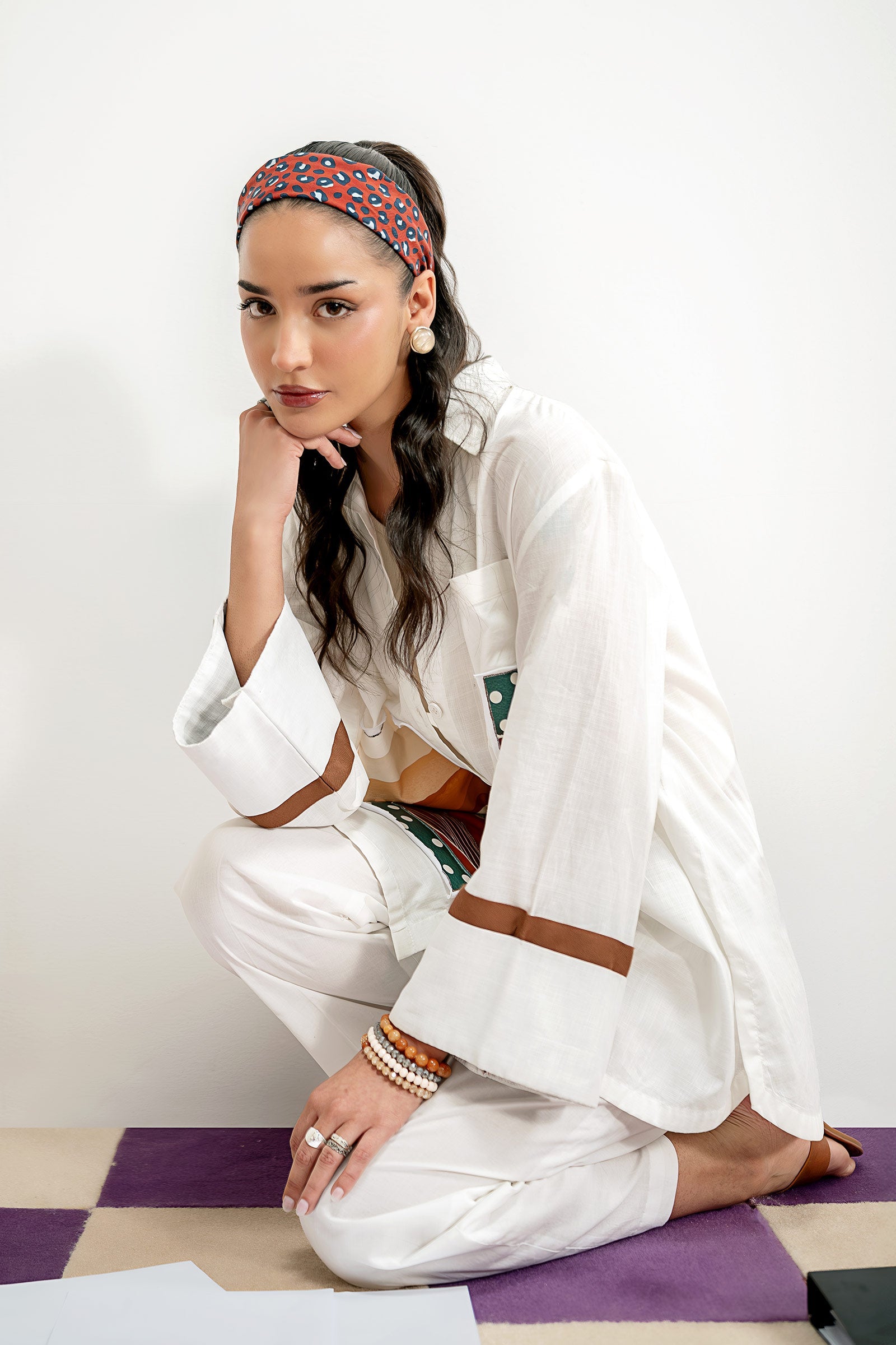 ShirtButton Down Shirt With Front PocketDyed Front With Knit Patch Print DetailingRound HemFabric Detailing On SleevesColor: Off WhiteFabric: CambricFit: RegularTrouserHigh-Waisted Wide-Leg TrouserElasticated WaistbandTop Stitches On Tuck Pleats2 Side PocketsColor: Off WhiteFabric: CambricFit: RegularModel is wearing size xsNote: Dry Clean Only
