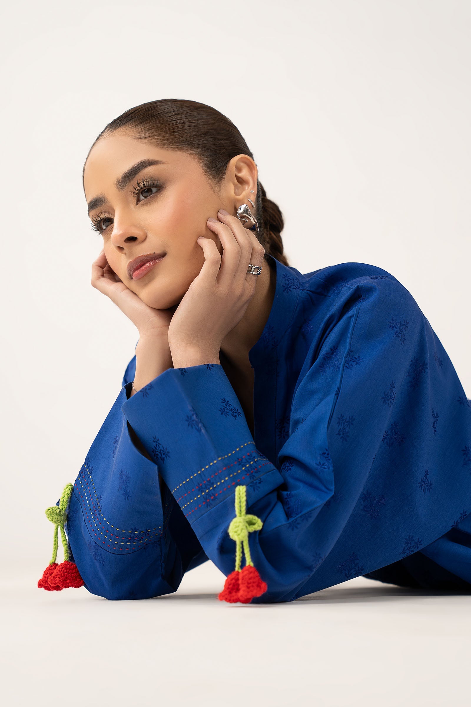 2 Piece - Shirt & TrouserShirtStraight ShirtBand Collar NecklineStraight Sleeves With Crochet TasselColor: BlueFabric: Dobby ViscoseTrouserTapered TrouserElasticated WaistbandColor: BlueFabric: Dobby ViscoseModel is wearing xs sizeNote: Dry Clean Only