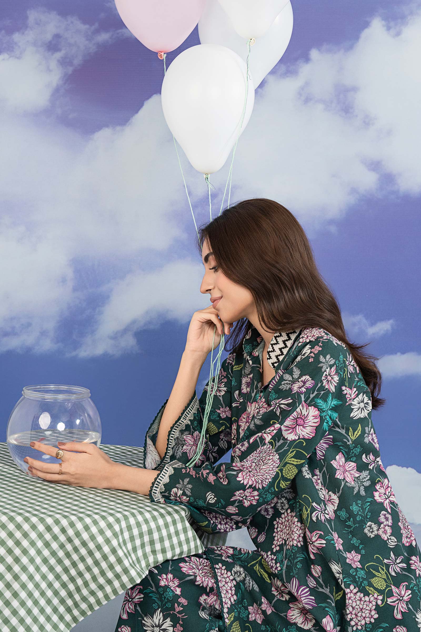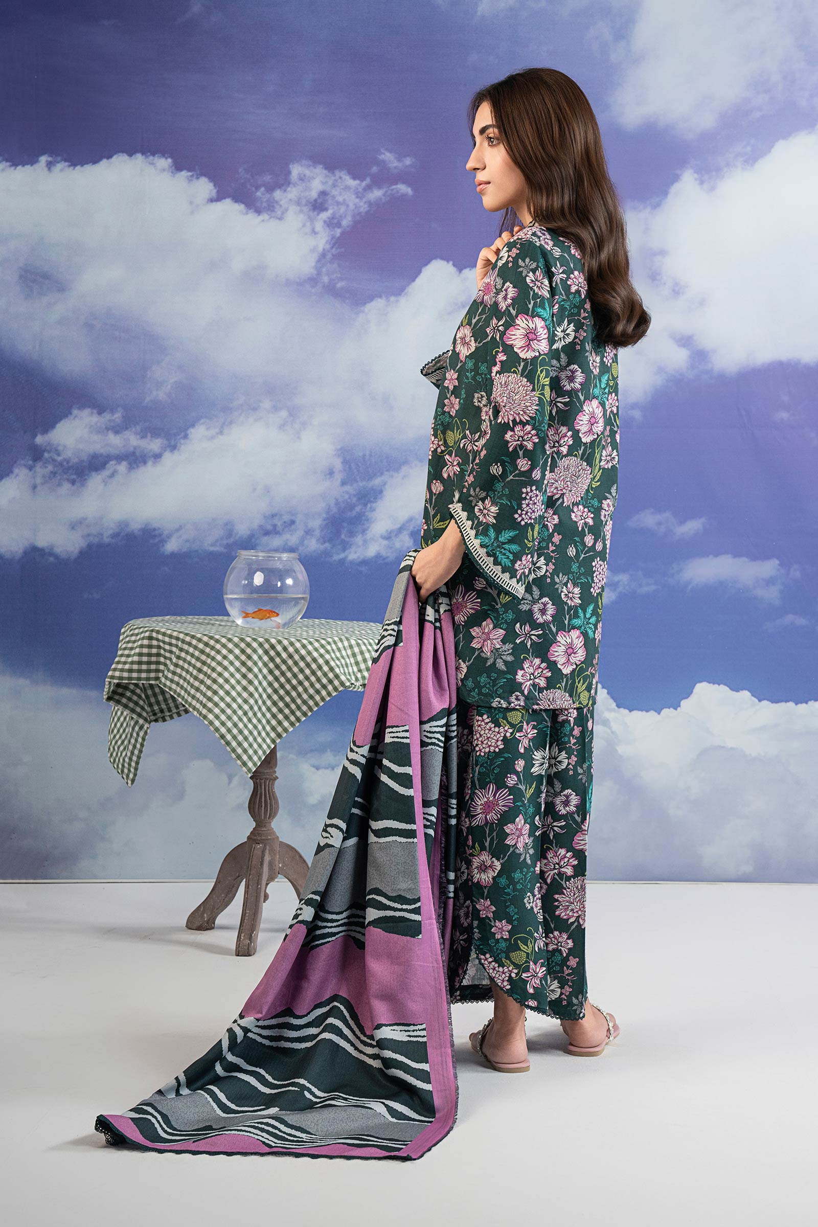 ShirtPrinted Short ShirtEmbroidered Band NecklineRound Hem With Lace DetailingPrinted Sleeves With Lace Detailing & Embroidered BorderColor: Dark GreenFabric: KhaddarFit: RegularTrouserPrinted CulottesElasticated WaistbandLace Detailing On HemColor: Dark GreenFabric: KhaddarFit: RegularDupattaPrinted DupattaTwo-Side Lace BorderColor: Dark GreenFabric: HerringboneModel is wearing xs sizeNote: Dry Clean Only