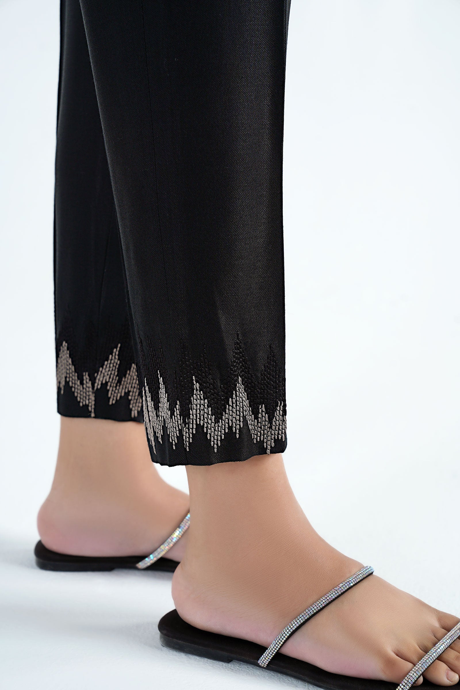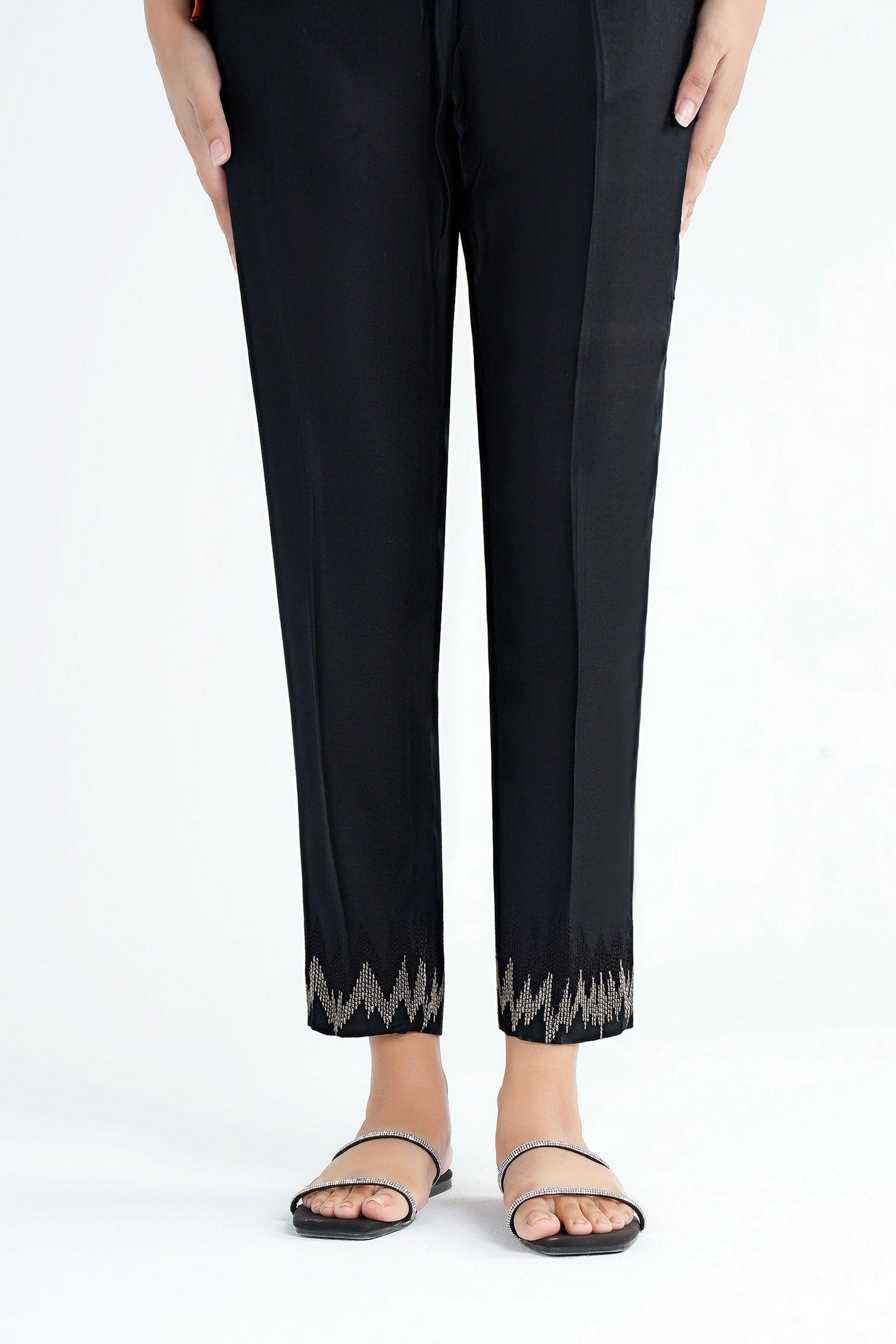 Straight Trouser Elasticated Waistband With Darts Detailing Side Pockets Embroidered Border Color: Black Fabric: Twill Fit: Regular Occasion: Daily Casual Model is wearing xs size Note: Dry Clean Only