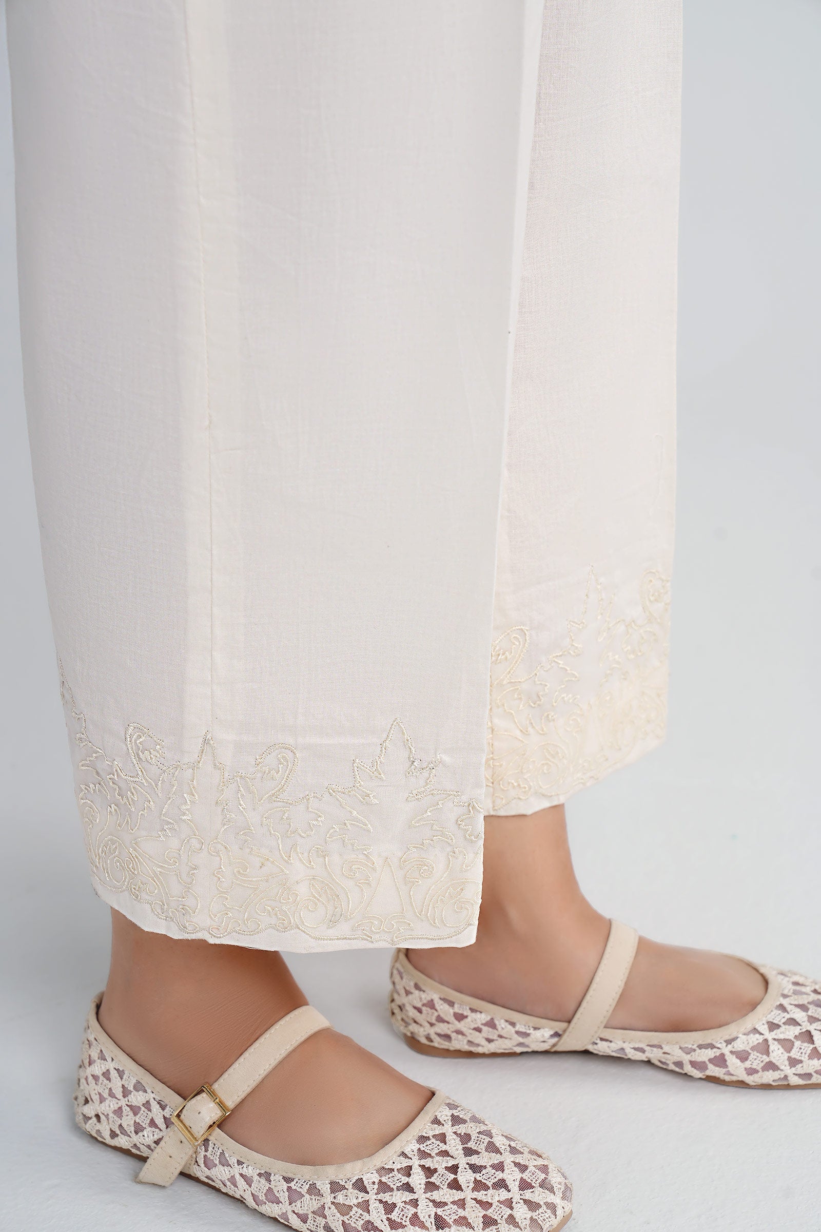 Culottes Elasticated Waistband Embroidered Border Color: Off-White Fabric: Cambric Fit: Regular Occasion: Daily Casual Model is wearing xs size Note: Dry Clean Only