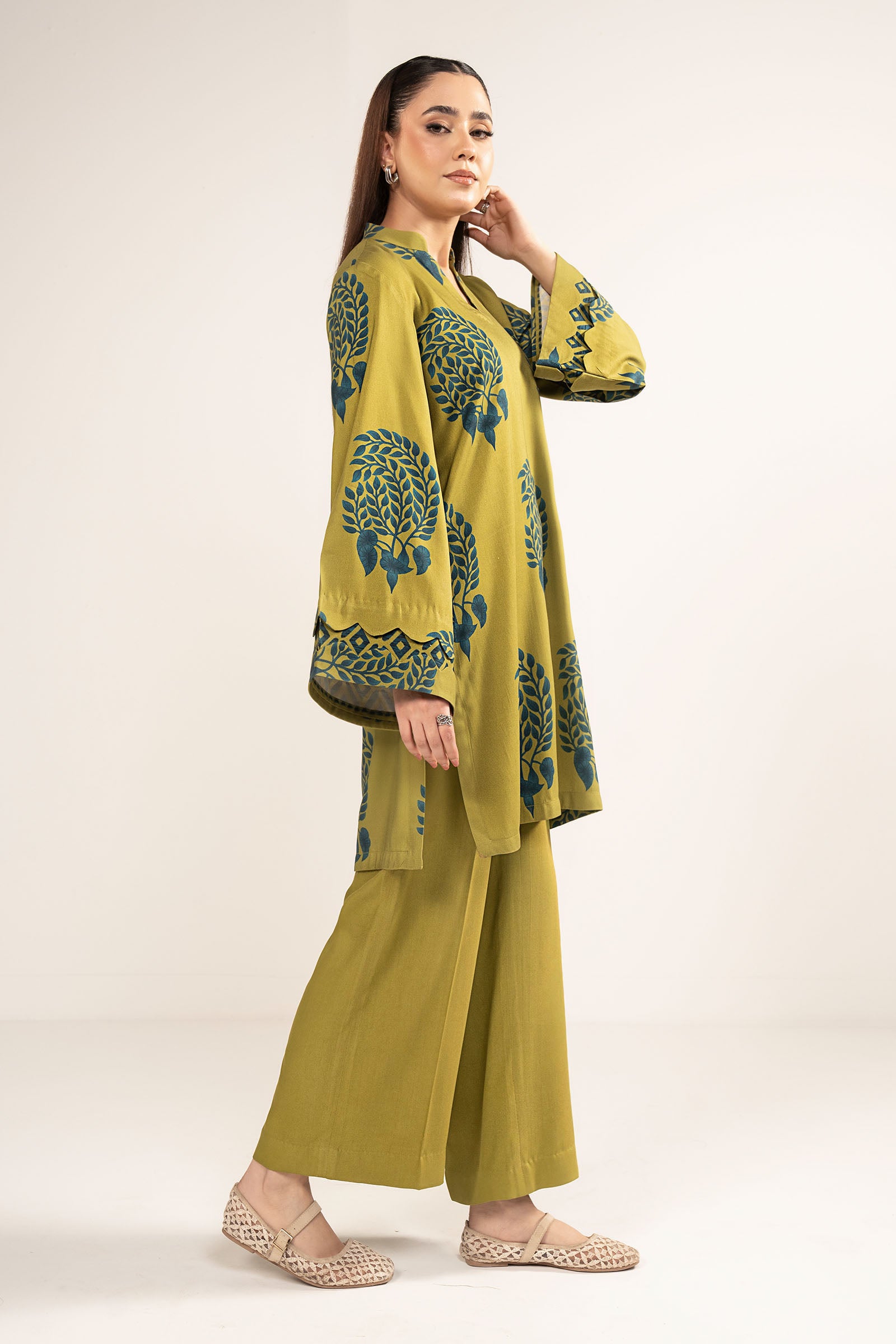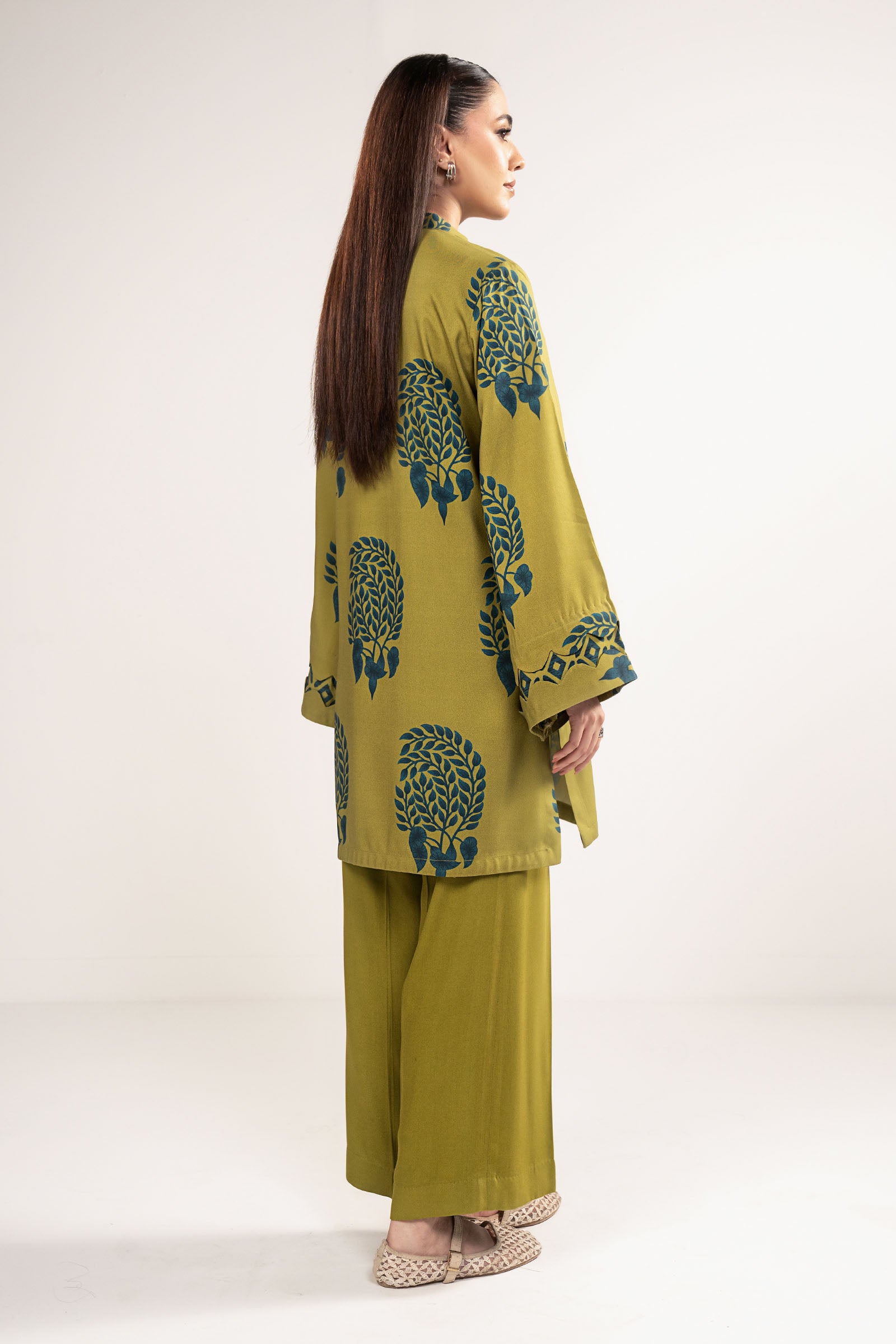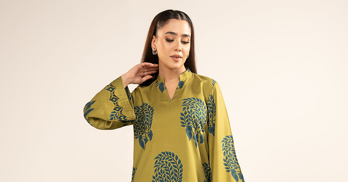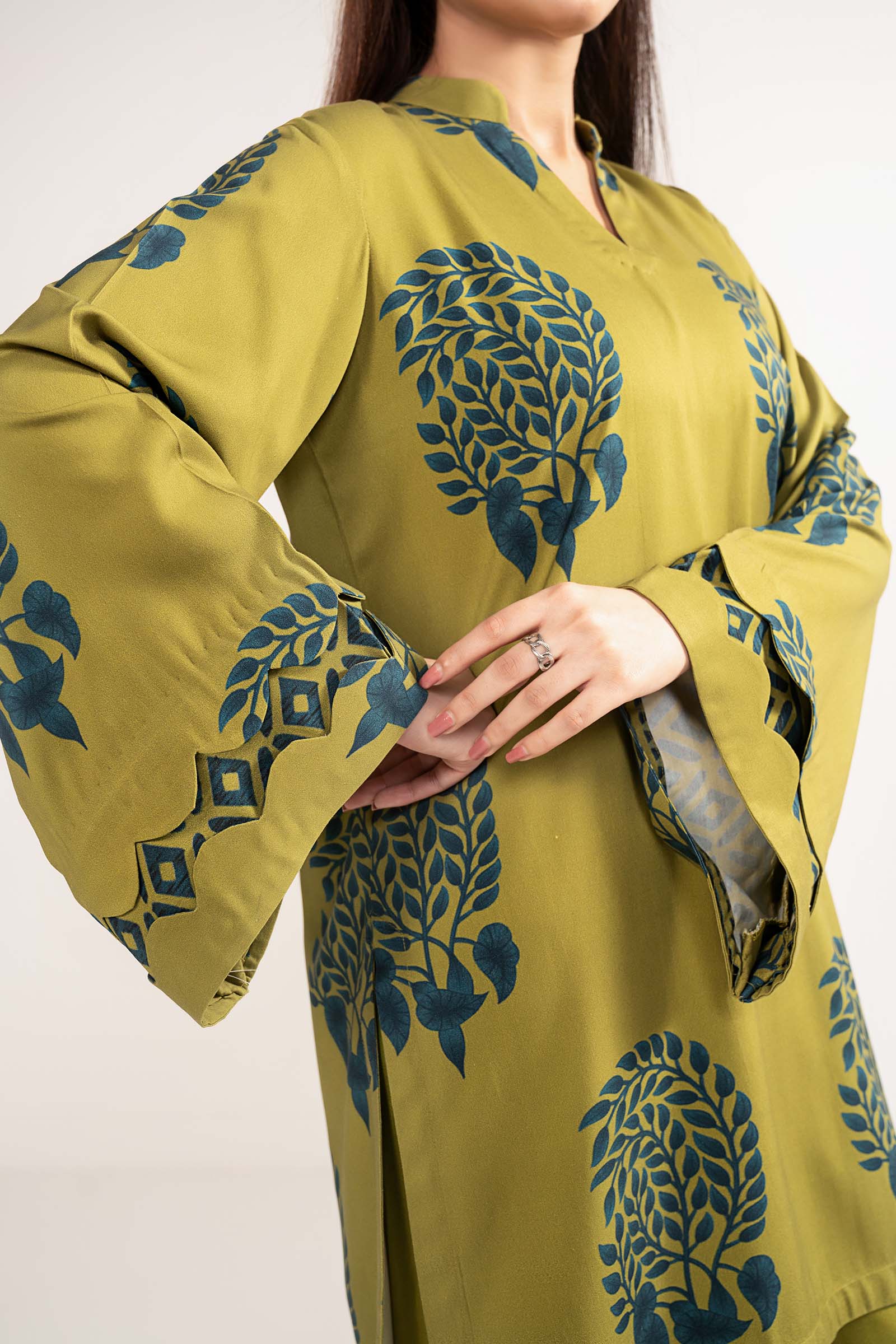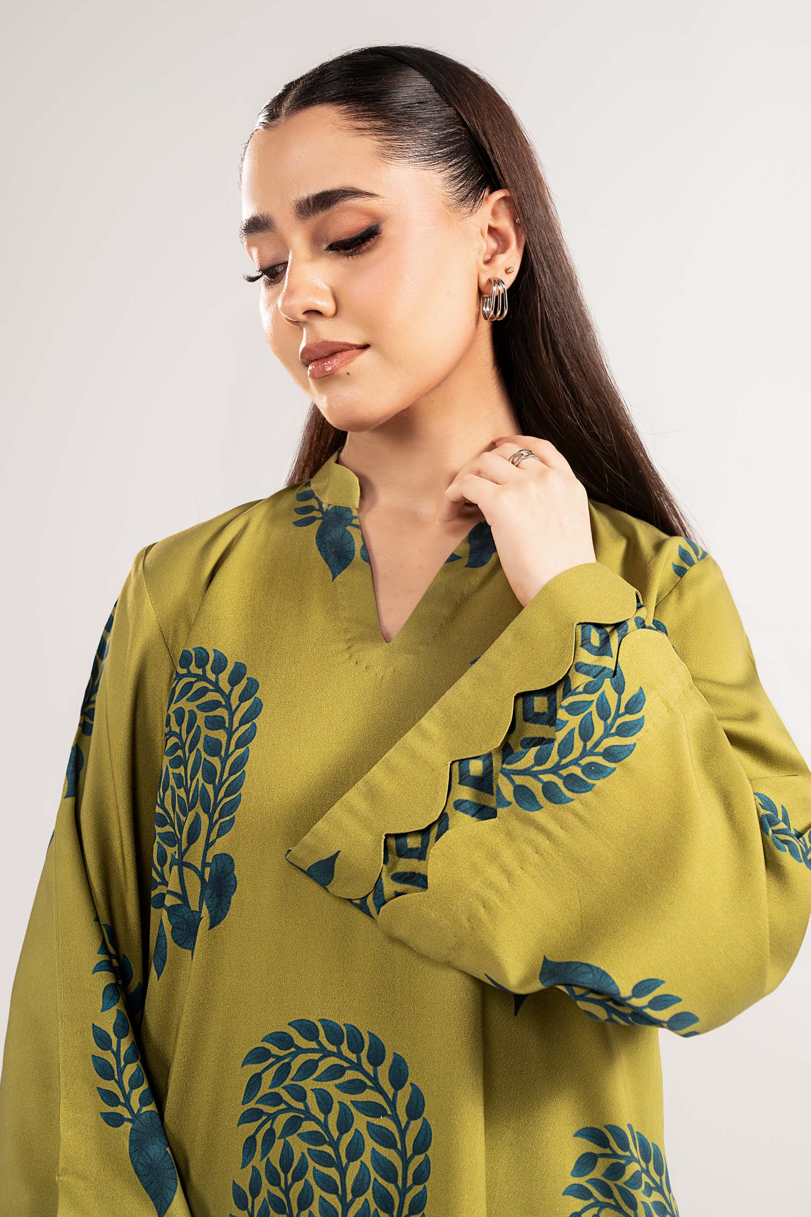 ShirtPrinted ShirtBand Collar NecklineA-Line Sleeves With Fabric DetailingColor: GreenFabric: TwillFit: Regular