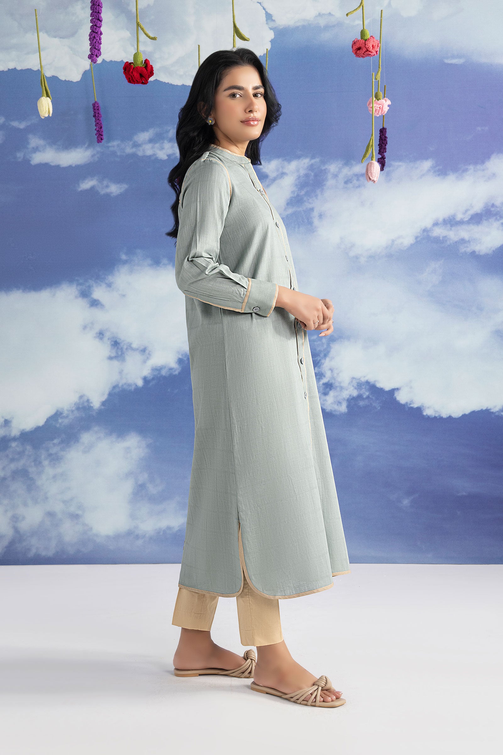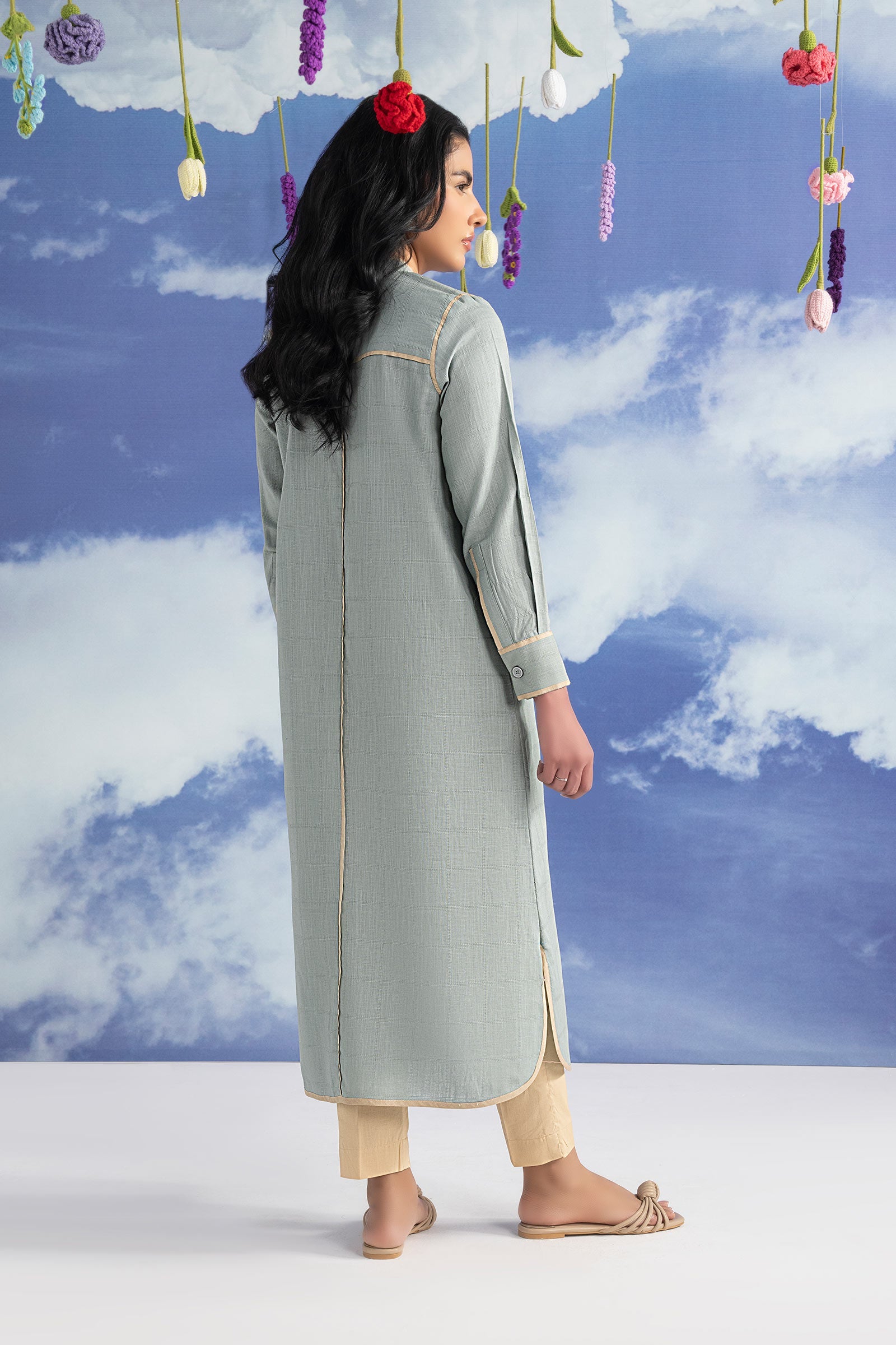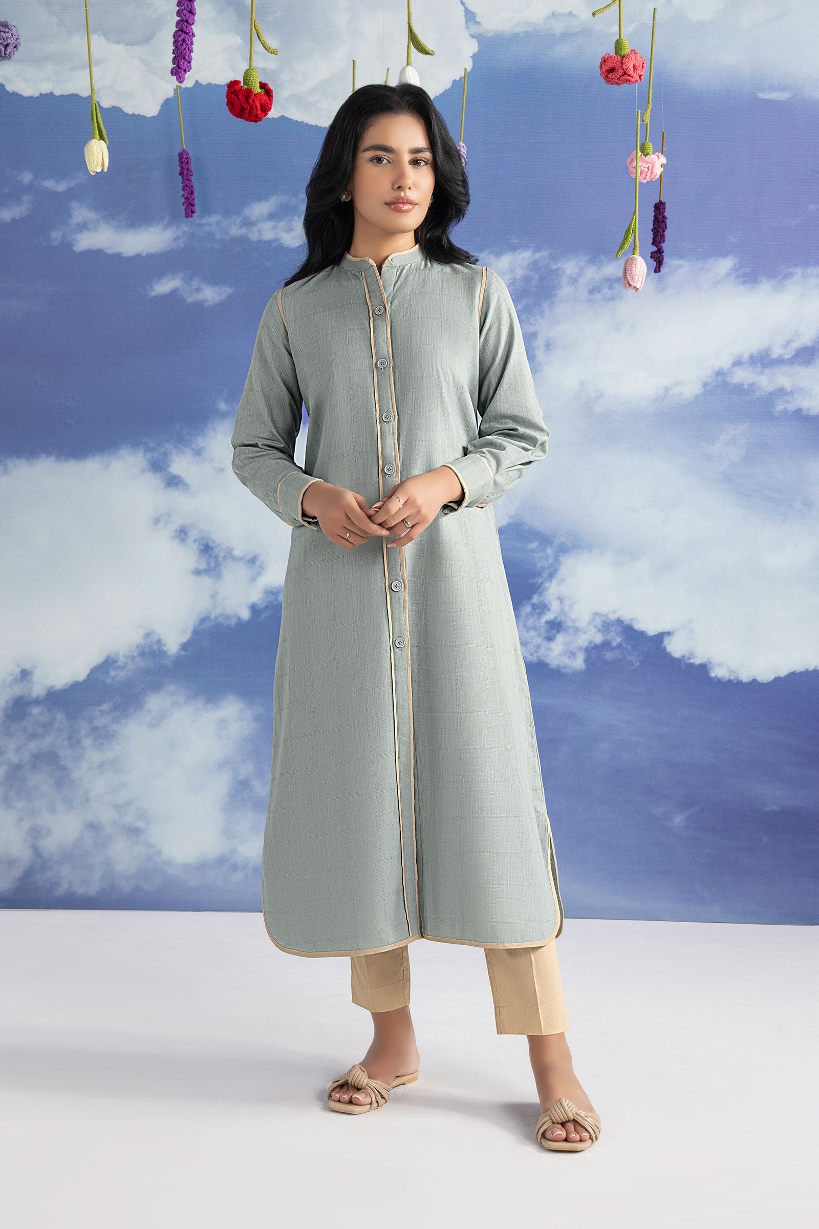 Front Open Button-Down Shirt Band Collar Neckline With Binding Detailing Color: Greyish Blue Fabric: Textured Fit: Regular Occasion: Daily Casual Model is wearing xs size Note: Dry Clean Only