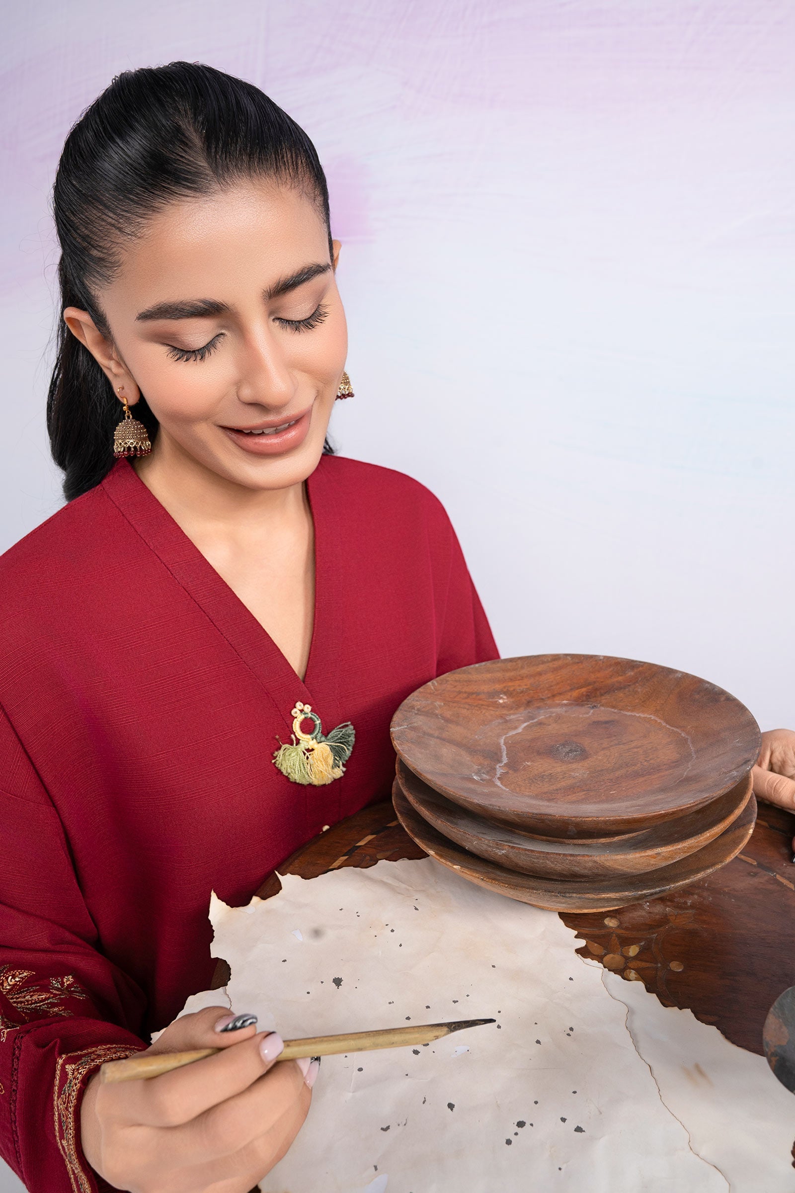 ShirtStraight-Cut ShirtKashmiri Neckline With Tassels DetailingEmbroidered BorderEmbroidered SleevesColor: MaroonFabric: Slub KhaddarFit: RegularTrouserStraight TrouserElasticated WaistbandColor: MaroonFabric: Slub KhaddarFit: RegularModel is wearing xs sizeNote: Dry Clean Only