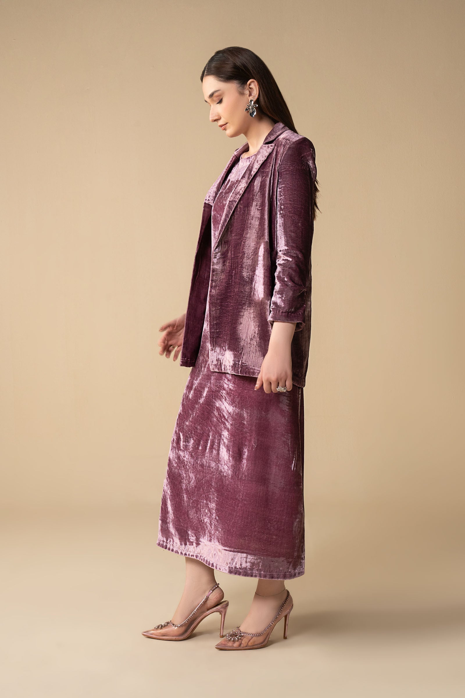 JacketDyed JacketNotch Collar NecklinePleated Collar SleevesColor: LilacFabric: VelvetFit: RegularUnderdressDyed Sleeveless UnderdressV NecklineColor: LilacFabric: VelvetFit: RegularModel is wearing xs sizeNote: Dry clean only