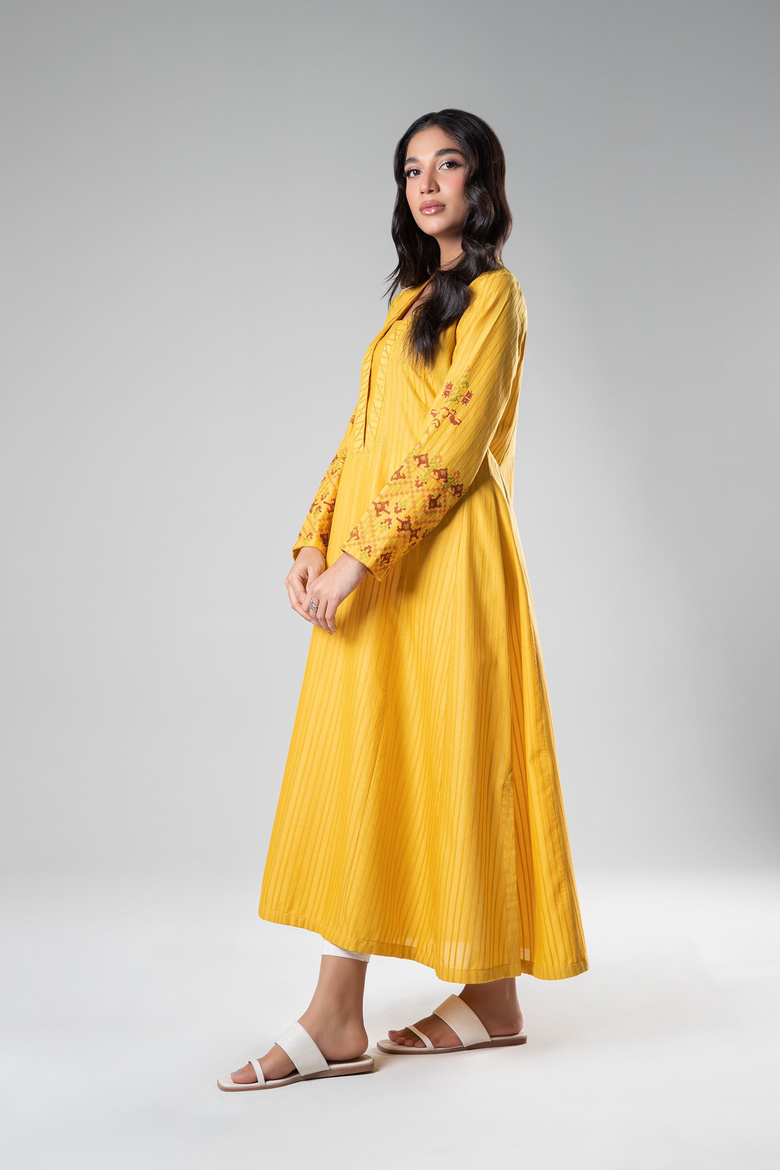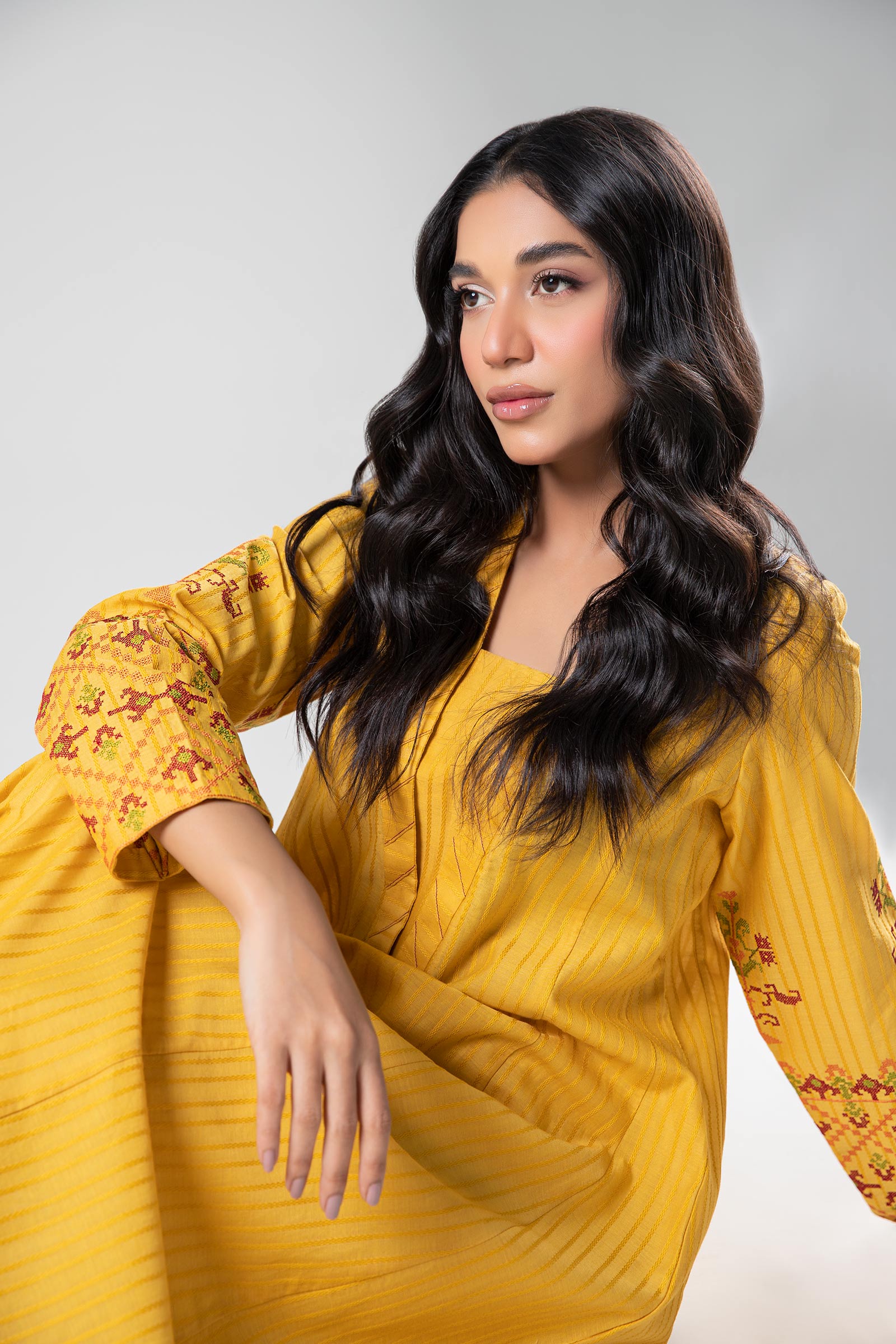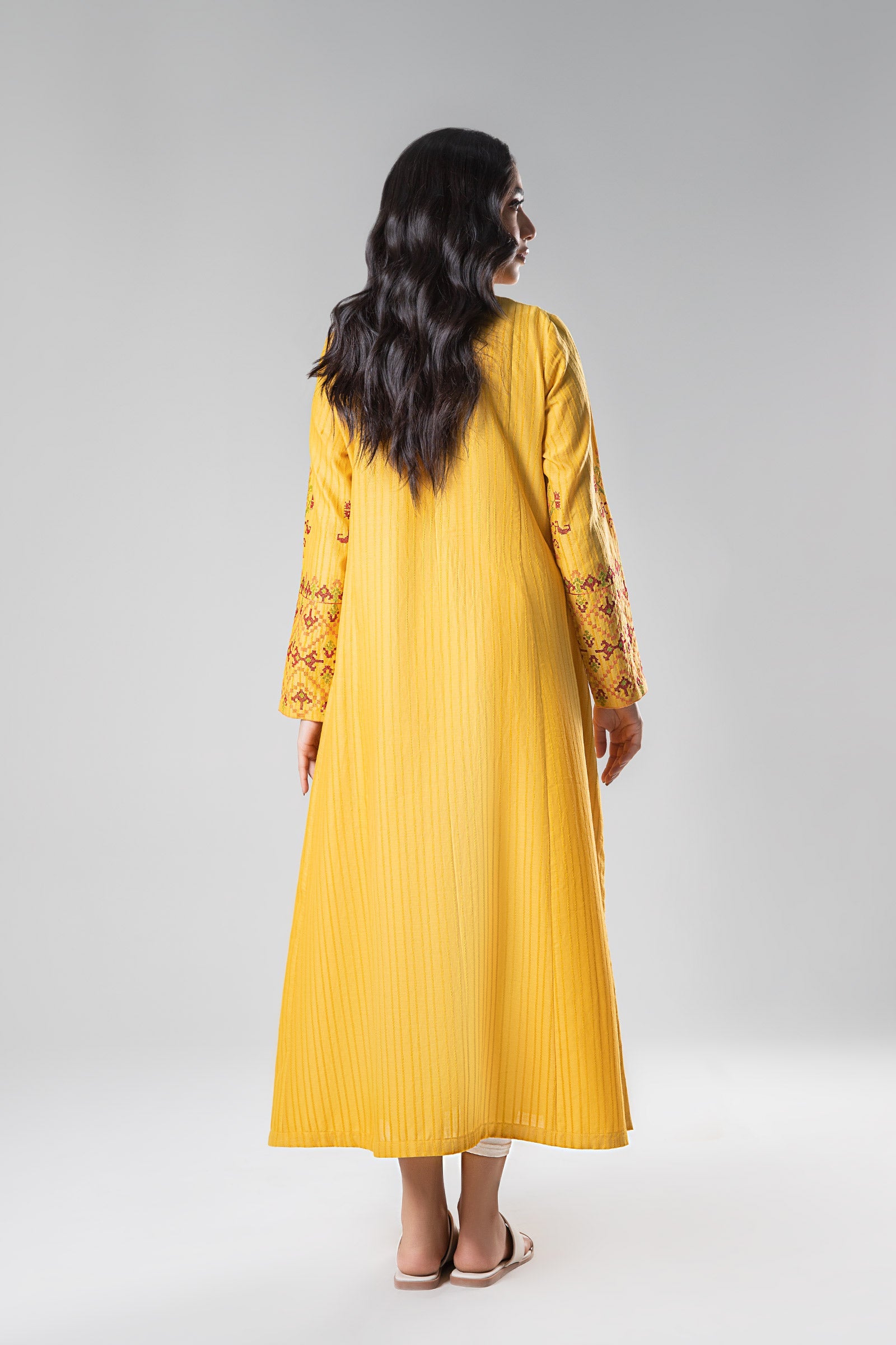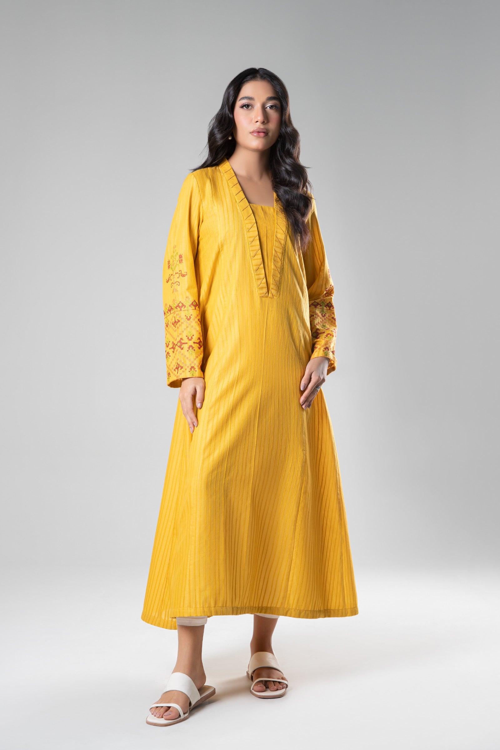 Dyed A-Line Panel Shirt Full Sleeves With Thread Embroidery & Beads Detailing Color: Mustard Fabric: Textured Fit: Regular Model is wearing size xs Note: Dry Clean Only