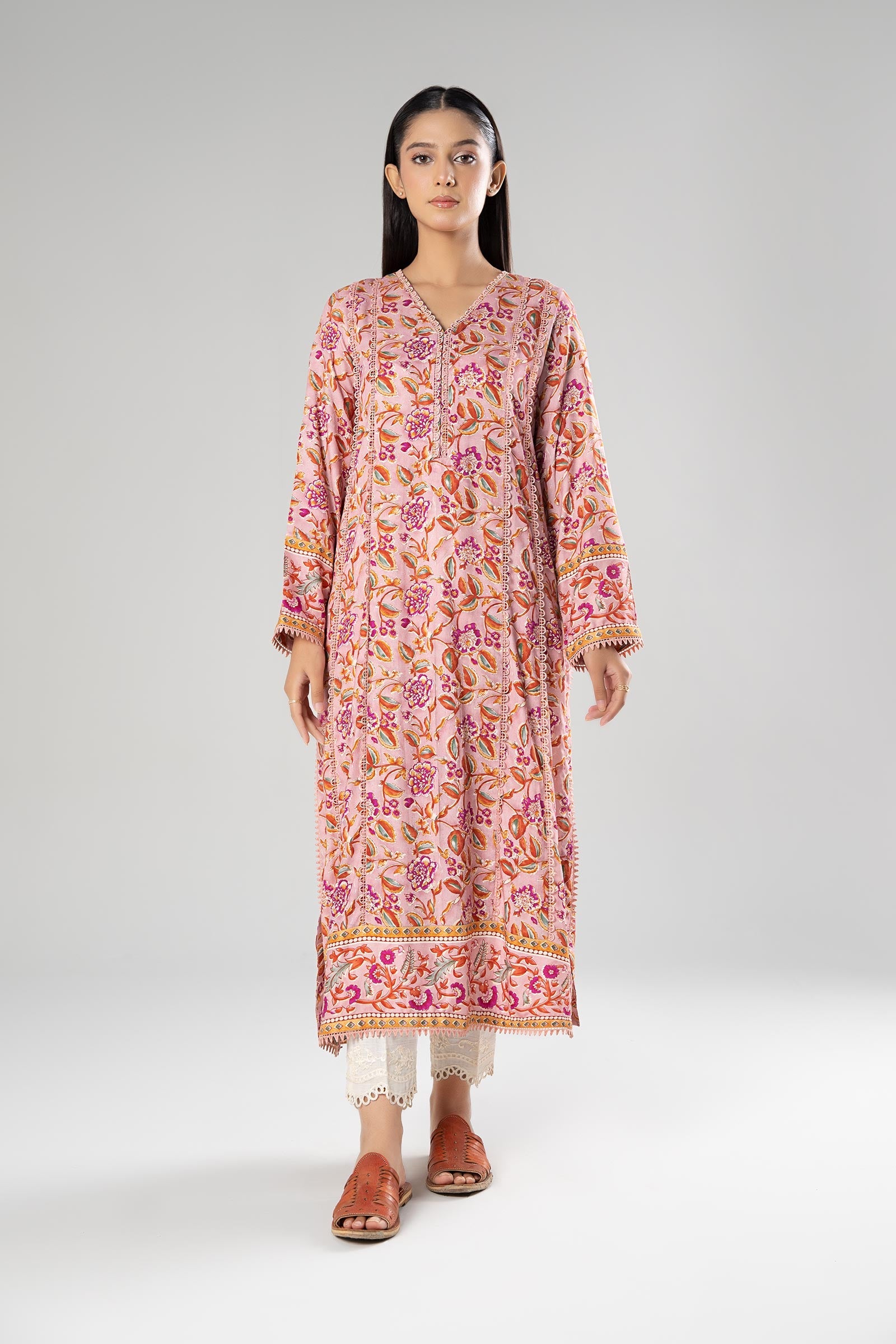Straight Panel ShirtPrinted Front With Lace DetailingV NecklineFull SleevesPrinted BackColor: PinkFabric: HerringboneFit: RegularModel is wearing size xsNote: Dry Clean Only