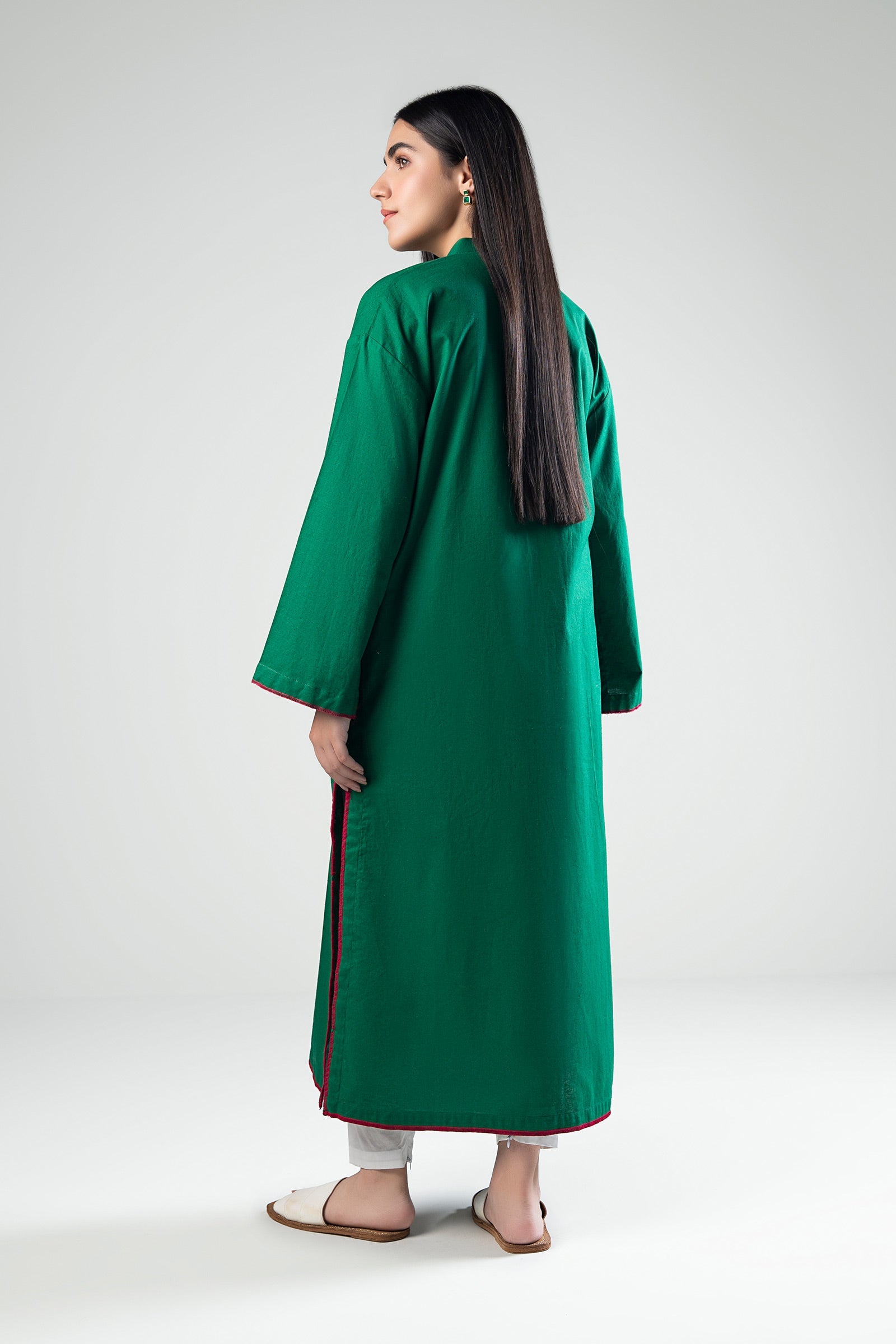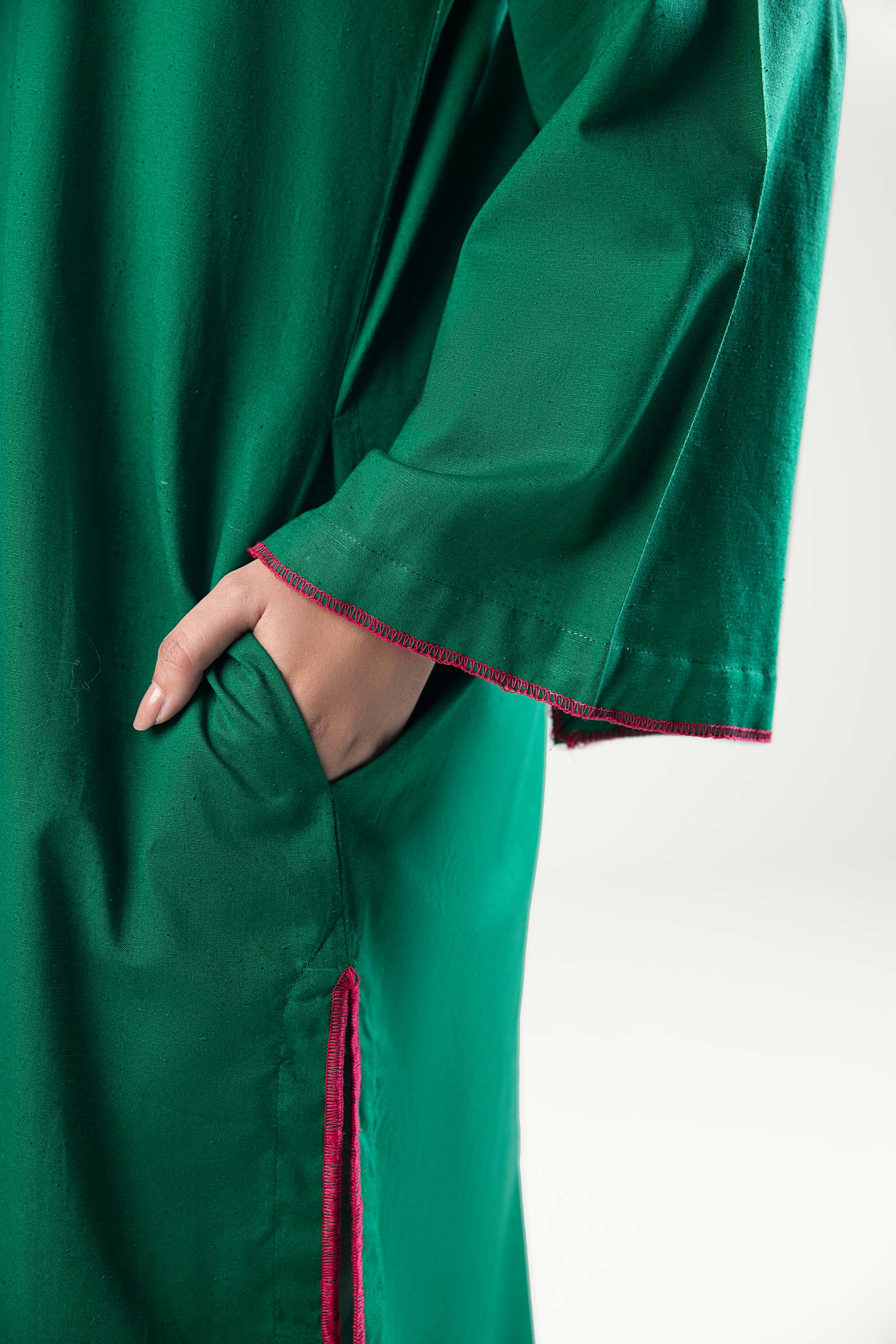 Dyed Straight Fit Shirt Band Collar Neckline With Bold Tassels Full Sleeves With Stitch Detailing Stitch Detailing On Hem Color: Green Fabric: Yarn Dyed Fit: Regular Model is wearing size xs Note: Dry Clean Only