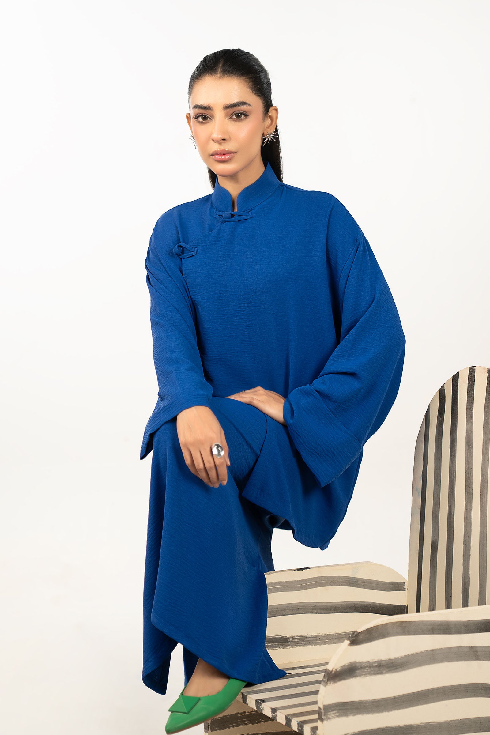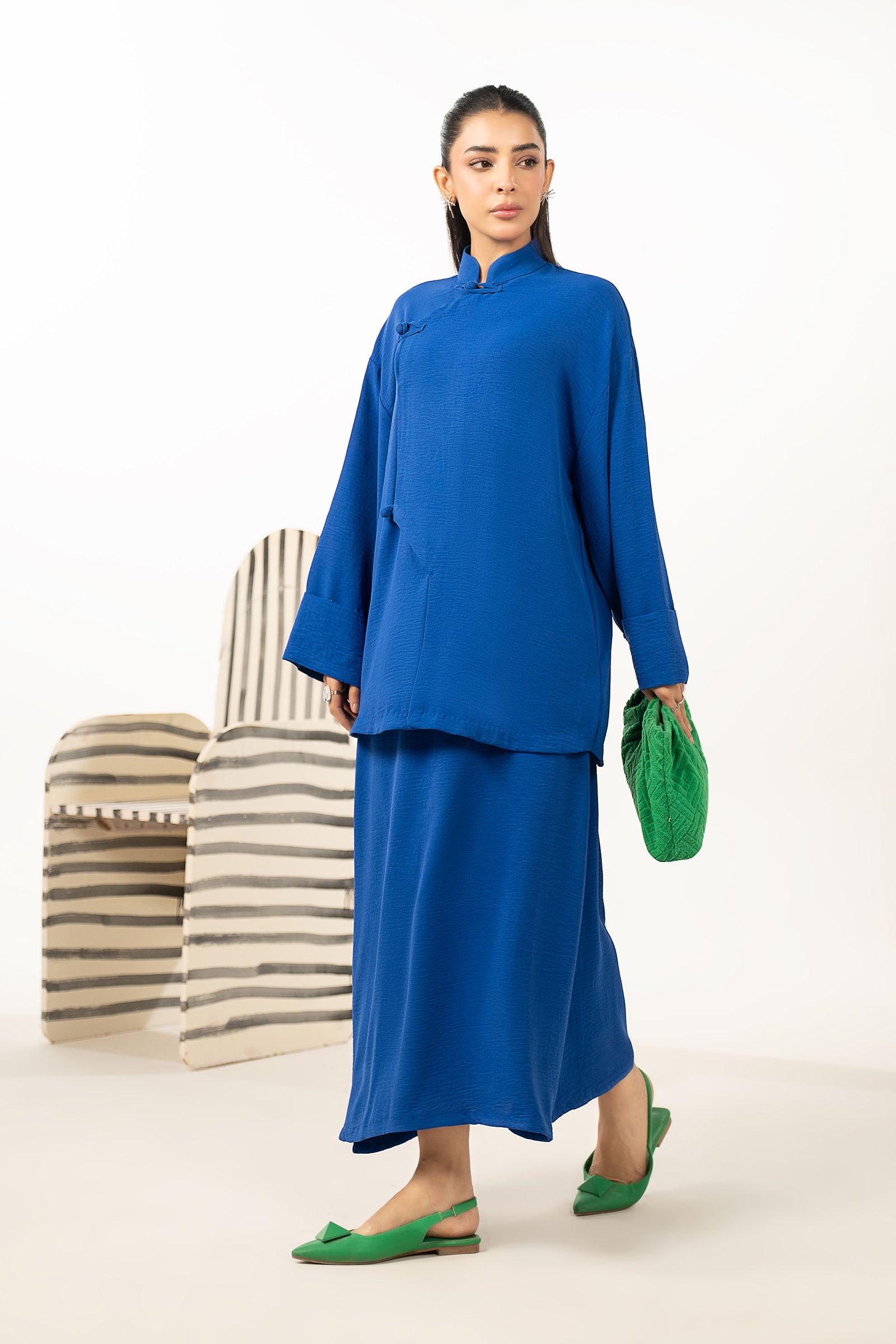 JacketAsymmetrical JacketFull-Length Regular SleevesColor: BlueFabric: Poly ViscoseSkirtRegular SkirtColor: BlueFabric: Poly ViscoseModel is wearing xs sizeNote: Dry Clean Only