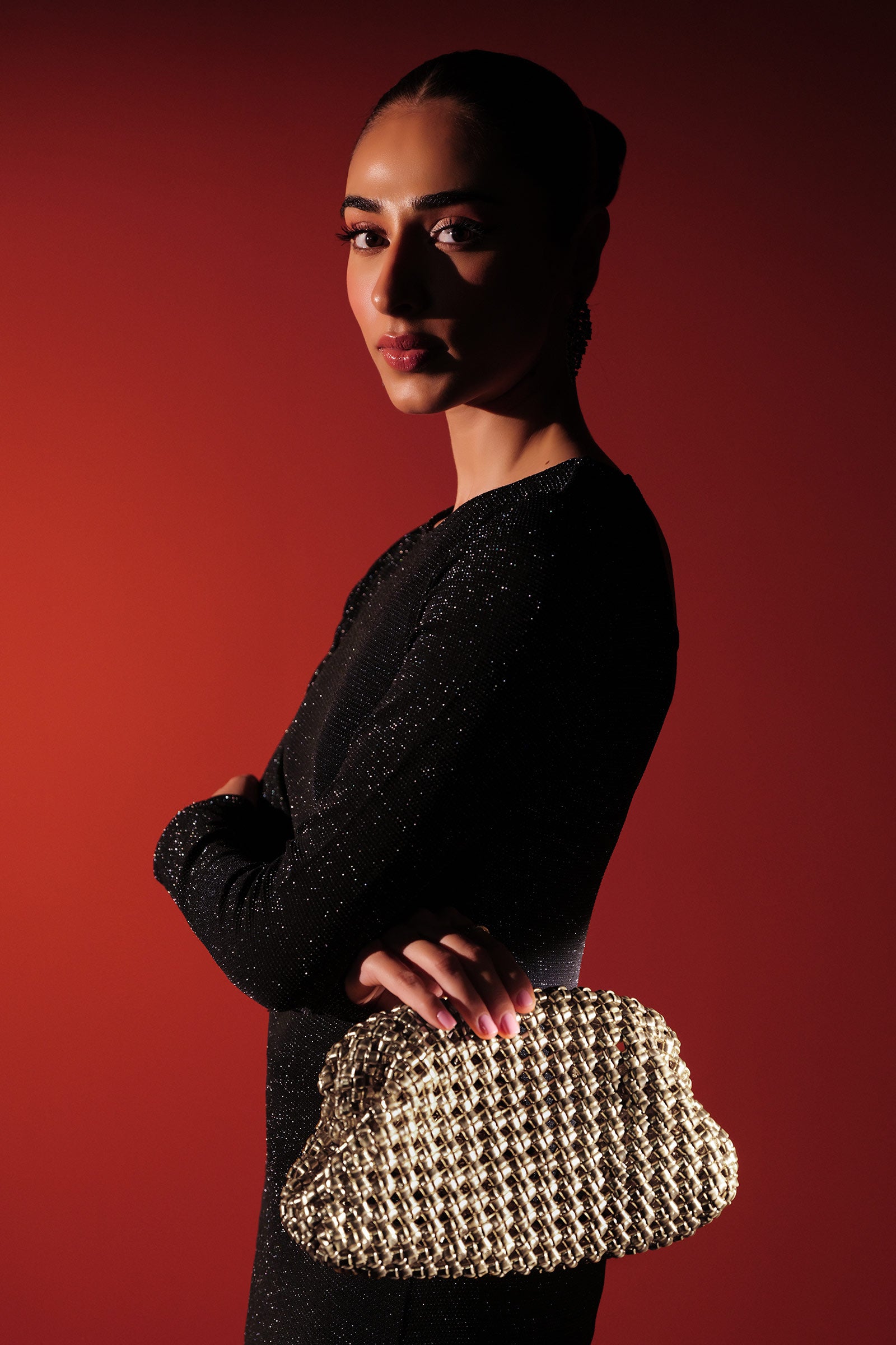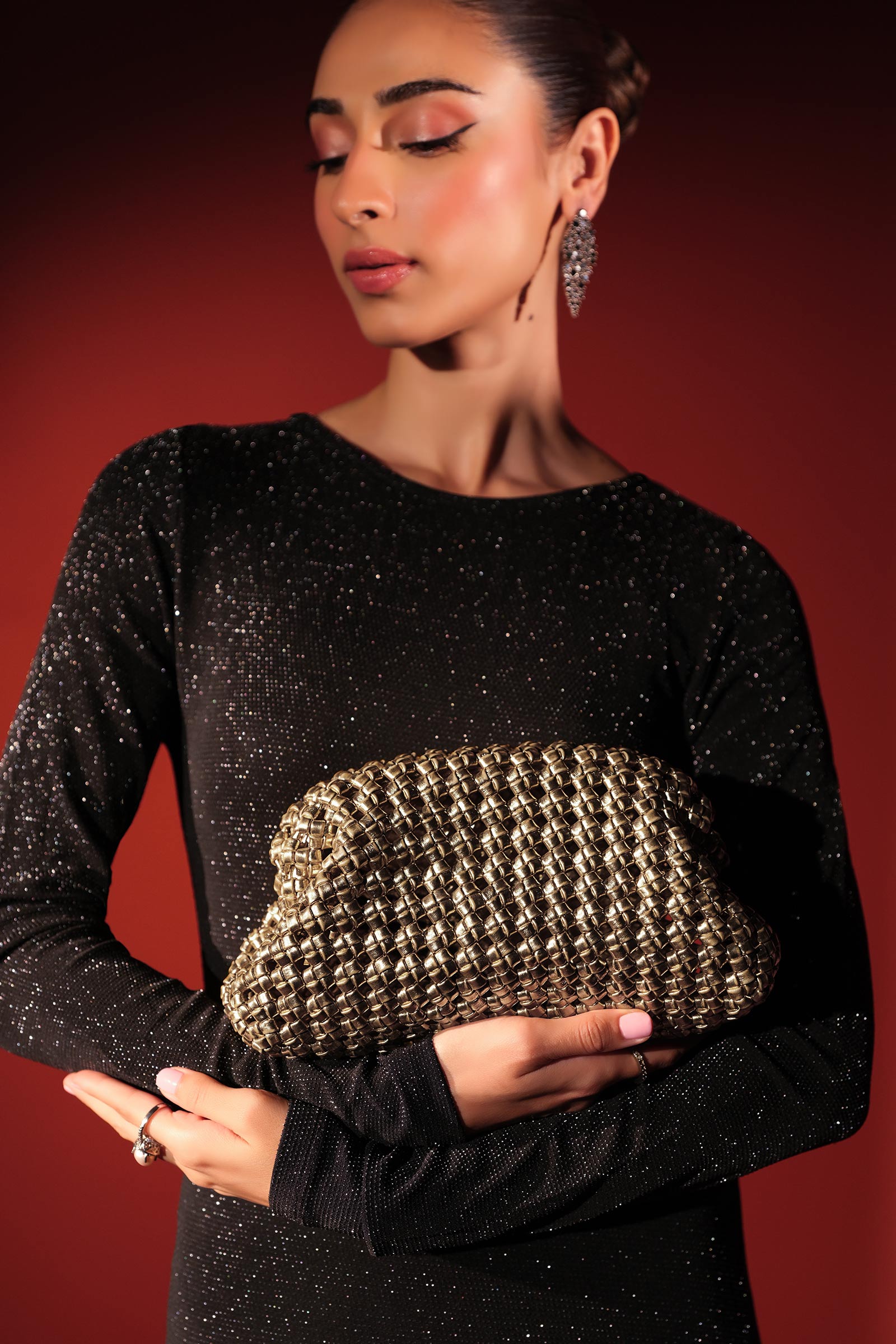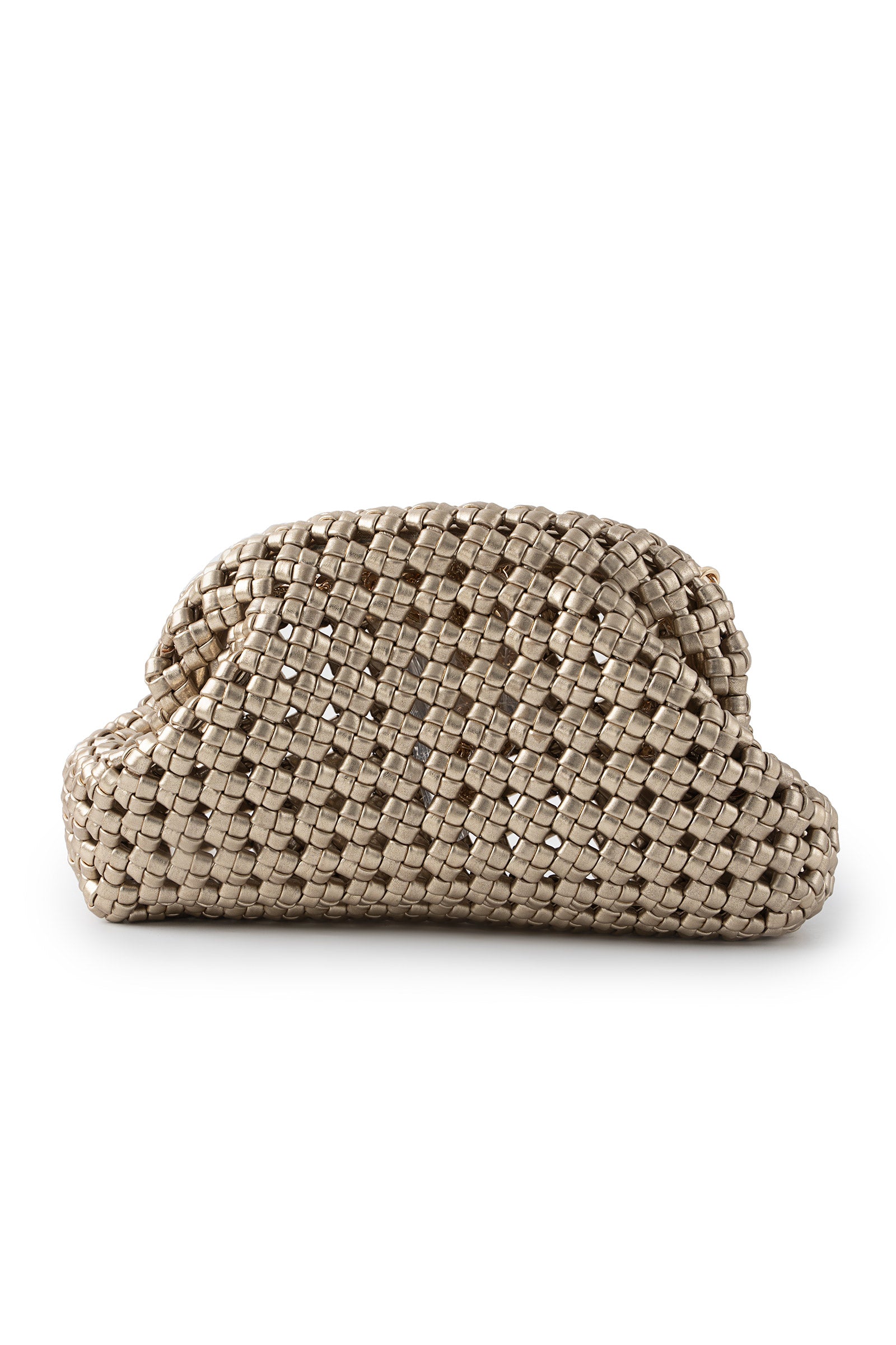 Style: Clutch Bag Details Metallic Woven Exterior Frame & Magnetic Snap Fastening Single Compartment Material: Leather Hardware: Gold-Tone Color: Dull Gold Dimensions: 11"W X 5.1”H X 3”D Care Instructions Wipe With Dry Cloth Do Not Expose To Extreme Heat