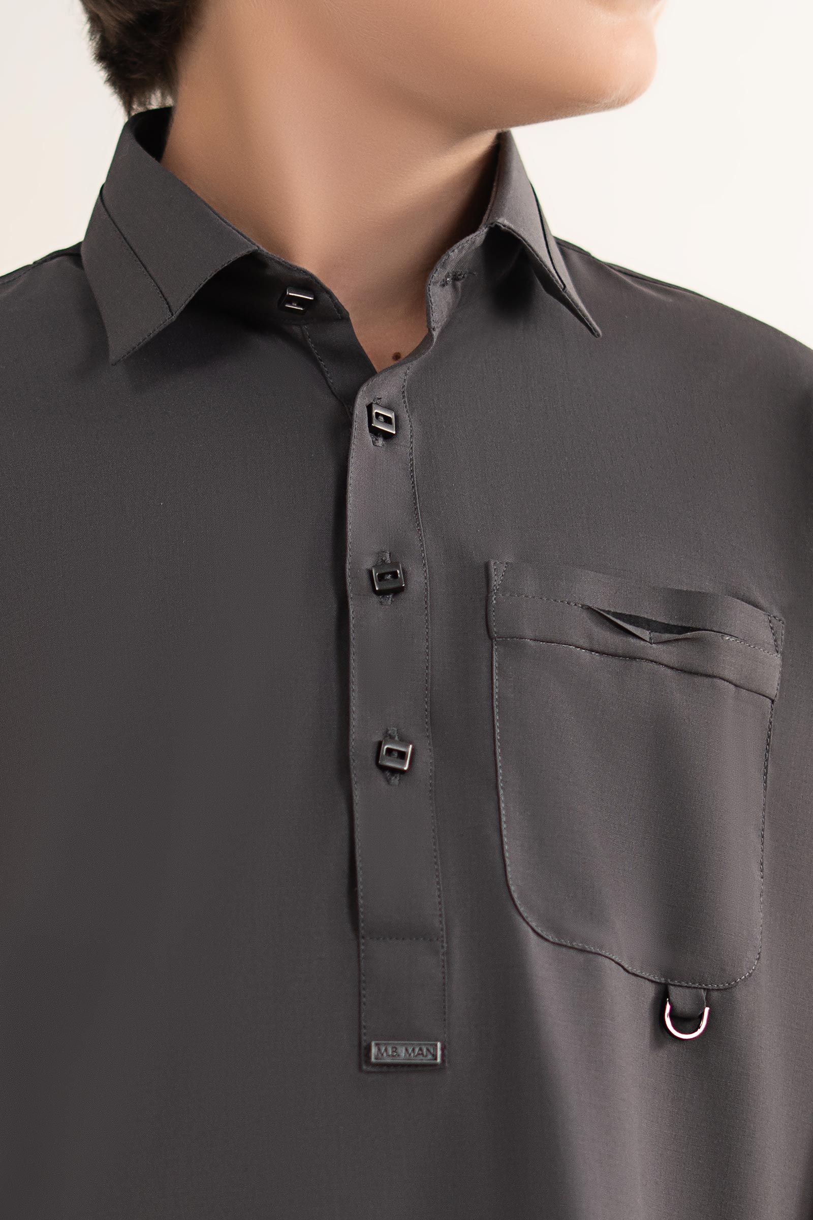 KurtaCollar Neckline With Cut & Sew Detailing Front patch Pocket With Cut & Sew DetailingMetal Logo Pin On FrontOne Side PocketStraight HemRound Cuffed SleevesCut & Sew Detailing On BackShalwarRegular ShalwarColor: Cobalt GreyFit: RegularWear Type: FormalFabric: BlendedModel is wearing medium sizeNote: Dry Clean Only