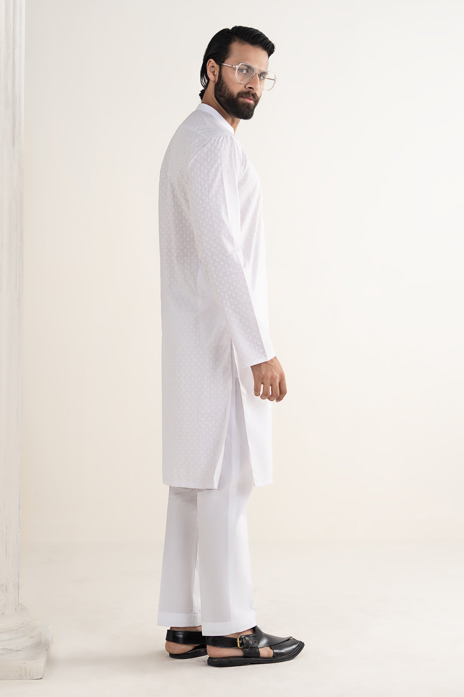 Printed Kurta Straight Band Collar Neckline Metal Logo Pin On Front One Side Pocket Straight Hem Open Sleeves With Loop Button Detailing Color: Brilliant White Fit: Regular Wear Type: Festive Fabric: Blended Model is wearing medium size Note: Dry Clean Only