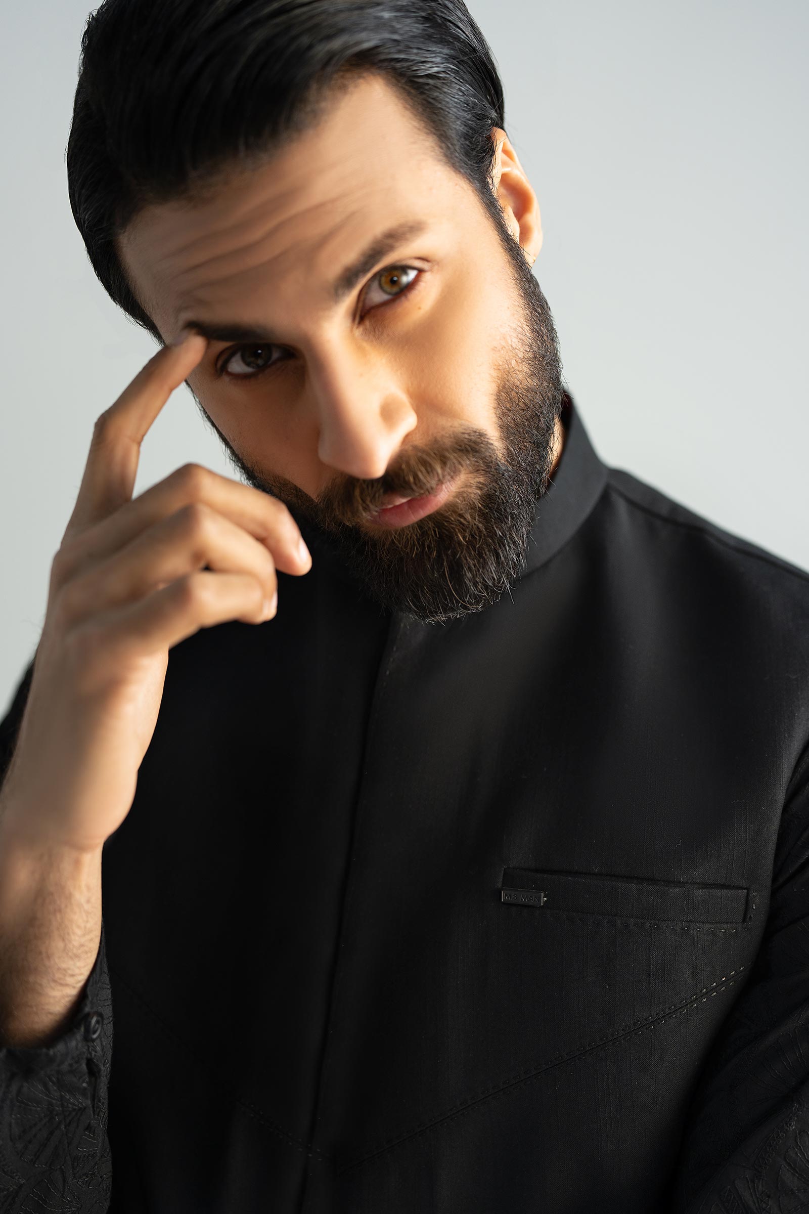 Straight Band Collar Neck Hidden Placket With Self Buttons Cut & Sew Detail On Front Panels Saddle Stitch On Front Panels Signature Pin On Front Bone Pocket 3 Bone Pockets On Front Straight Hem With Cut Contrast Lining Color: Black Fit: Regular Wear Type: Formal Fabric: Blended Tropical Model is wearing medium size Note: Dry Clean Only
