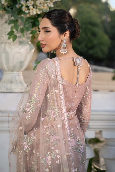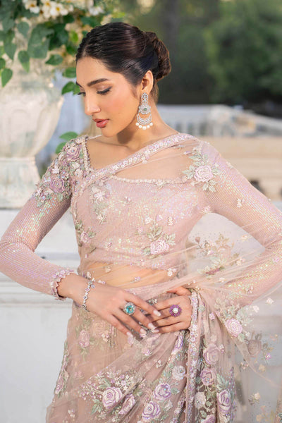 The Ethereal Bloom - Drape yourself in sheer elegance with our delicately embroidered net saree. It is a whisper of luxury, hand-embellished with captivating 3D floral appliqués and scattered with luminous pearls. A truly enchanting piece for an everlasting look.