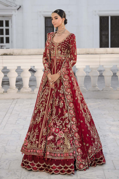 The Shikargah Regalia - Our deep red organza pishwas floats above a raw silk lehenga. Lavishly detailed with mirror work, 3D floral work, shimmering dabka-naqshi and glistening pearl details, this piece is pure passion. Completed with an elegantly draped net dupatta for a truely opulent look.