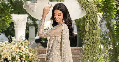 The mirror shimmer. Step into the spotlight with this magnificent Gharara Set. Cascading fabric is illuminated by brilliant sheesha (mirror work) and sparkling crystals. Intricate dabka-naqshi and delicate net florets add depth to the gotta work, creating a piece that moves as beautifully as you do.