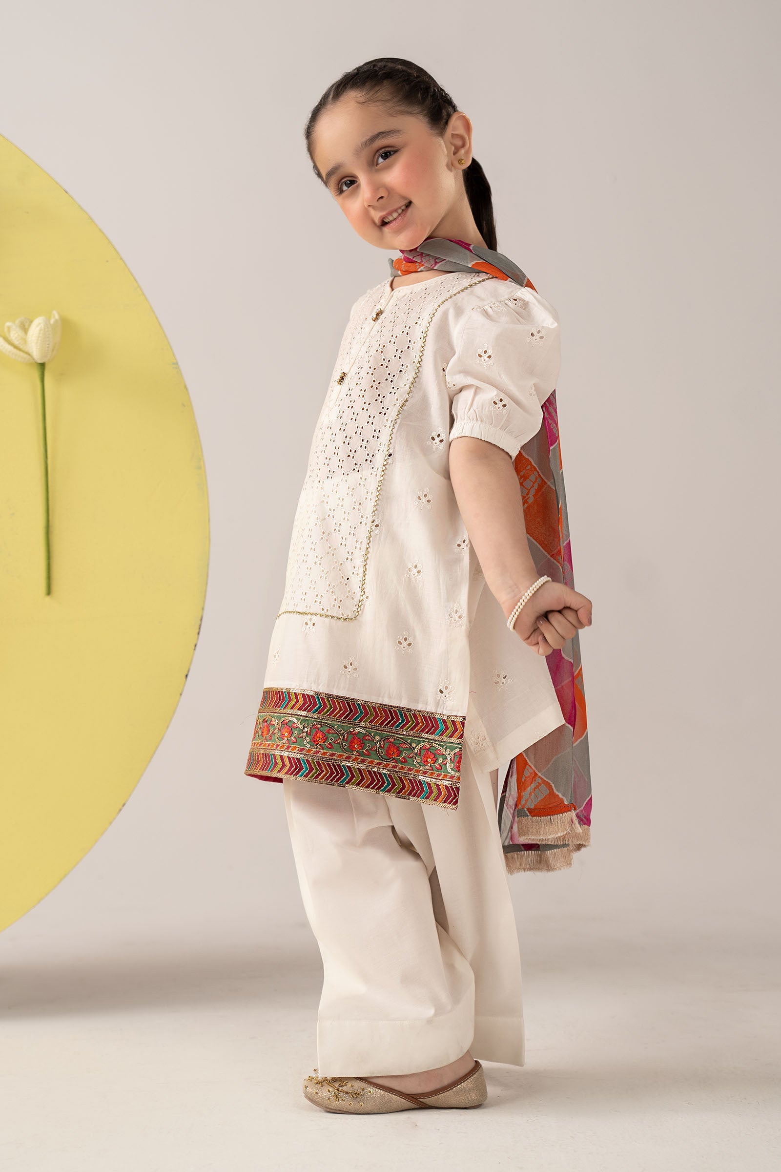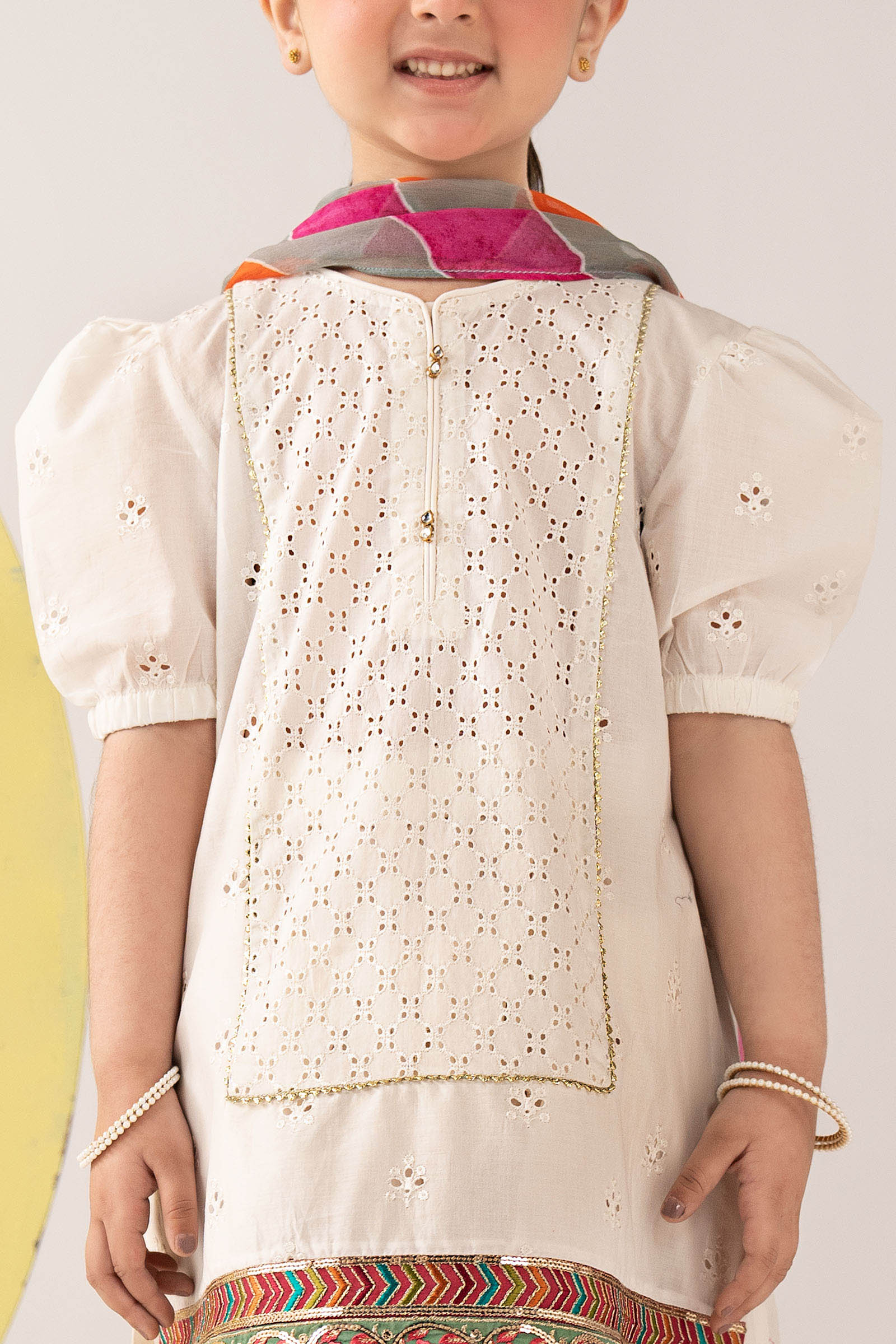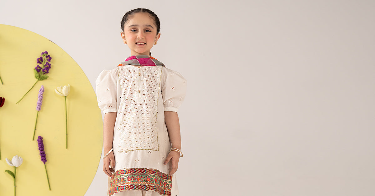 ShirtStraight Cut ShirtRound Schiffli Embroidered Neckline With Pearl Tassel & Gotta Lace DetailingDyed Front With Schiffli EmbroideryEmbroidered BorderHalf Schiffli Embroidered Puff SleevesDyed Back With Schiffli EmbroideryFit: RegularColor: WhiteFabric: CambricTrousersDyed ShalwarElasticated WaistbandFit: RegularColor: WhiteFabric: CambricDupatta Tie & Dyed DupattaKiran Lace Detailing On BorderColor: MultiFabric: ChiffonWork Details: Seqioms, Tilla & Thread EmbroideryModel is wearing 6-8 sizeNote: Dry Clean Only