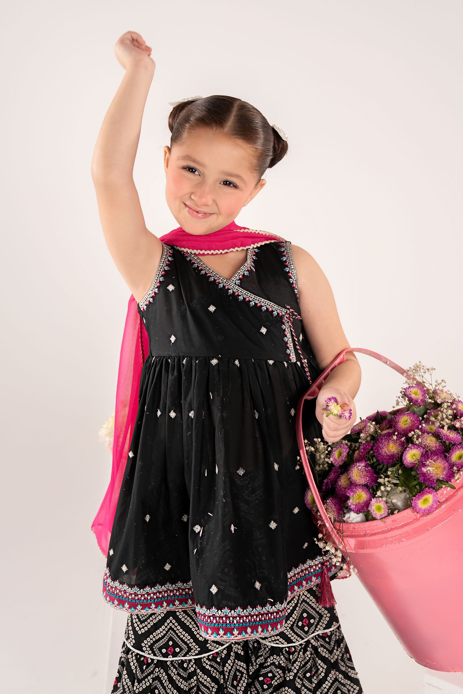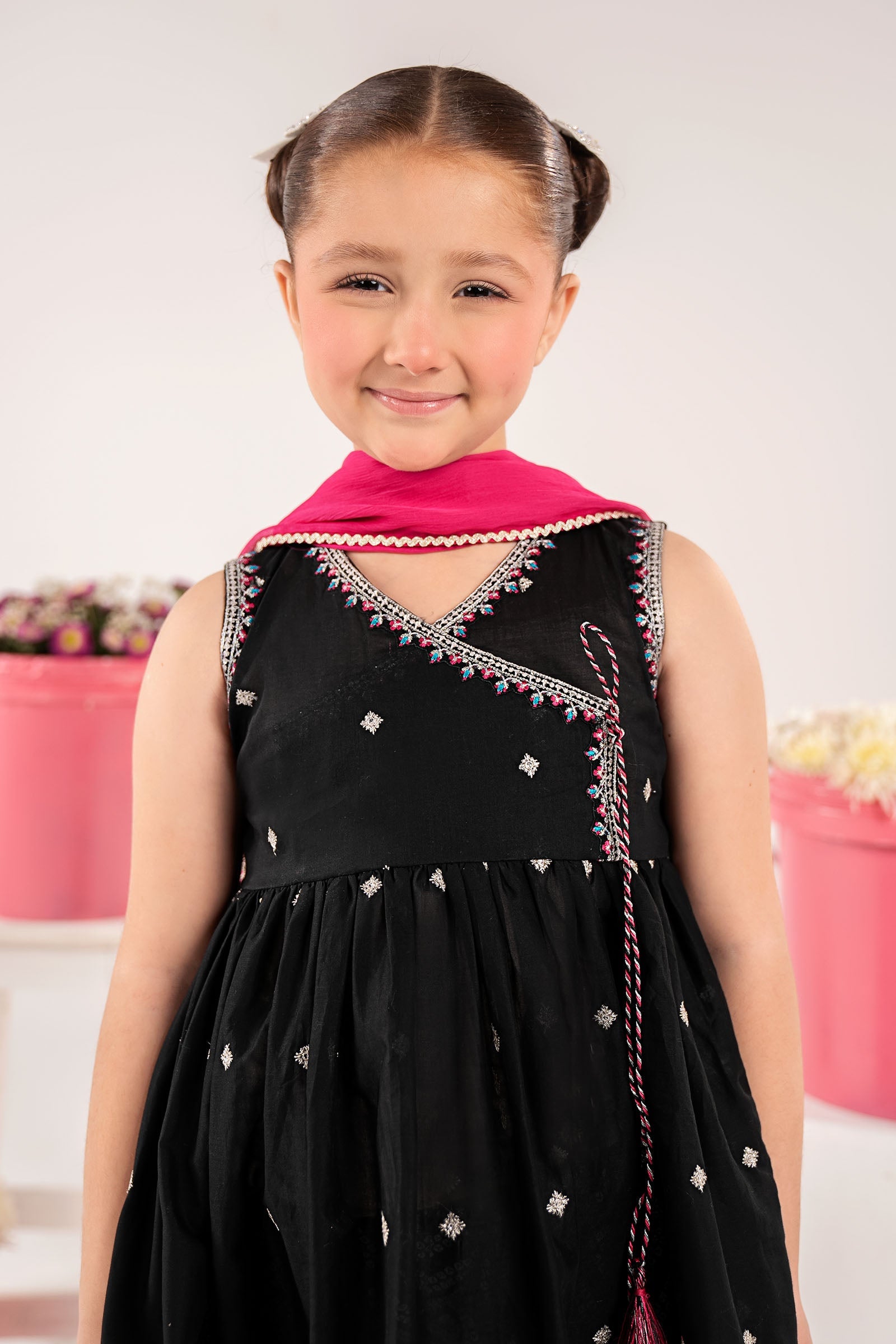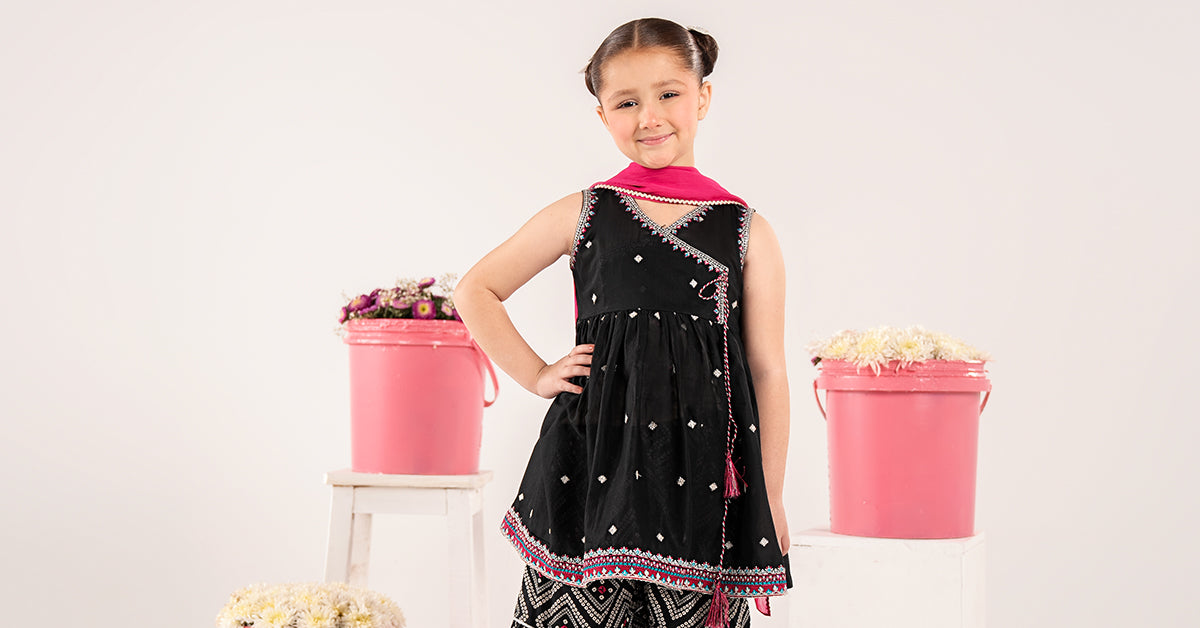 AngrakhaSleeveless Spray Embroidered AngrakhaEmbroidered Neckline With Tassel DetailingEmbroidered ArmholeEmbroidered Border With Gotta Lace DetailingColor: BlackFabric: LawnGhararaPrinted Three-Tier Gharara With Gotta Lace DetailingElasticated WaistbandColor: BlackFabric: CambricDupattaSolid DupattaFour-Side Gotta-Laced BorderColor: PinkFabric: ChiffonWork Details: Sequin, Tilla & Thread EmbroideryModel is wearing 6-8 sizeDisclaimer: Separate sleeves included.Note: Dry Clean Only