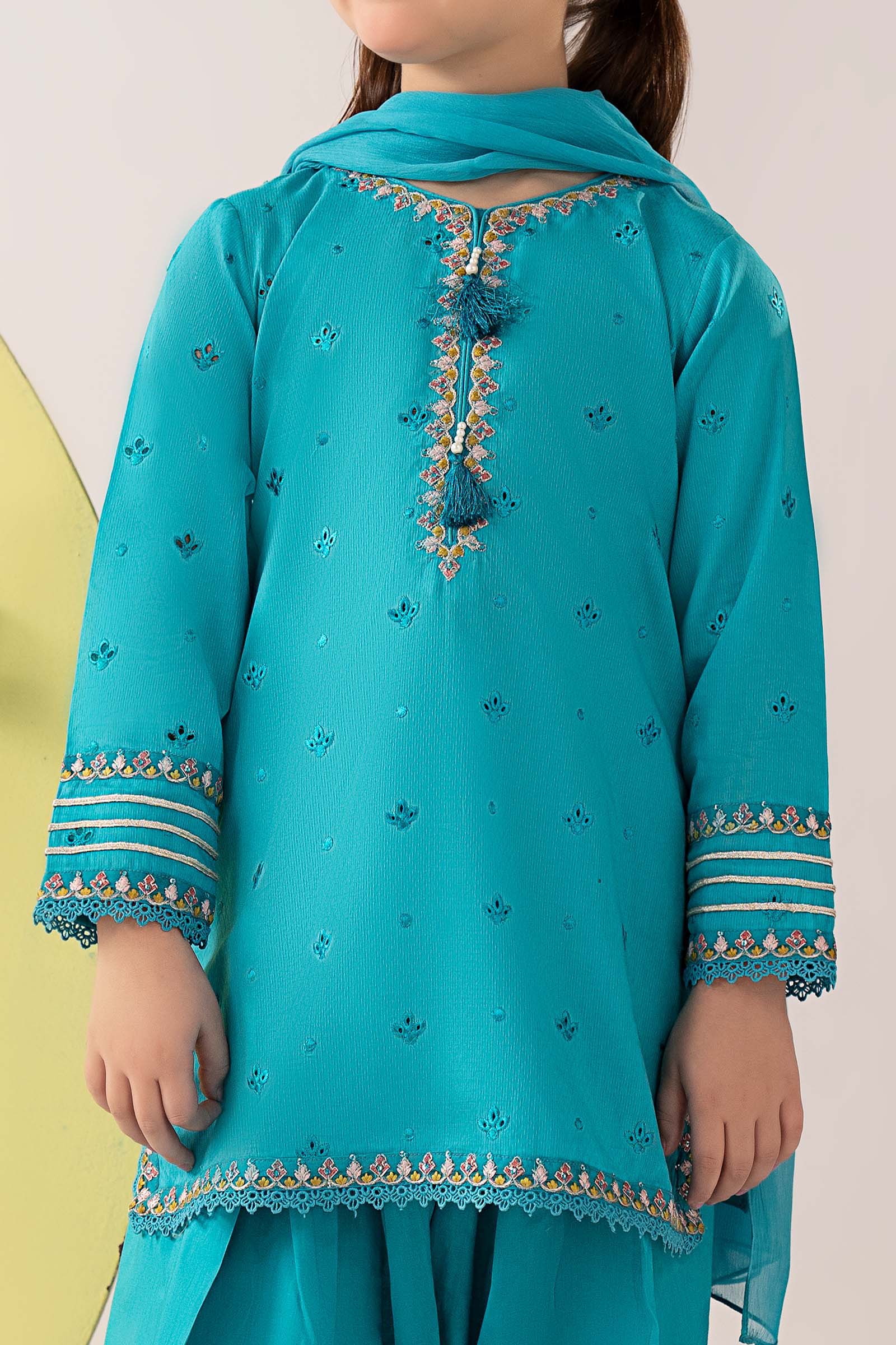 ShirtEmbroidered ShirtEmbroidered Neck With Tassel-Buttons DetailingEmbroidered Side Seams & BorderEmbroidered Sleeves With Gotta Lace DetailingLace Detailing On Side Seams, Border & SleevesColor: BlueFabric: Dobby LawnShalwar Solid ShalwarElasticated WaistbandEmbroidered HemColor: BlueFabric: CambricDupattaSolid DupattaColor: BlueFabric: ChiffonModel is wearing 6-8 sizeNote: Dry Clean Only