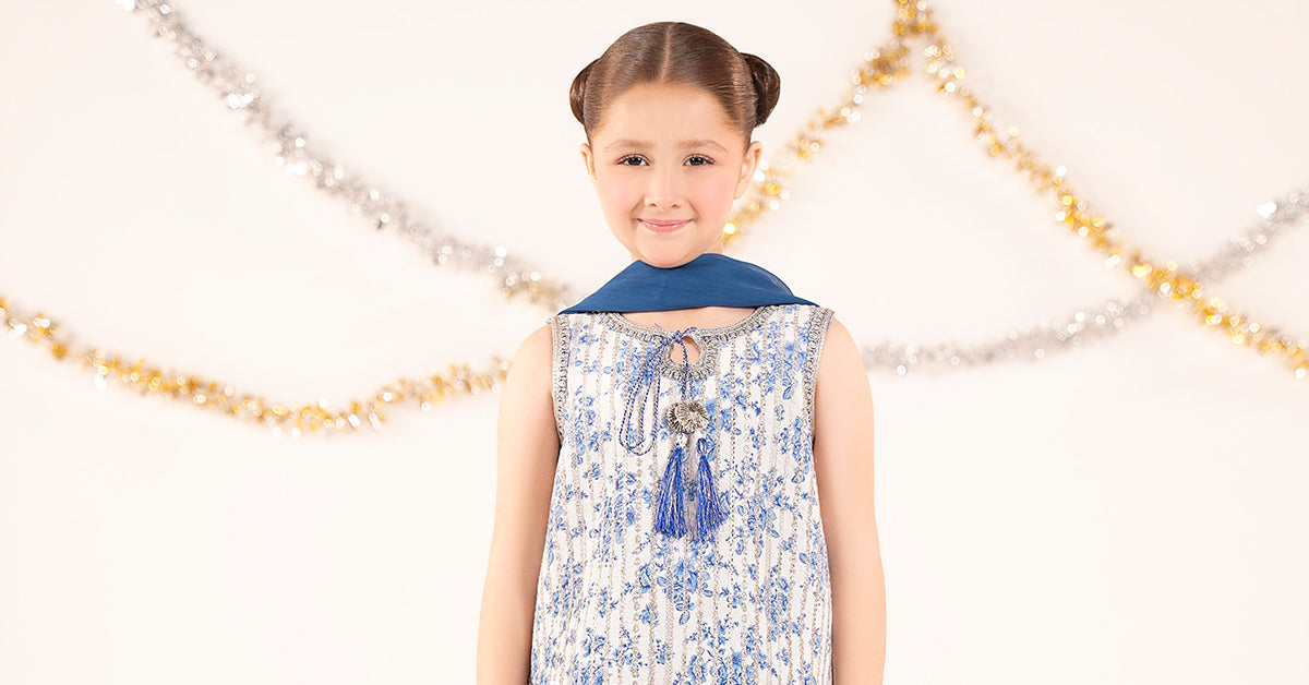 ShirtSleeveless Printed Shirt With EmbroideryEmbroidered Neckline With Tassel DetailingEmbroidered Armhole, Side Seams & BorderGotta Ball Drops On BorderColor: BlueFabric: Raw SilkTrouserPrinted PlazoElasticated WaistbandEmbroidered HemColor: BlueFabric: Raw SilkDupattaSolid DupattaFour-Side Gotta-Laced BorderColor: BlueFabric: ChiffonWork Details: Sequin, Tilla & Thread EmbroideryModel is wearing 6-8 sizeDisclaimer: Separate sleeves included.Note: Dry Clean Only