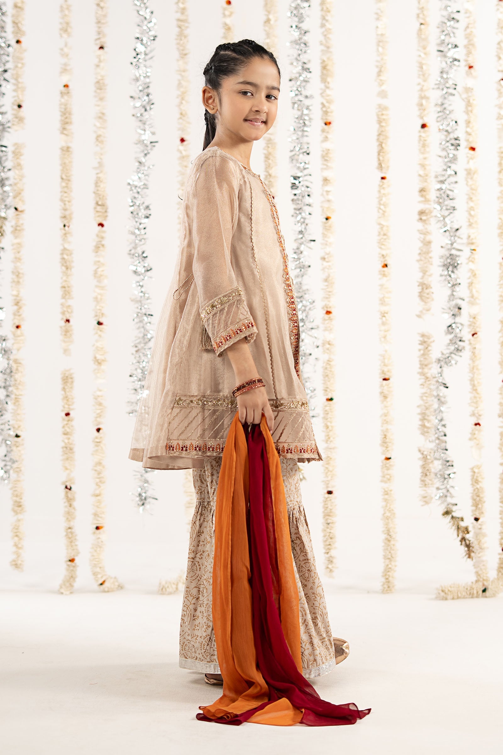 ShirtFront-Open ShirtEmbroidered NecklineEmbroidered Front-Open SlitGotta Lace On Front Panel BordersLoops & Tassel Detailing On Side SeamsEmbroidered Border With Gotta DetailingStraight Sleeves With Gotta Lace Embroidered BorderSleeveless Resham Cotton Undershirt (Attached)Color: WhiteFabric: Zari NetGhararaLurex Woven GhararaElasticated WaistbandEmbroidered BorderColor: WhiteFabric: Lurex JacquardDupattaSolid DupattaColor: Red And OrangeFabric: ChiffonWork Details: Sequin, Tilla & Thread EmbroideryModel is wearing 6-8 sizeNote: Dry Clean Only