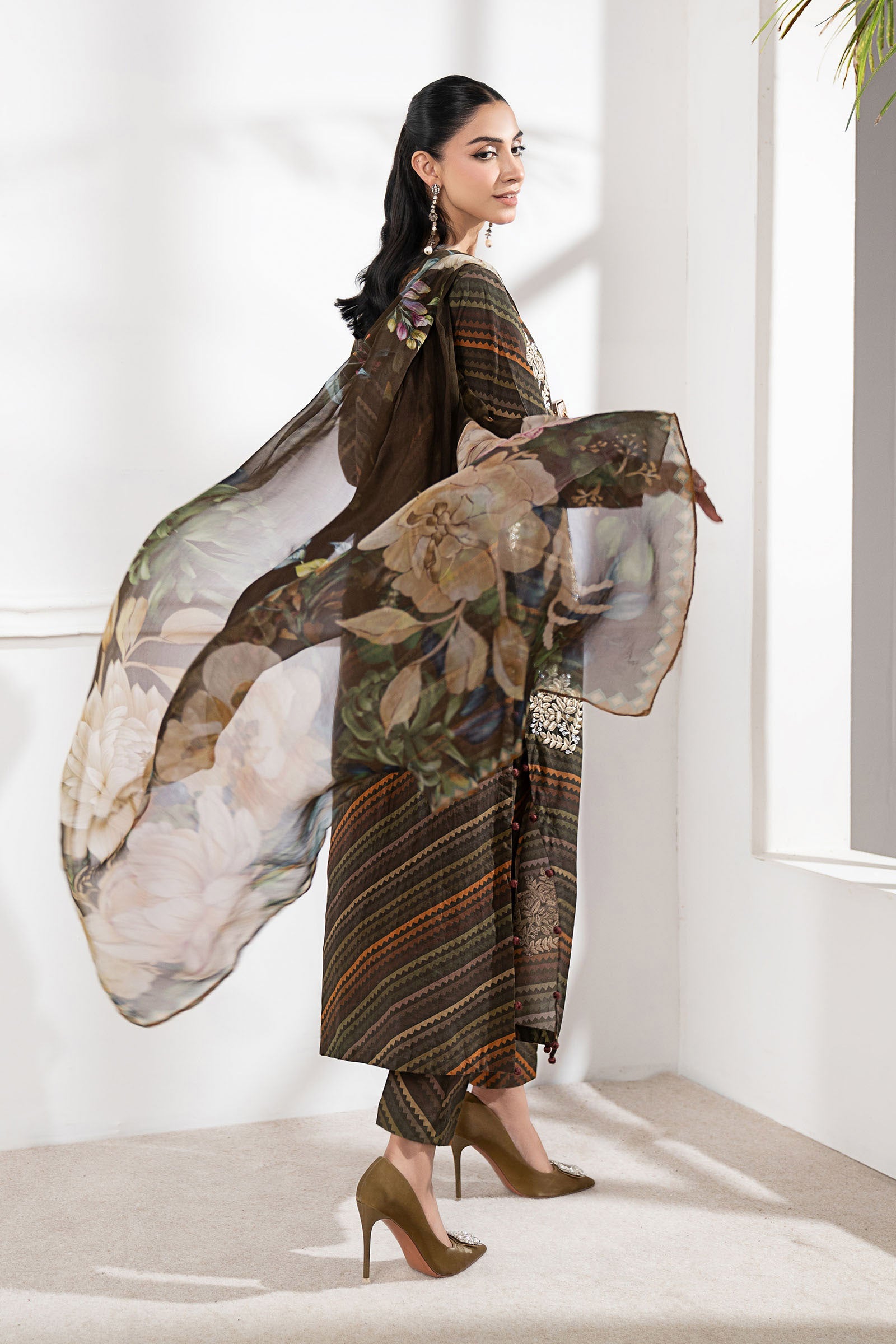 ShirtPrinted Embroidered ShirtRound Neckline With Balls & Button-Tassel DetailingStraight SleevesCrochet Balls Drop Detailing On Sleeves & BorderFabric: CambricColor: BrownTrouserPrinted Straight TrouserElasticated WaistbandFabric: CambricColor: BrownDupattaPrinted DupattaFabric: ChiffonColor: BrownNote: Dry Clean Only